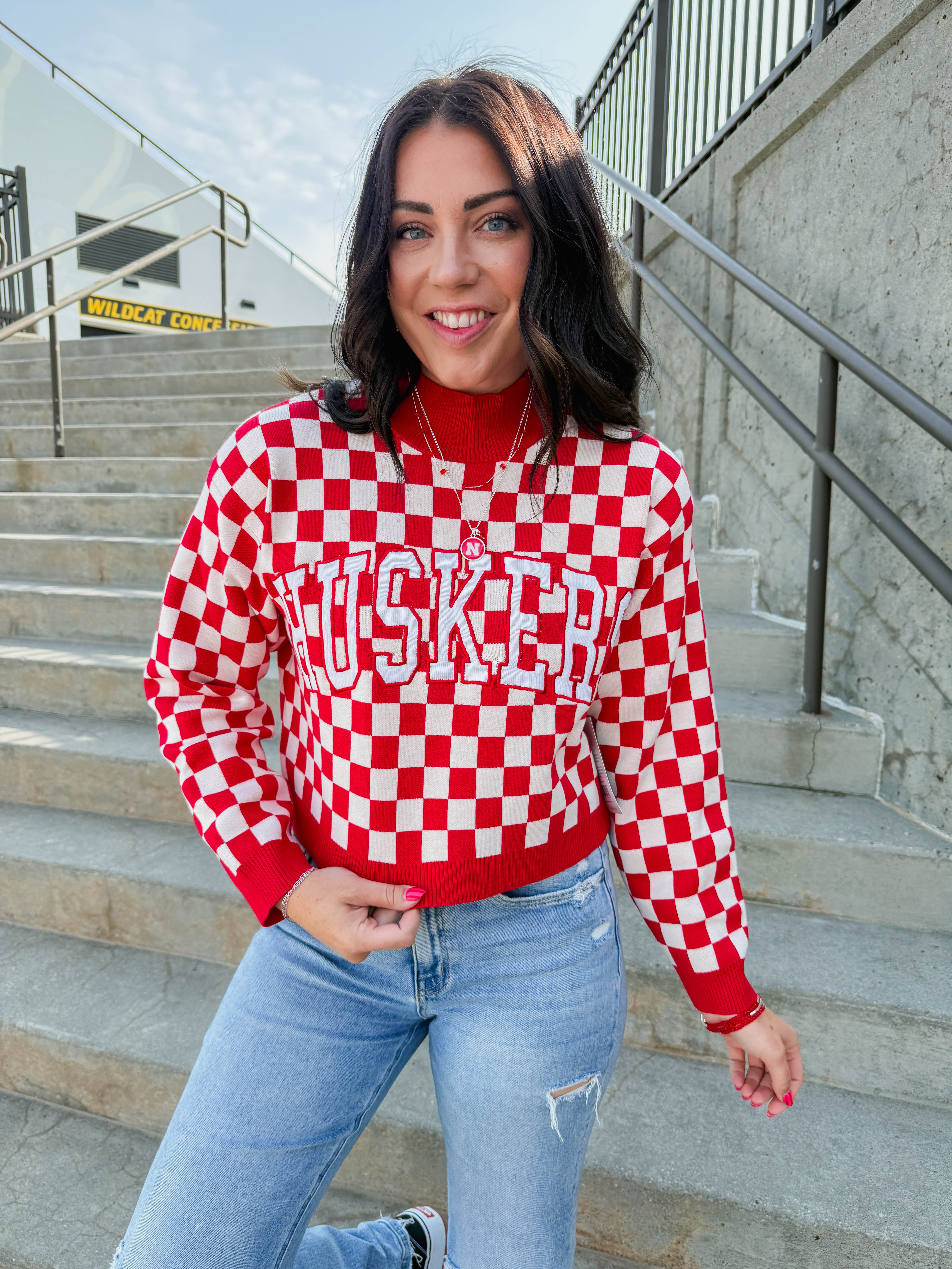 Stay cozy and stylish with the Nebraska Checkerboard Sweater! Featuring a fun checker print and Huskers graphic, this cropped sweater with a mock neckline and long sleeves is perfect for showing off your game day spirit in a cute, comfy way.