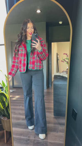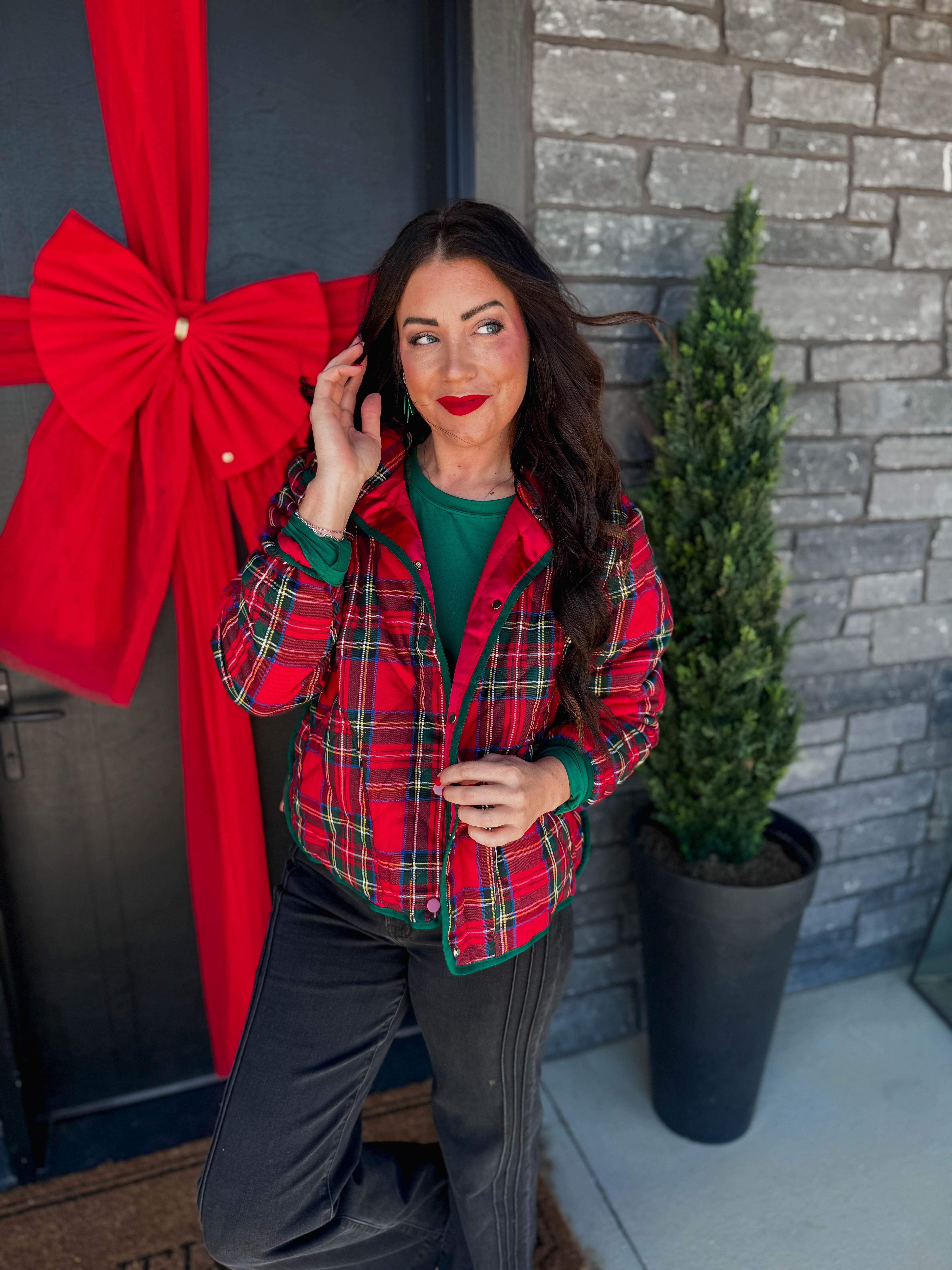 Keep warm and jolly in the Christin Plaid Quilted Jacket. With its classic Christmas plaid, cozy collar, and convenient side pockets, it’s the perfect festive layer for crisp fall and winter weather. Add a splash of holiday cheer to your look!