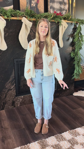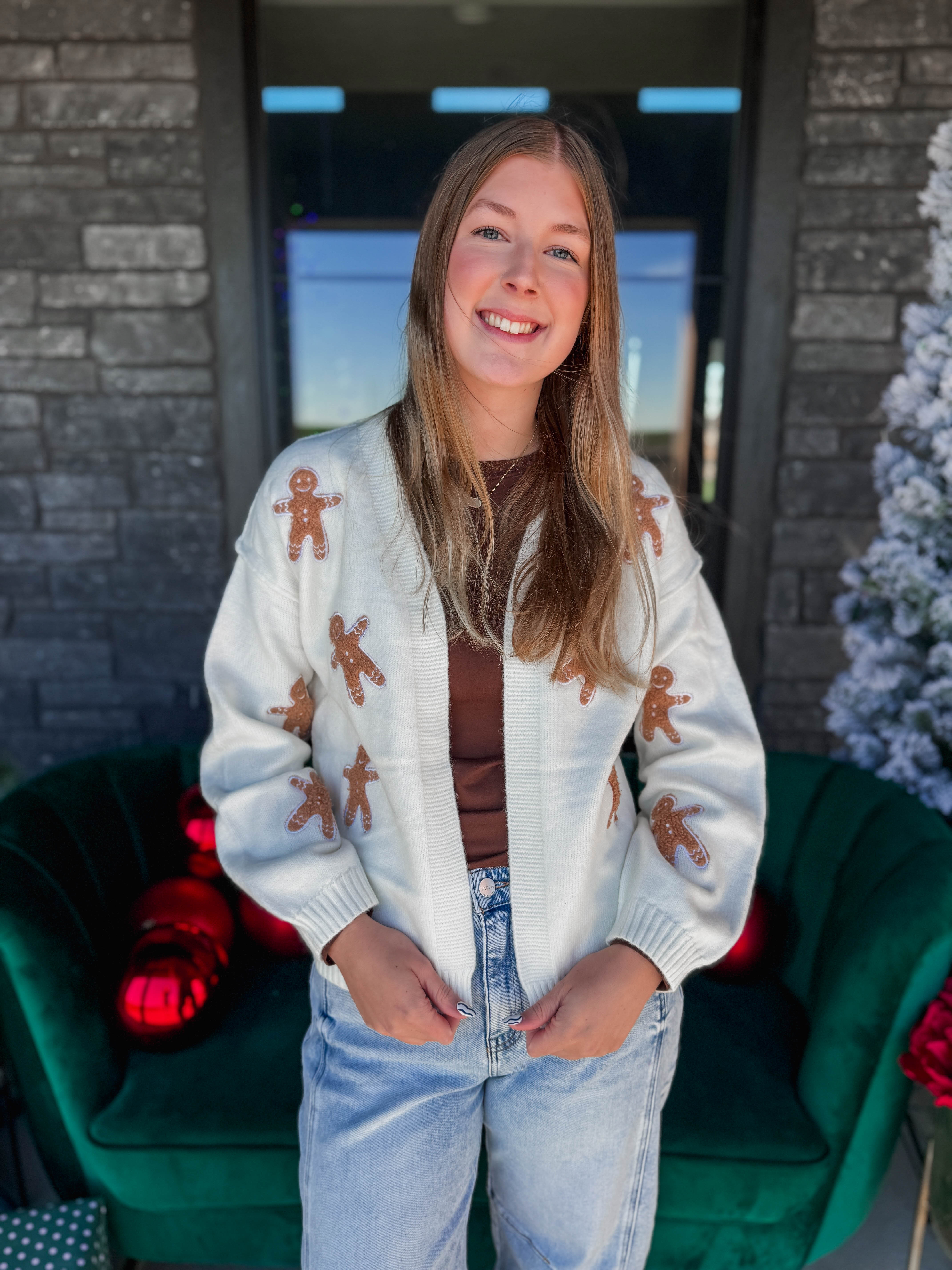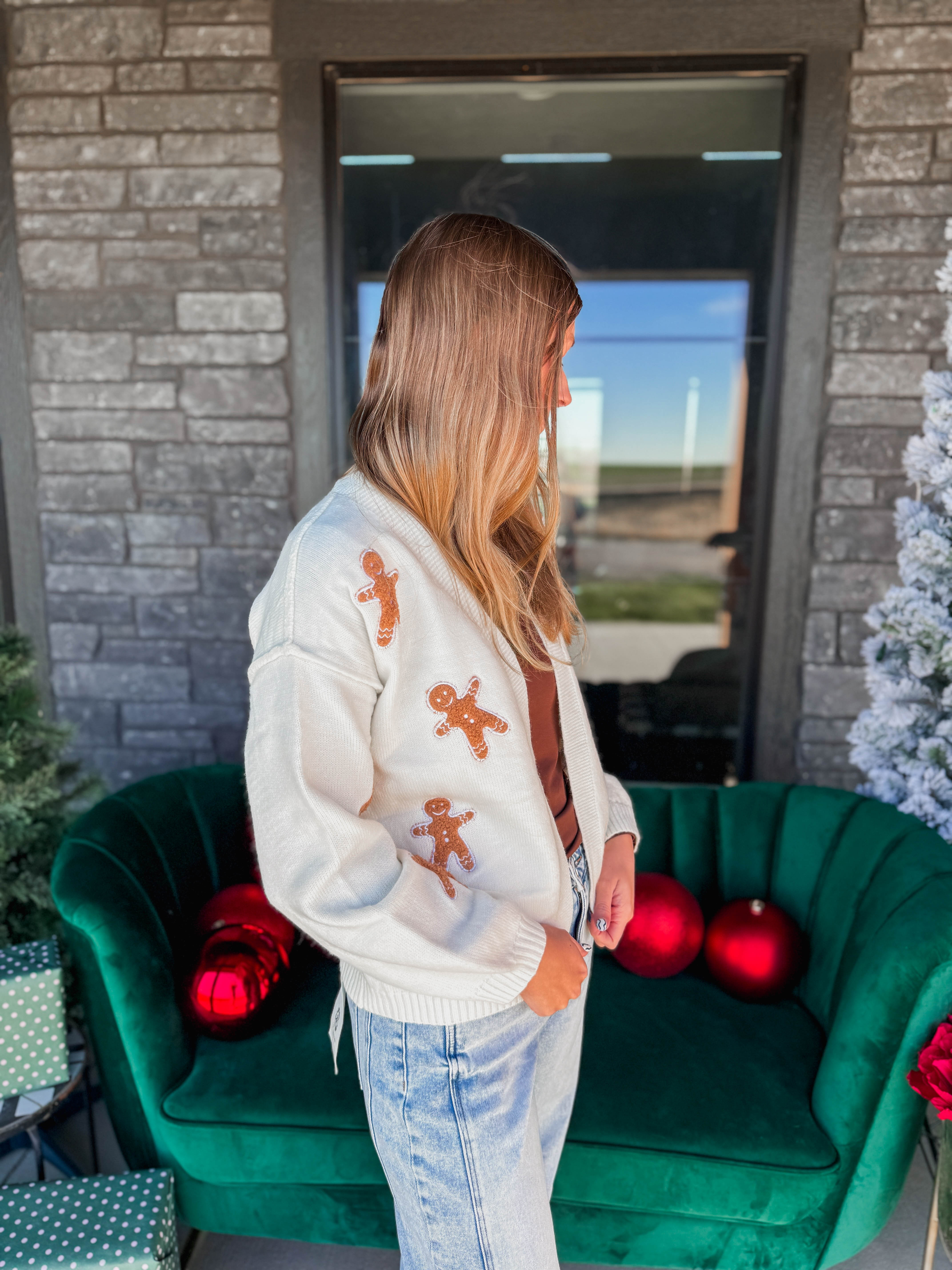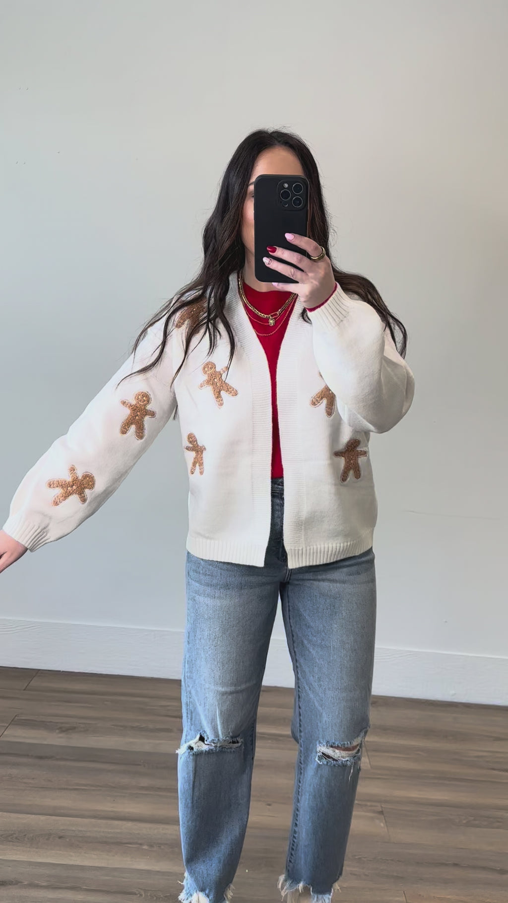 Cozy up for the holidays with this Gingerbread Man Patch Cardigan! Featuring a charming gingerbread patch, V-neckline, and open front, it’s perfect for layering. Long sleeves and ribbed hems keep you comfy and cute all season long.
