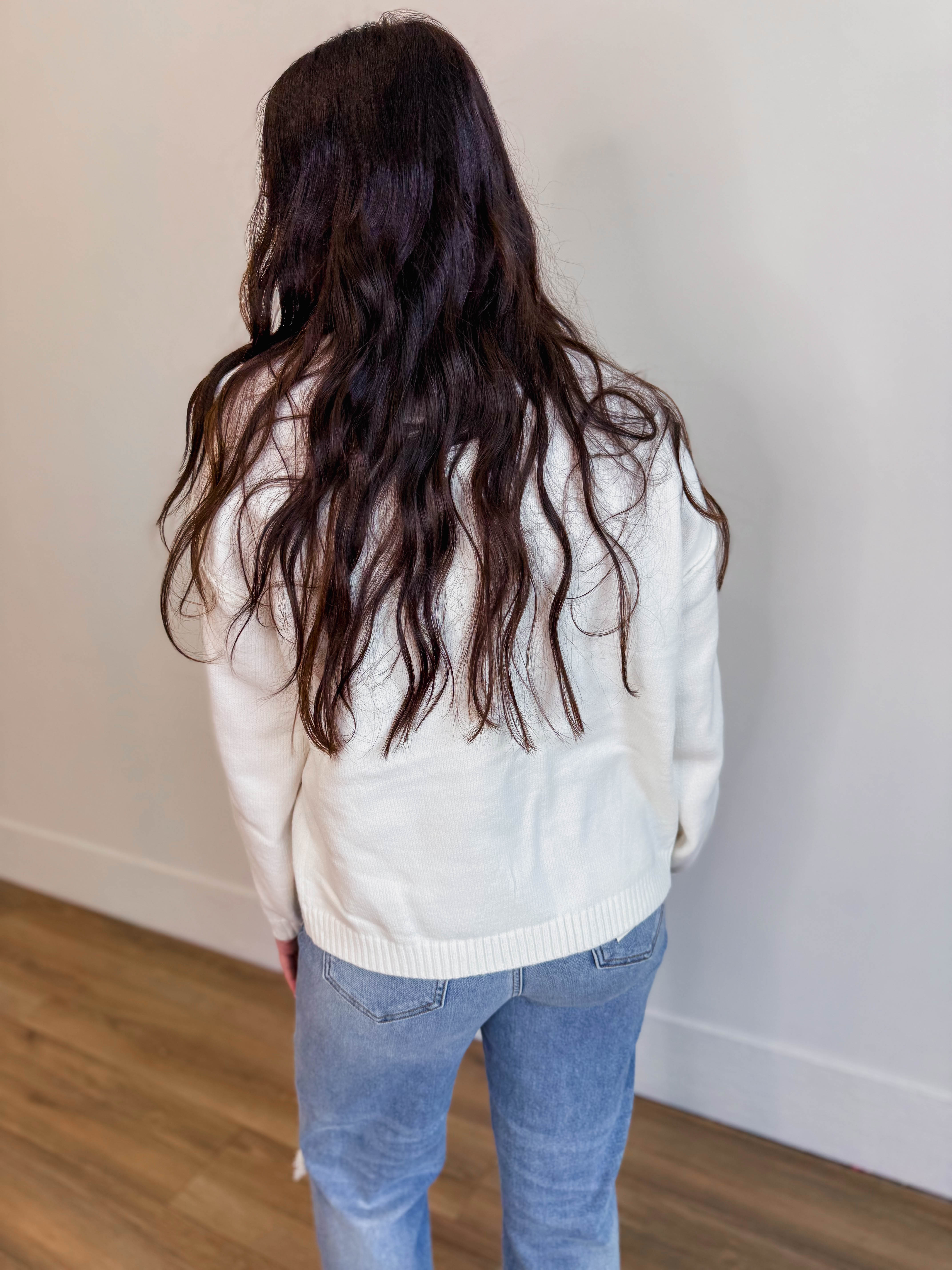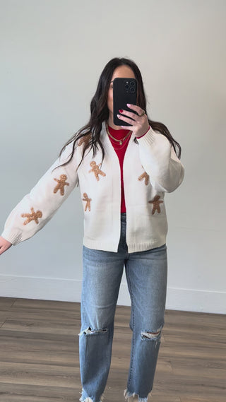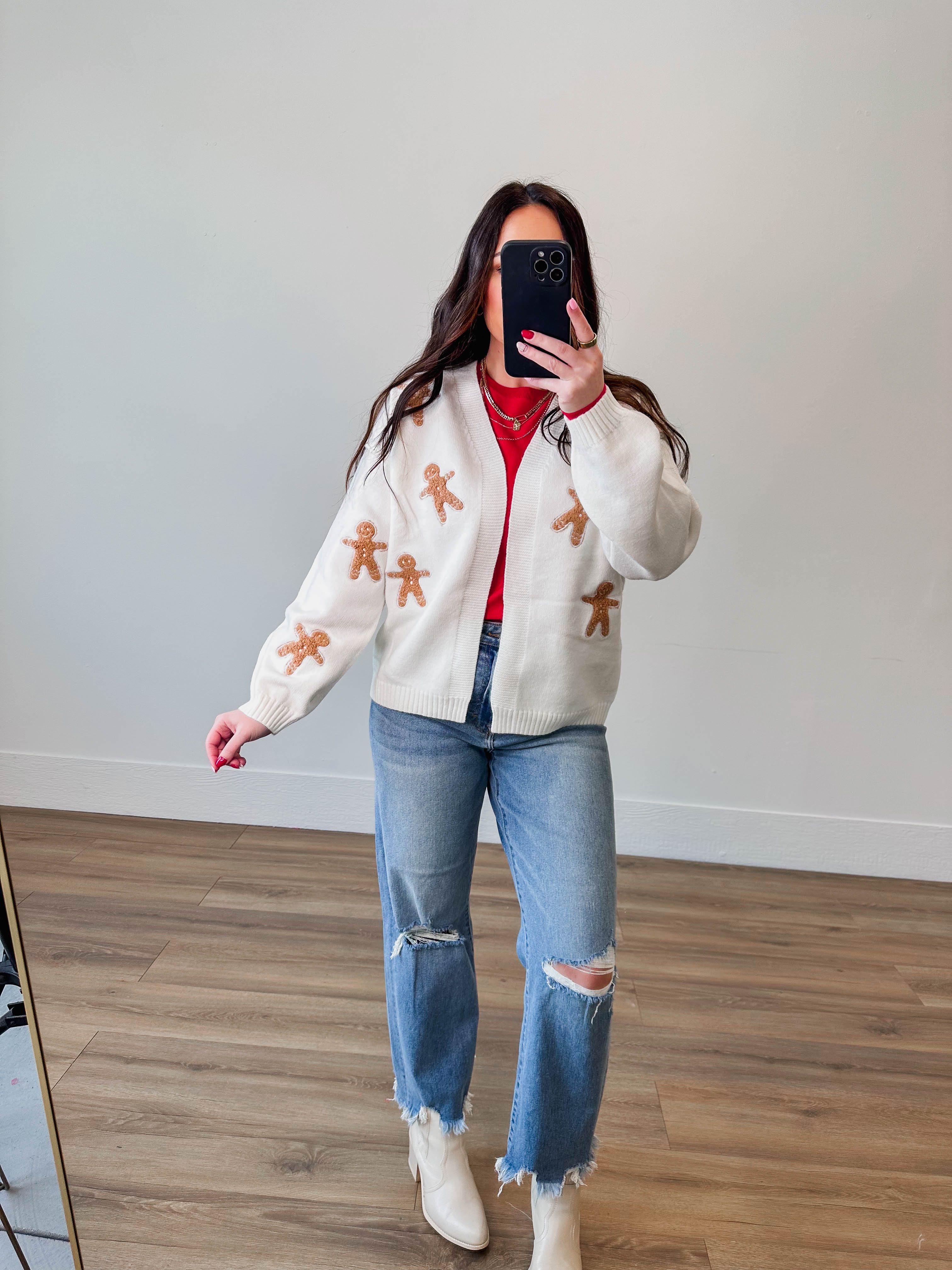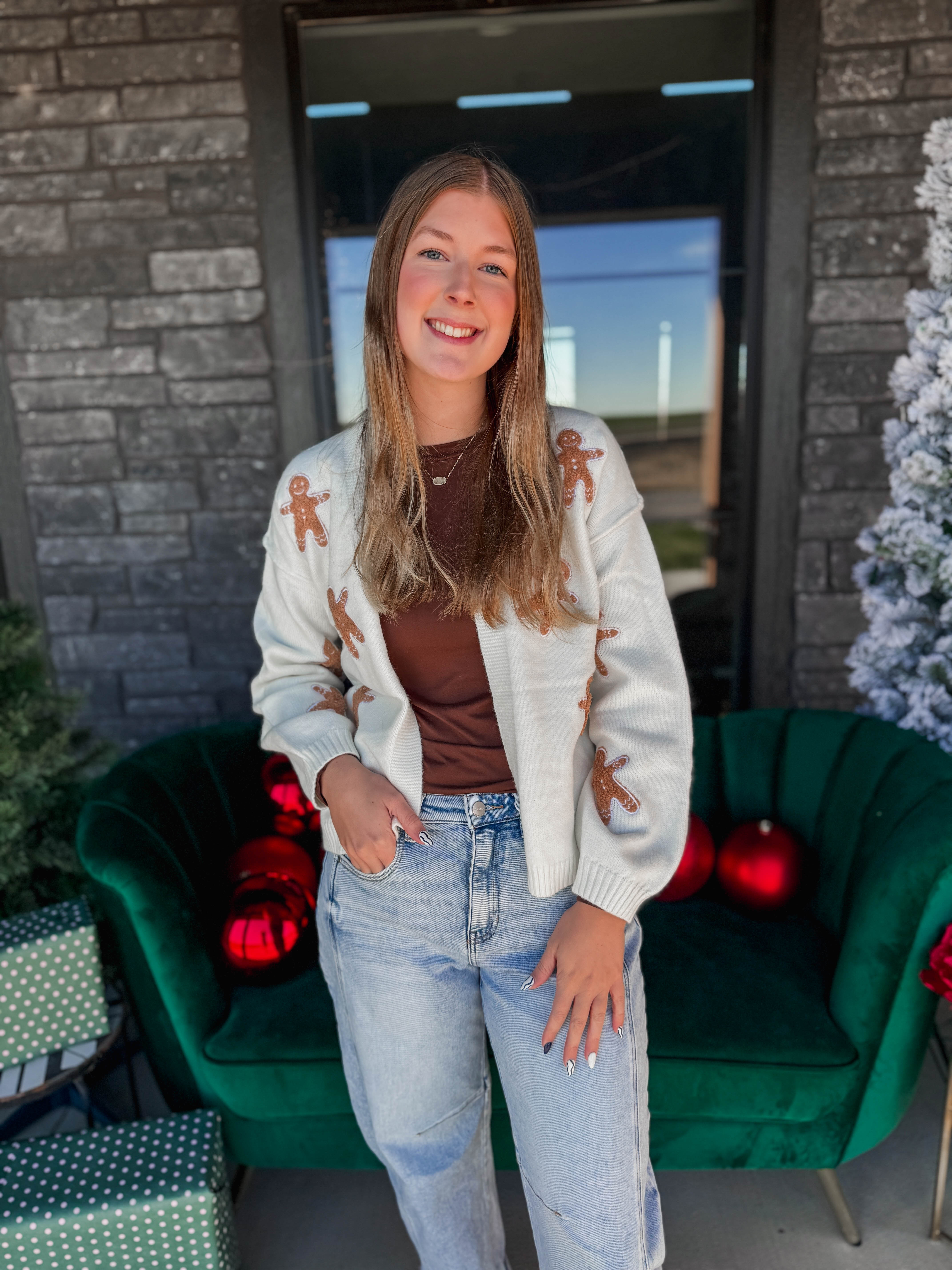 Cozy up for the holidays with this Gingerbread Man Patch Cardigan! Featuring a charming gingerbread patch, V-neckline, and open front, it’s perfect for layering. Long sleeves and ribbed hems keep you comfy and cute all season long.