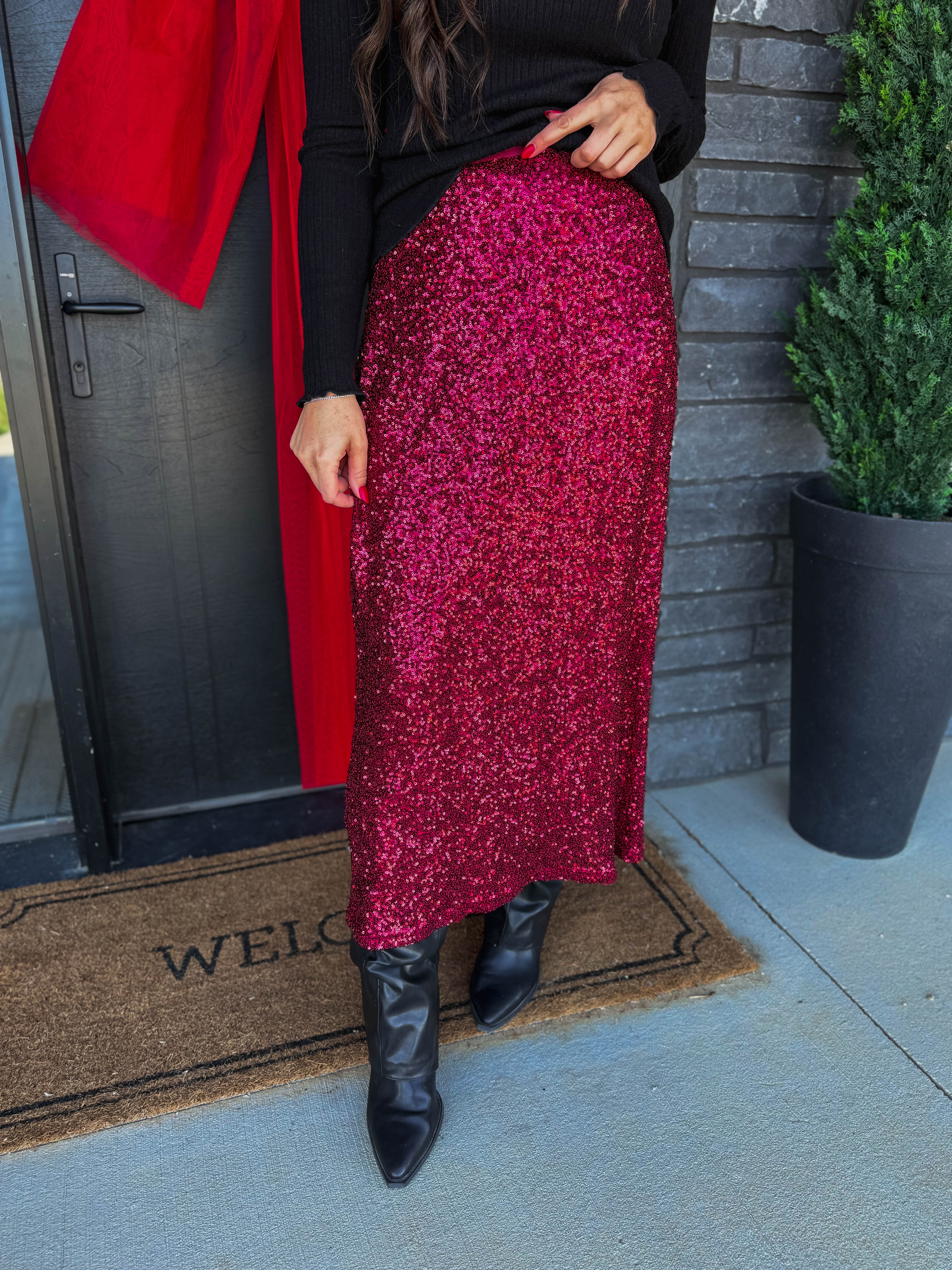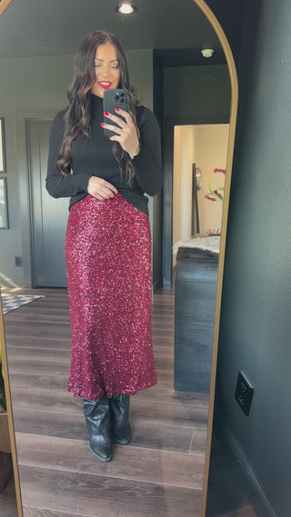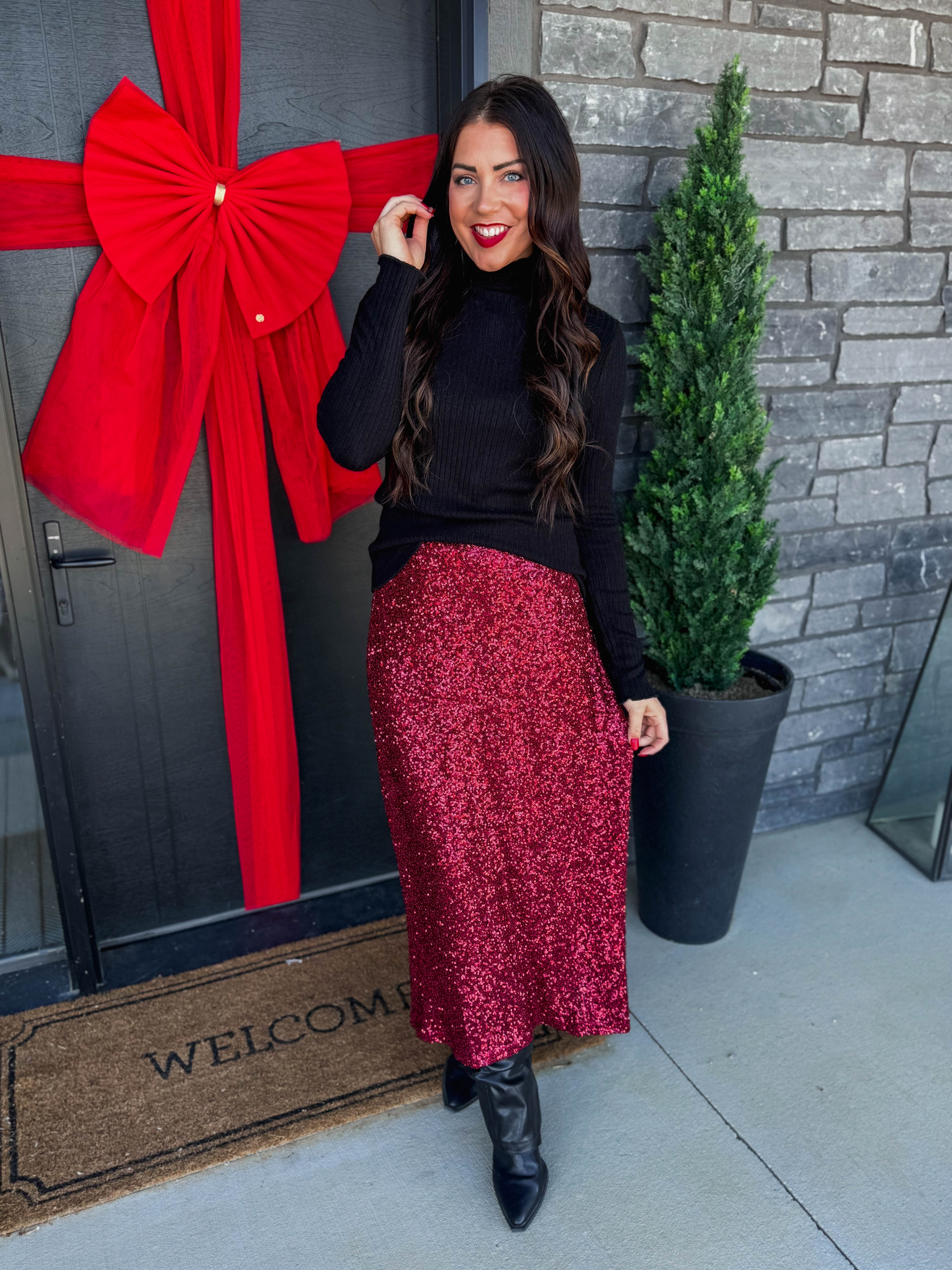 Shine bright at every celebration with this Holiday Glimmer Midi Skirt. Featuring a sparkling sequin overlay and a smooth back zipper closure, it’s fully lined for comfort and the perfect party-ready pick for holidays, New Year’s Eve, and more.