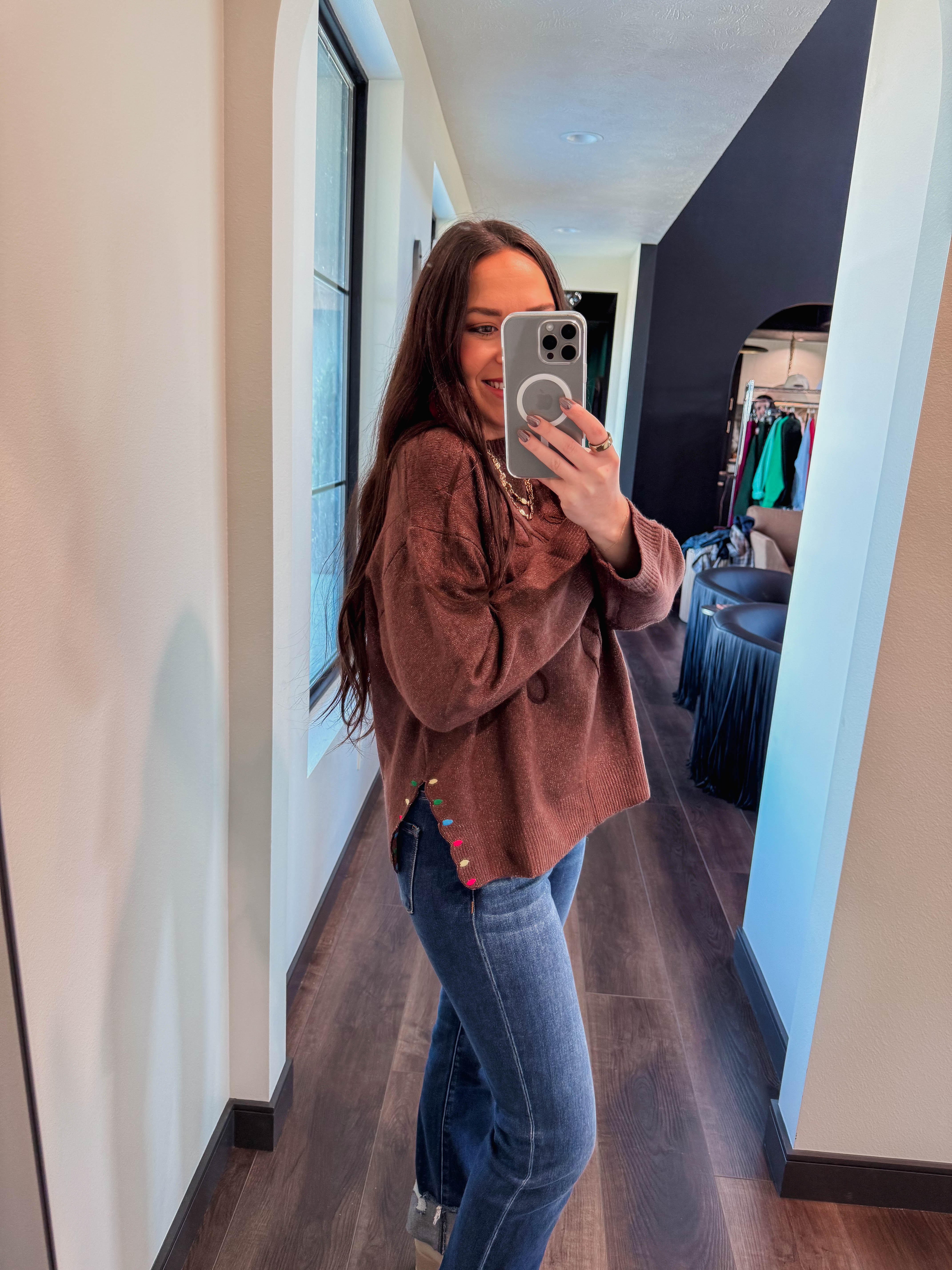 Stay cozy and festive in the Peace & Joy Sweater! Featuring a cute mock neckline, long sleeves, and playful Christmas light side slit details, this pullover spreads holiday cheer wherever you go. Perfect for spreading peace and joy all season long!