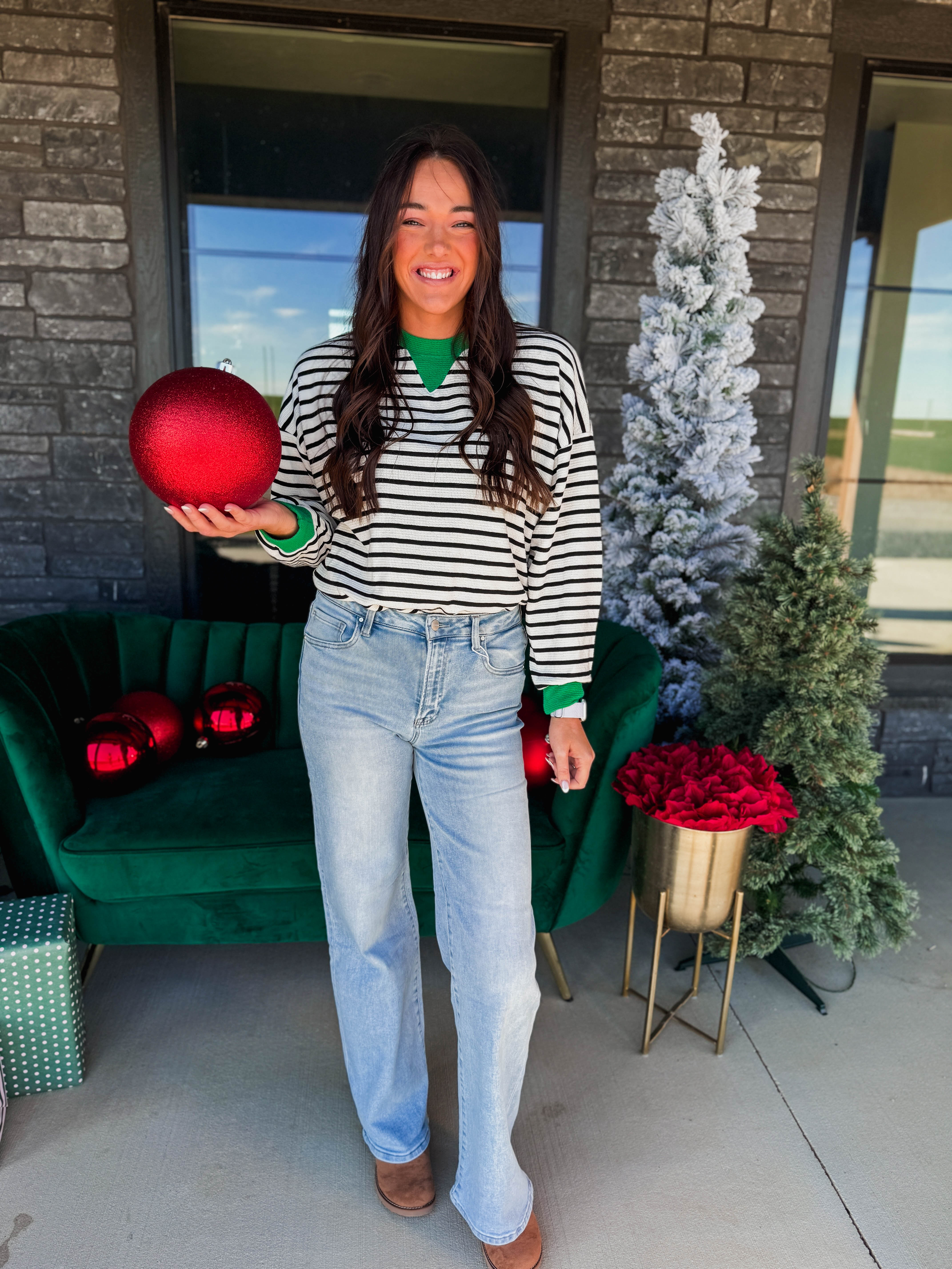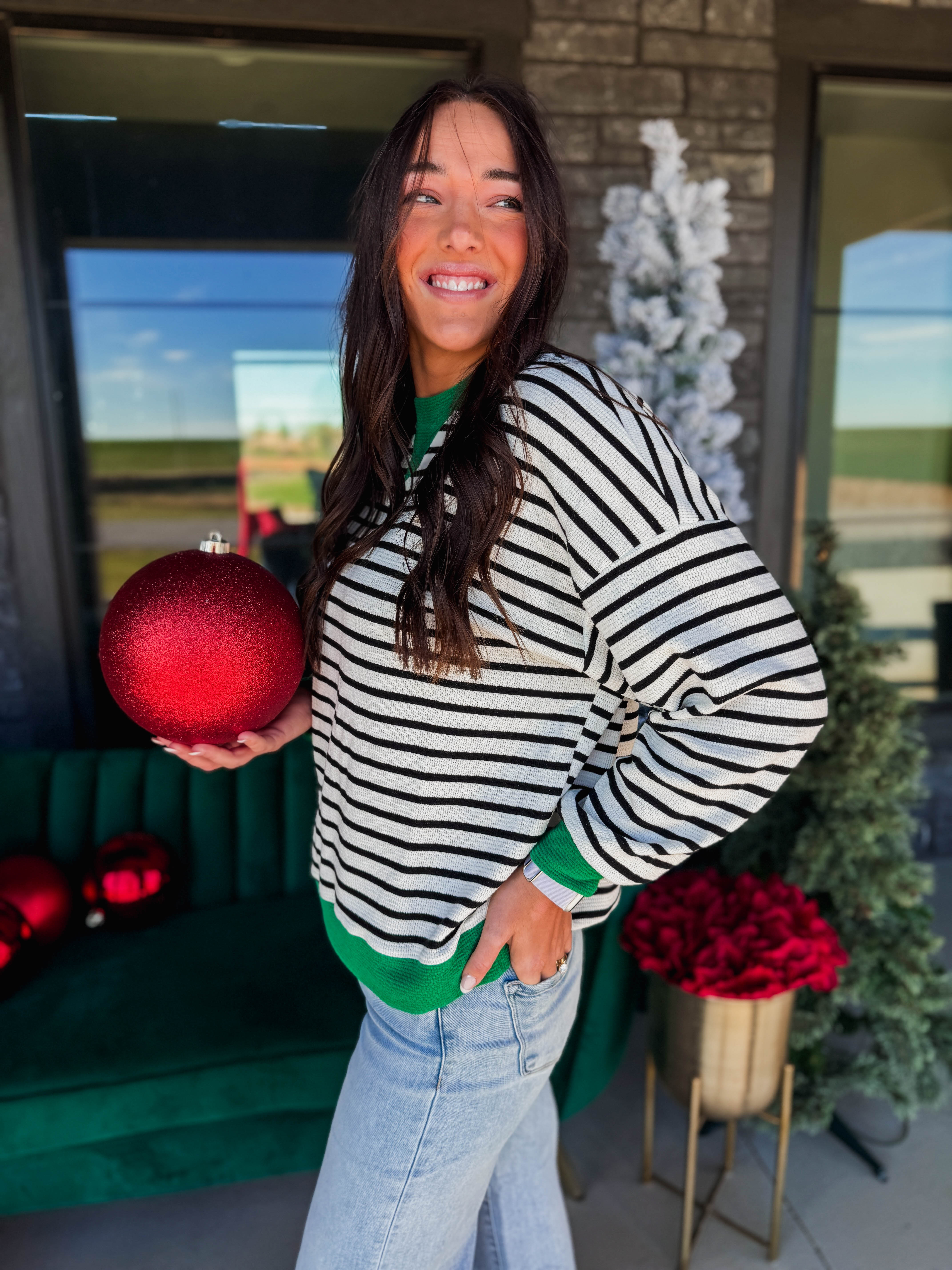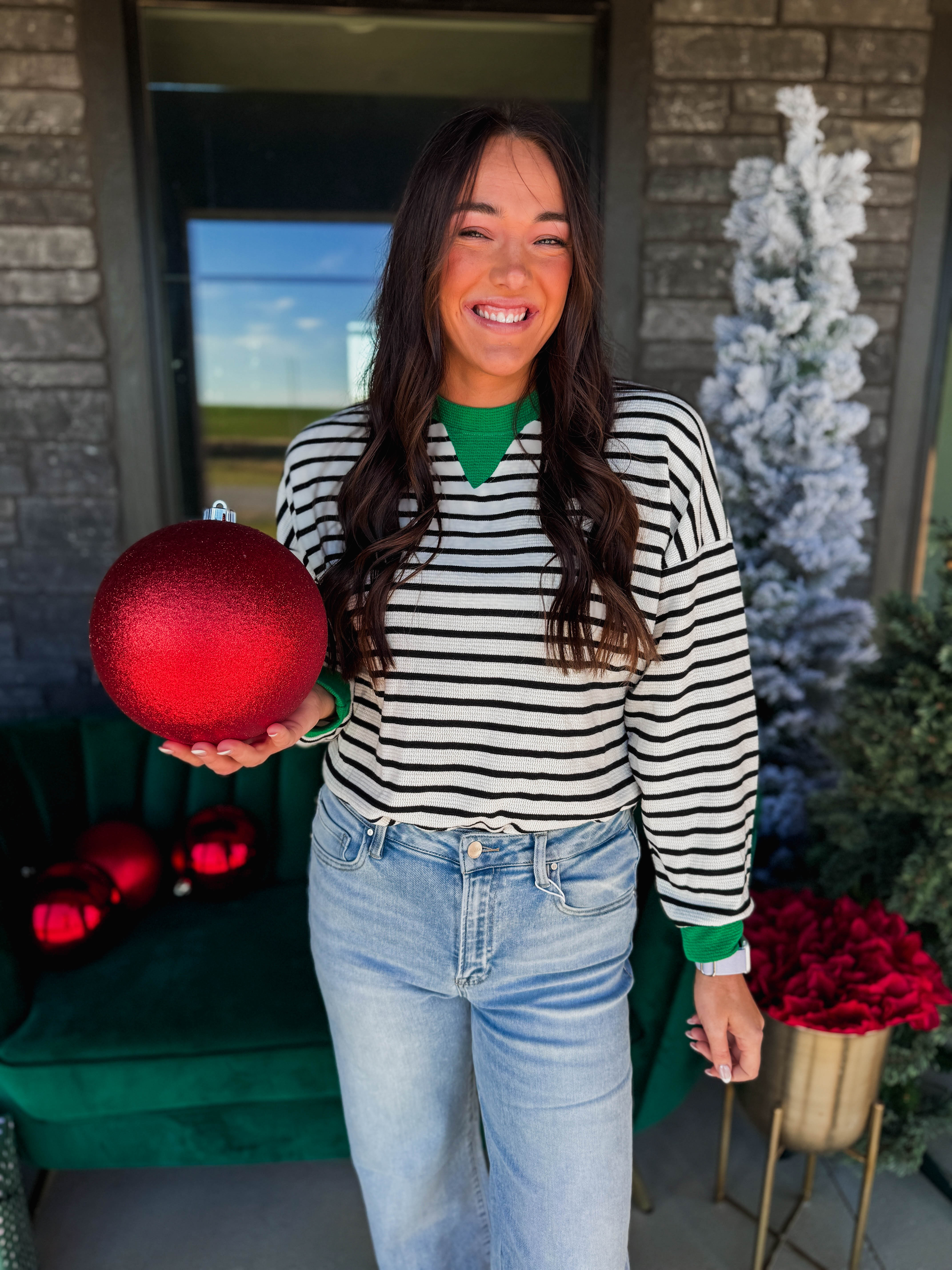 Get cozy and cute with the Snow Day Striped Pullover! This fun sweatshirt features a textured knit, round neckline, and playful contrast trim. Perfect for holiday vibes or everyday wear—ready to take you from work to weekend in style.