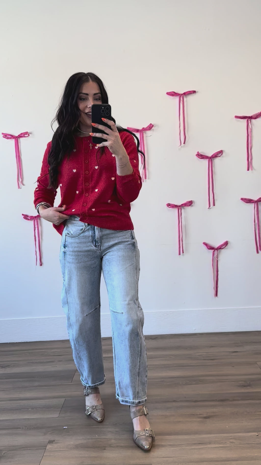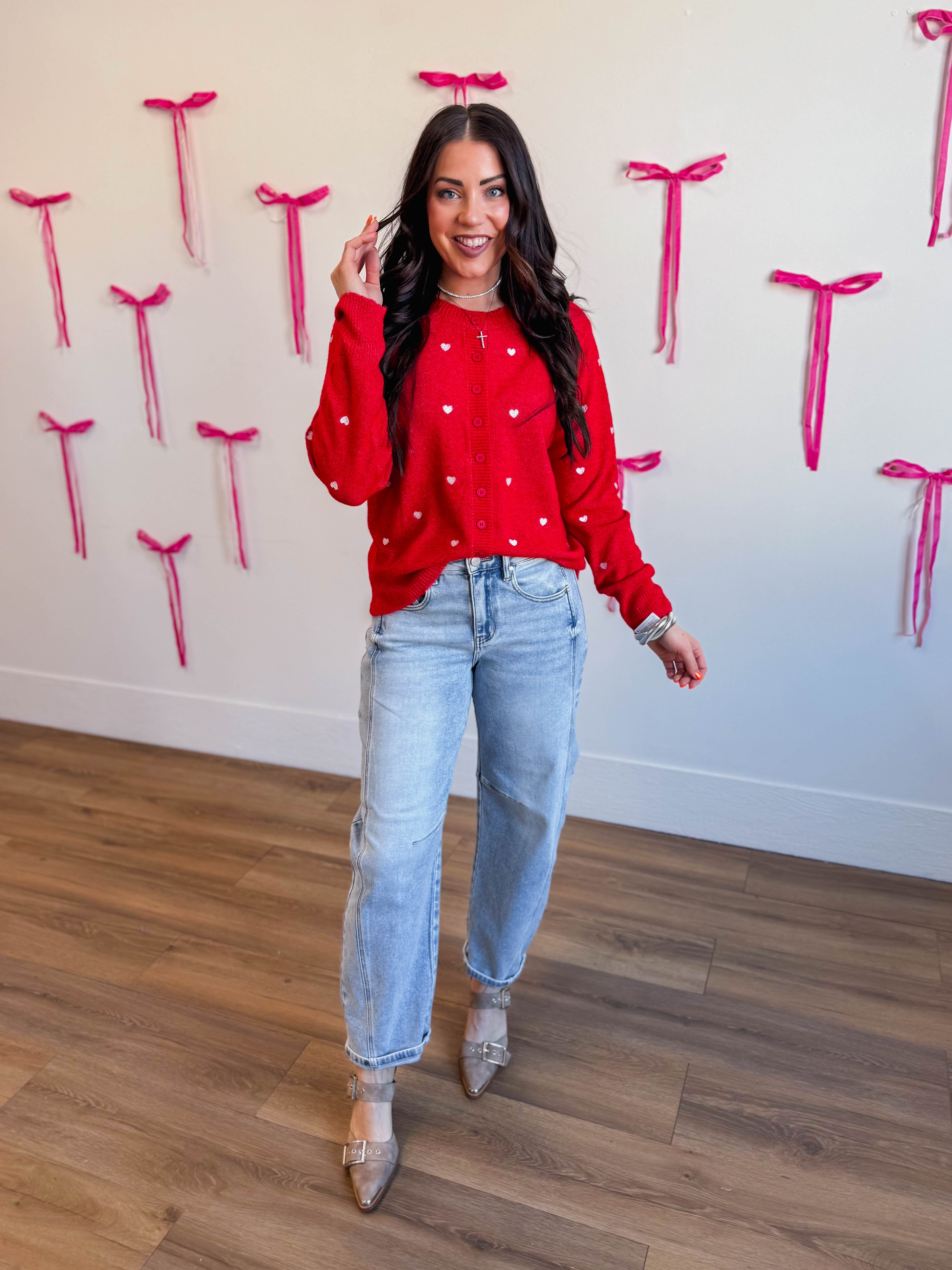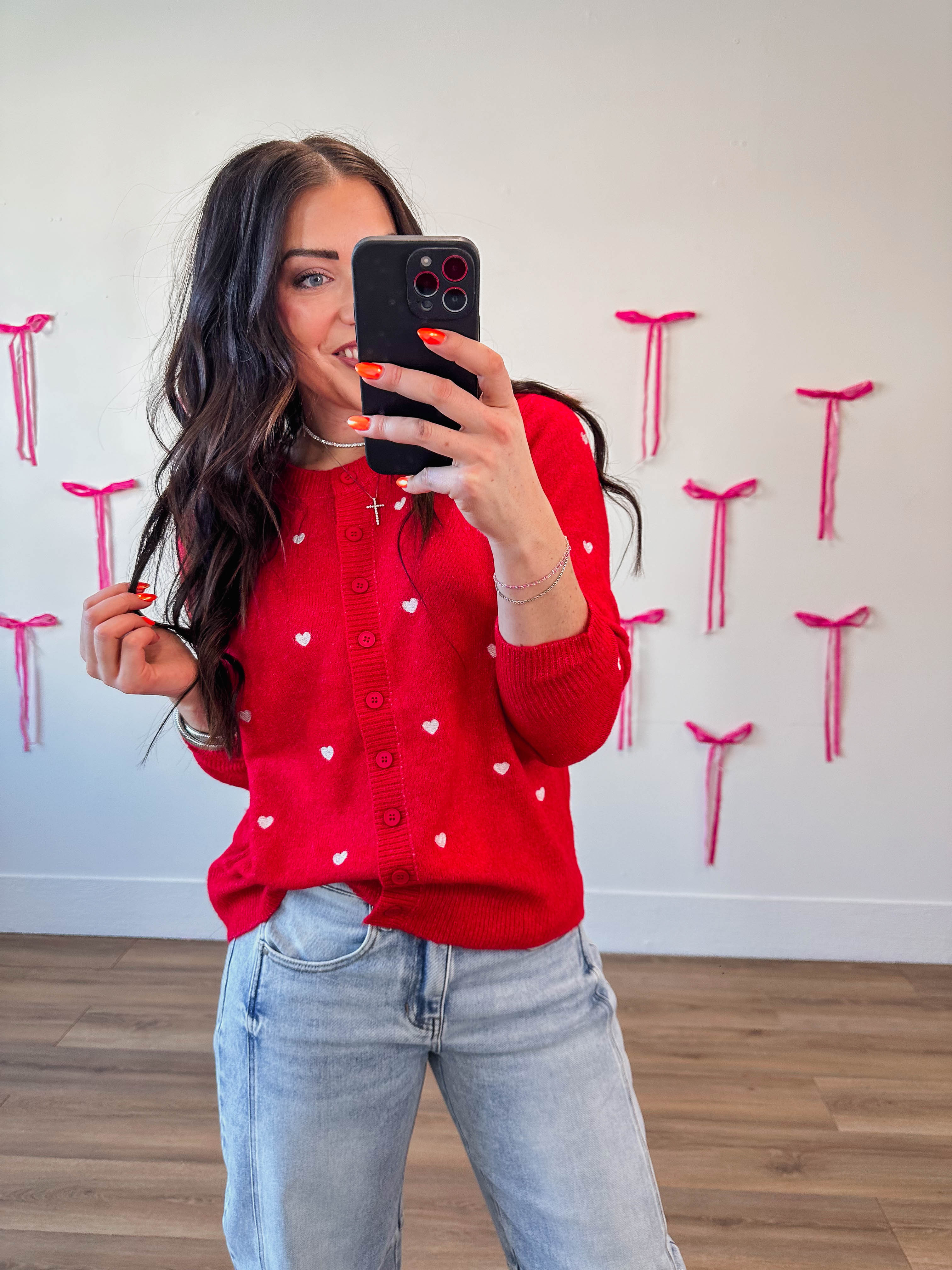 Rock your romantic side with the Be Mine Cardigan—a playful red sweater that's basically a love letter you can wear! Featuring a classic crew neckline, long sleeves, and easy button-front closure, it's cozy comfort meets Valentine's charm. The adorable heart embroidery is the cherry on top, making this the perfect pick for spreading joy and cuteness all through the season.