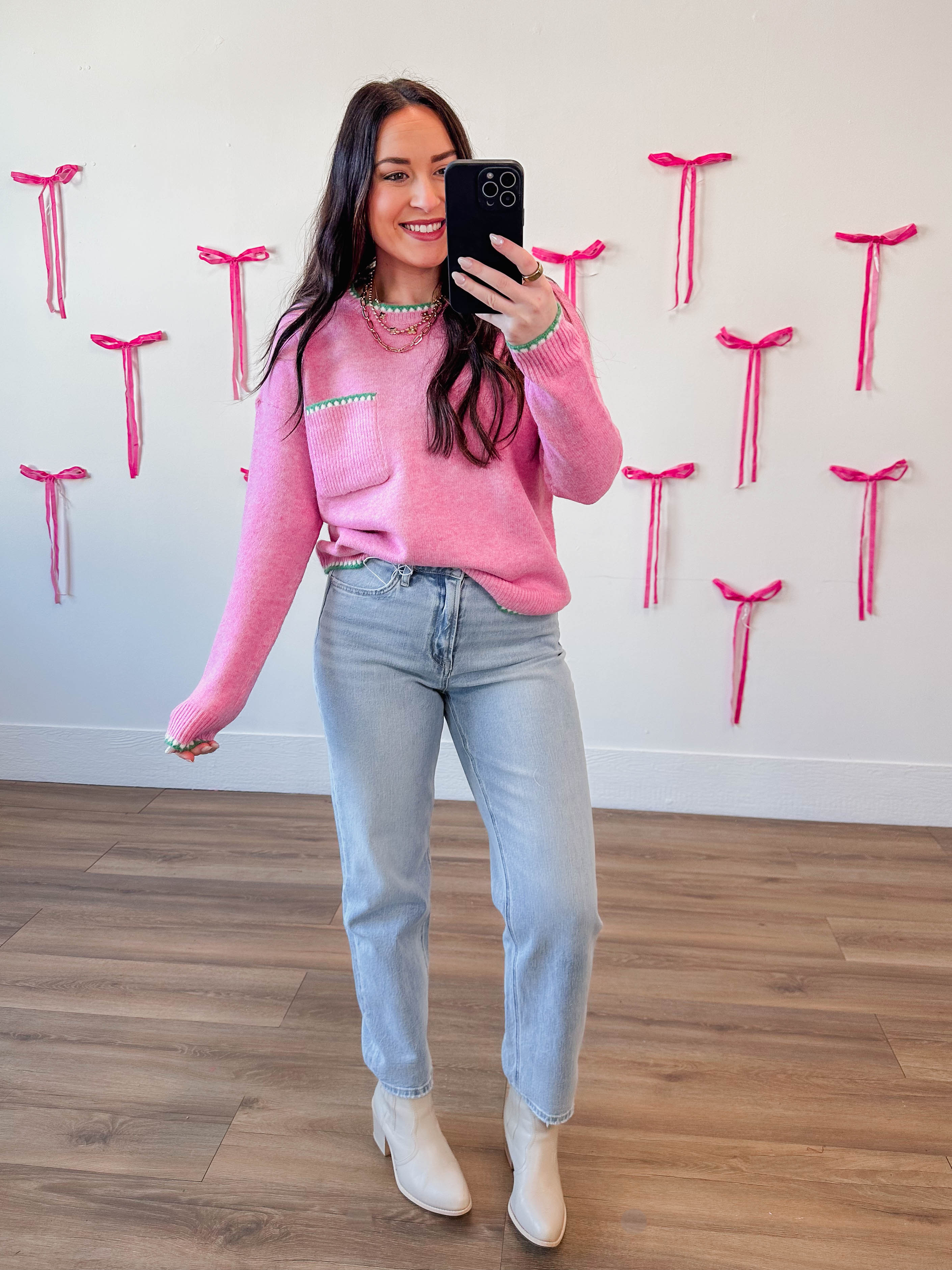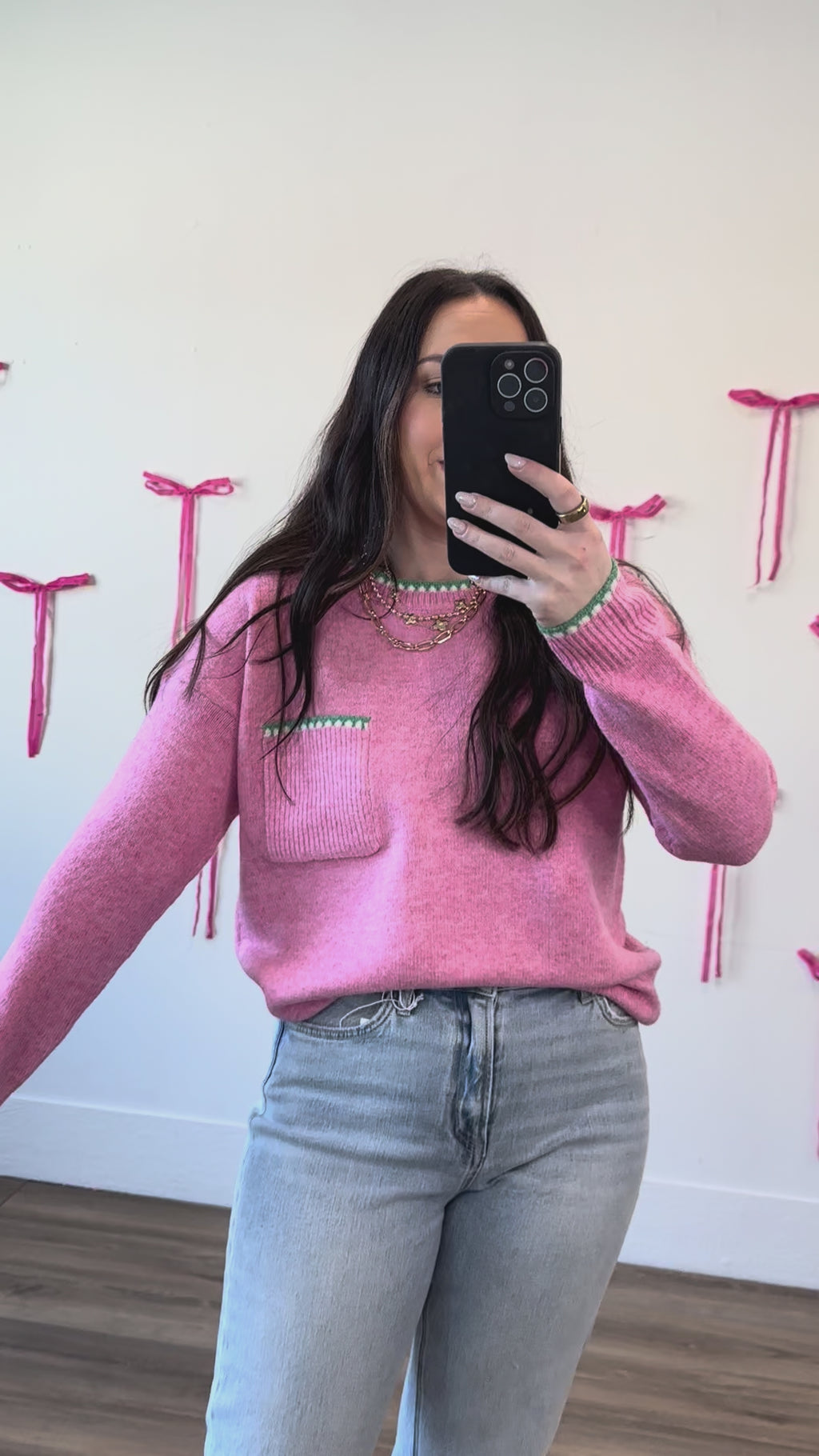 The Margo Sweater brings effortless style from office to weekend in a vibrant pink that demands attention. This cozy pullover features a classic crew neckline, long sleeves, and a practical chest pocket—perfect for stashing essentials. The blanket-stitched pop color detail adds a playful twist that transforms any outfit into something fun and unexpected.