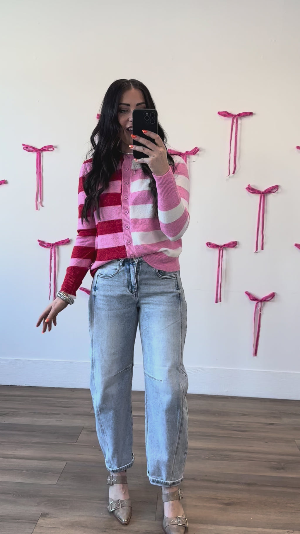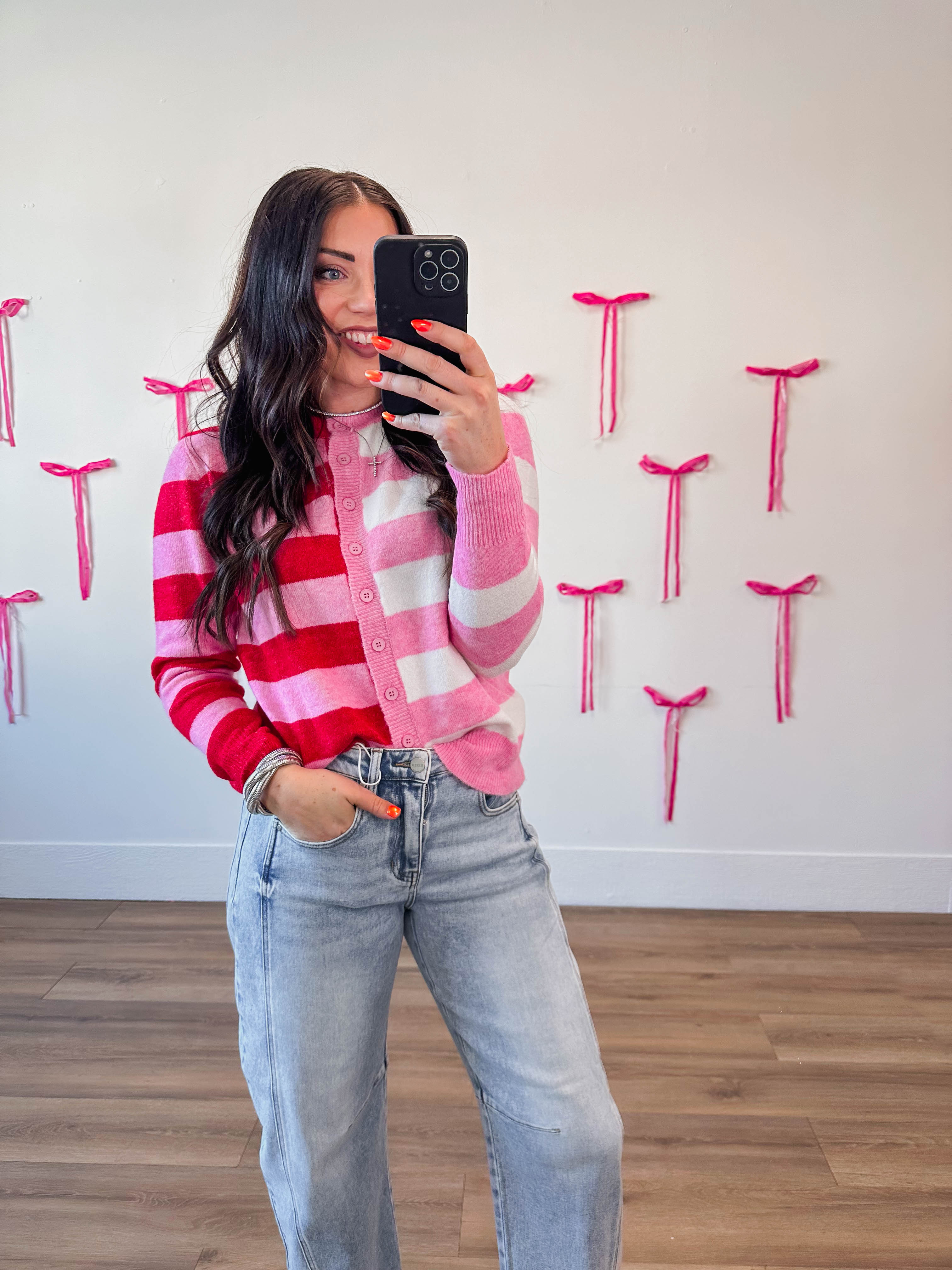 Layer up with this striped cardigan that takes you from office to happy hour. The bold color-blocked design and playful pink hues add instant personality to any outfit, while the crew neckline and button-front closure keep things effortlessly chic. Long sleeves and a shorter cut make it the perfect throw-on piece for work-to-weekend versatility.