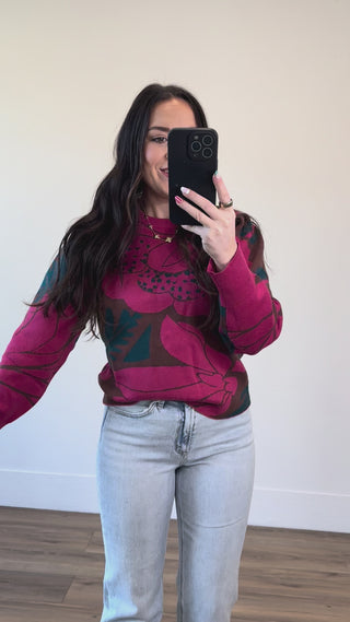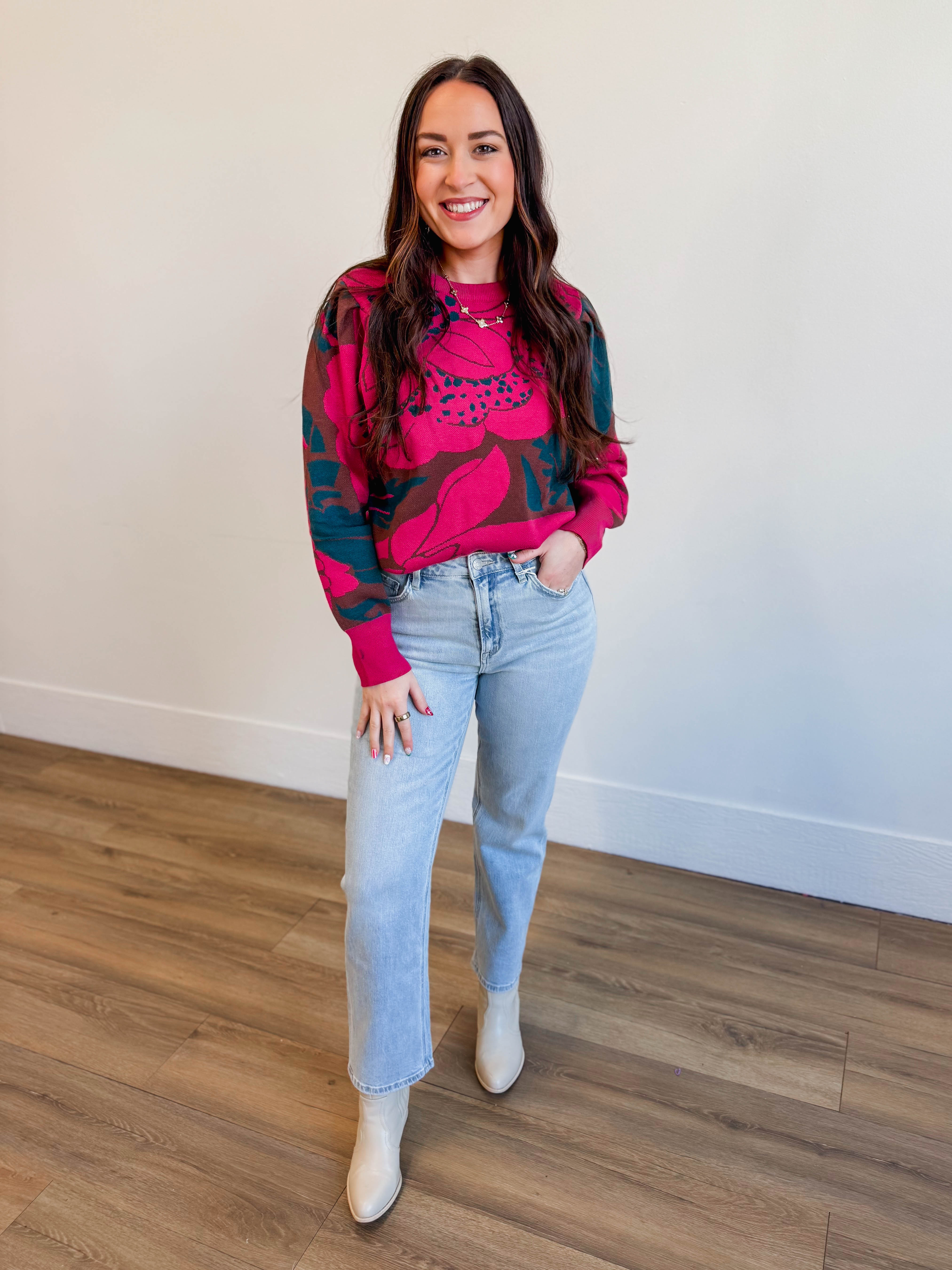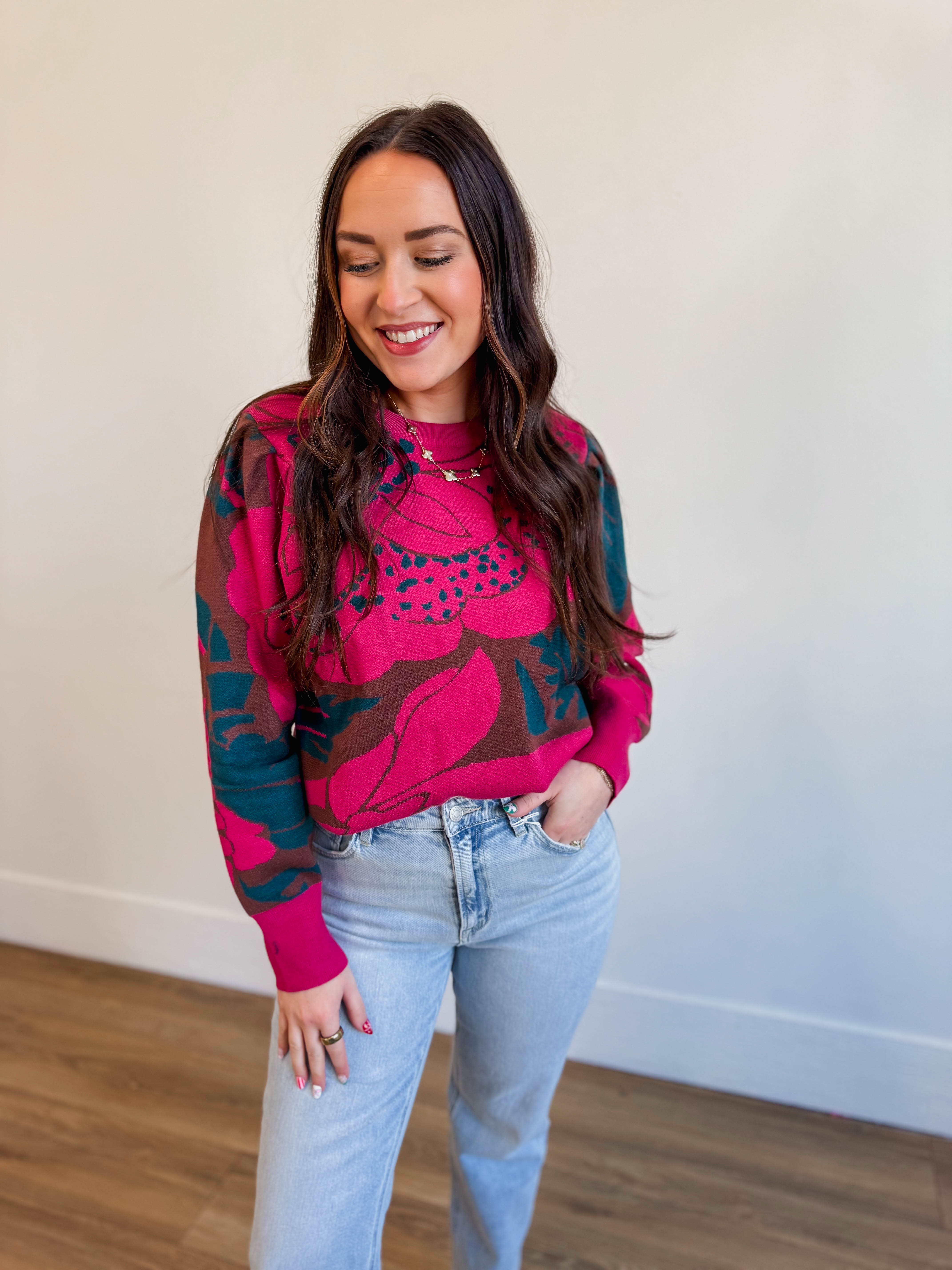 The Zinnia Floral Sweater brings a fun pop of color to your wardrobe with its abstract floral print and gathered sleeve detail. Featuring a cozy crew neckline and long sleeves, it’s perfect for transitioning from work to weekend in style.