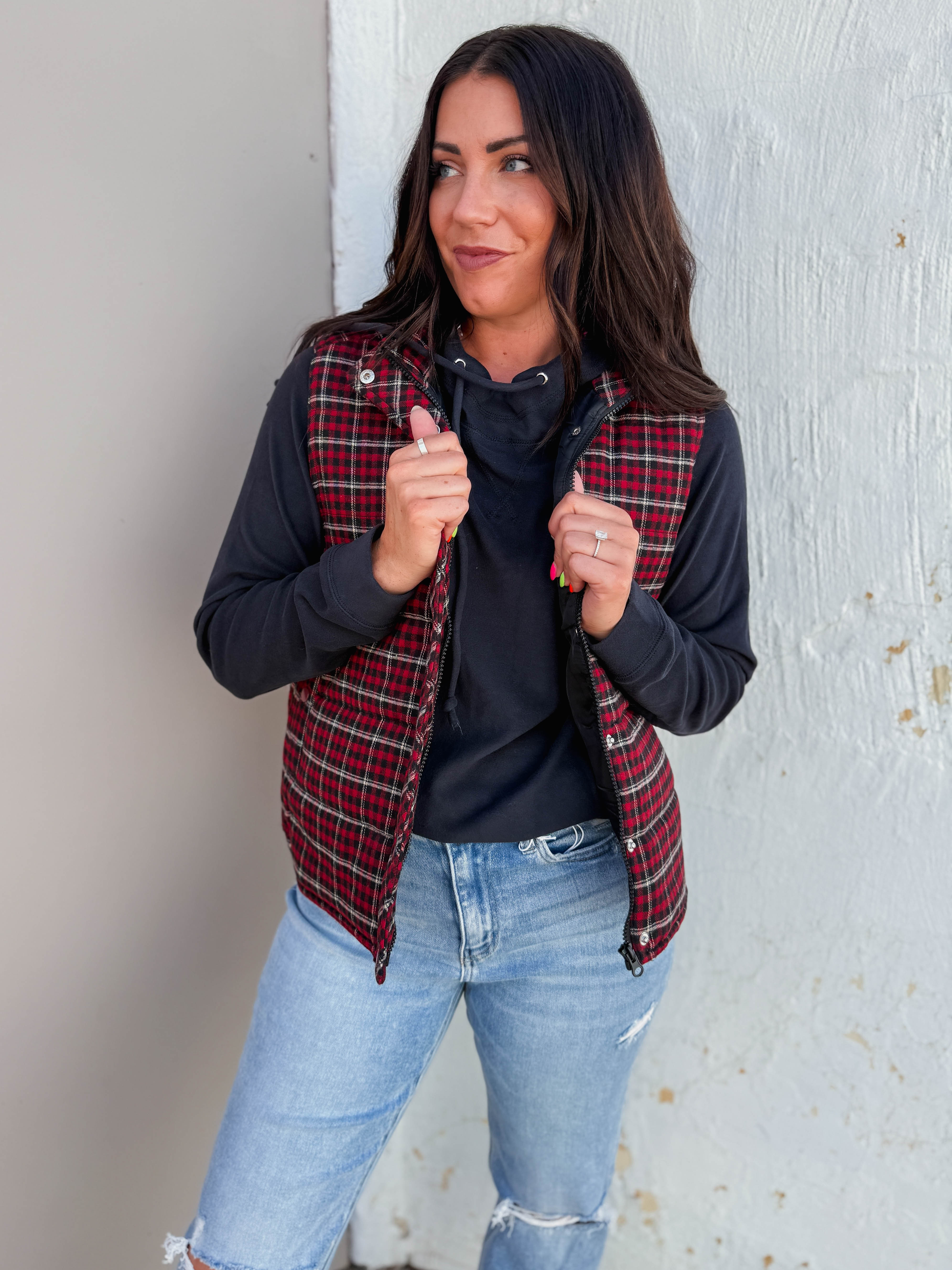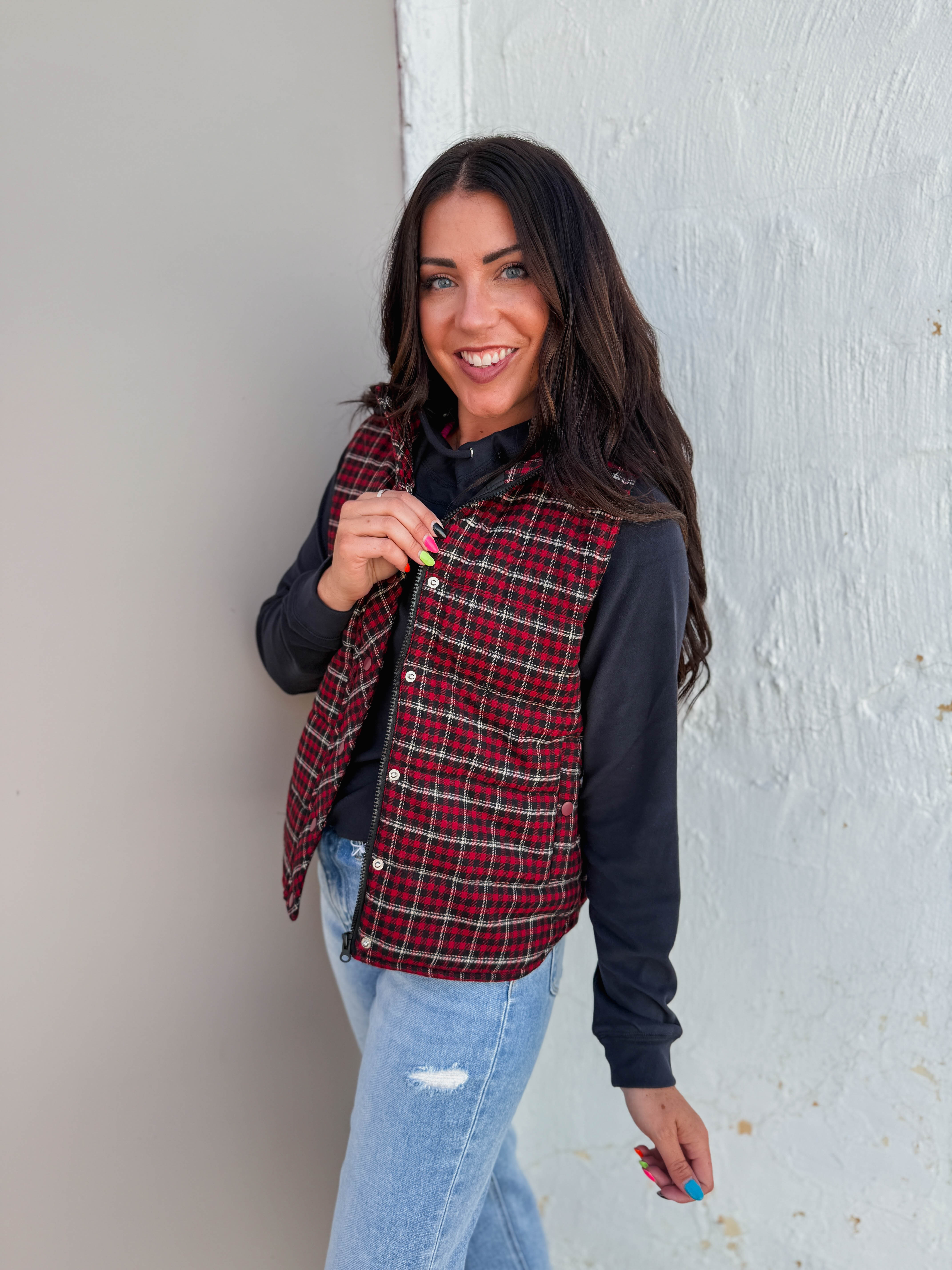 Stay cozy and chic with the Macey Plaid Vest in Red! Featuring a mock neck, hidden zip, and snap buttons, this vest is perfect for layering over long sleeves and sweatshirts. With handy side pockets, it’s your go-to from work to weekend adventures.