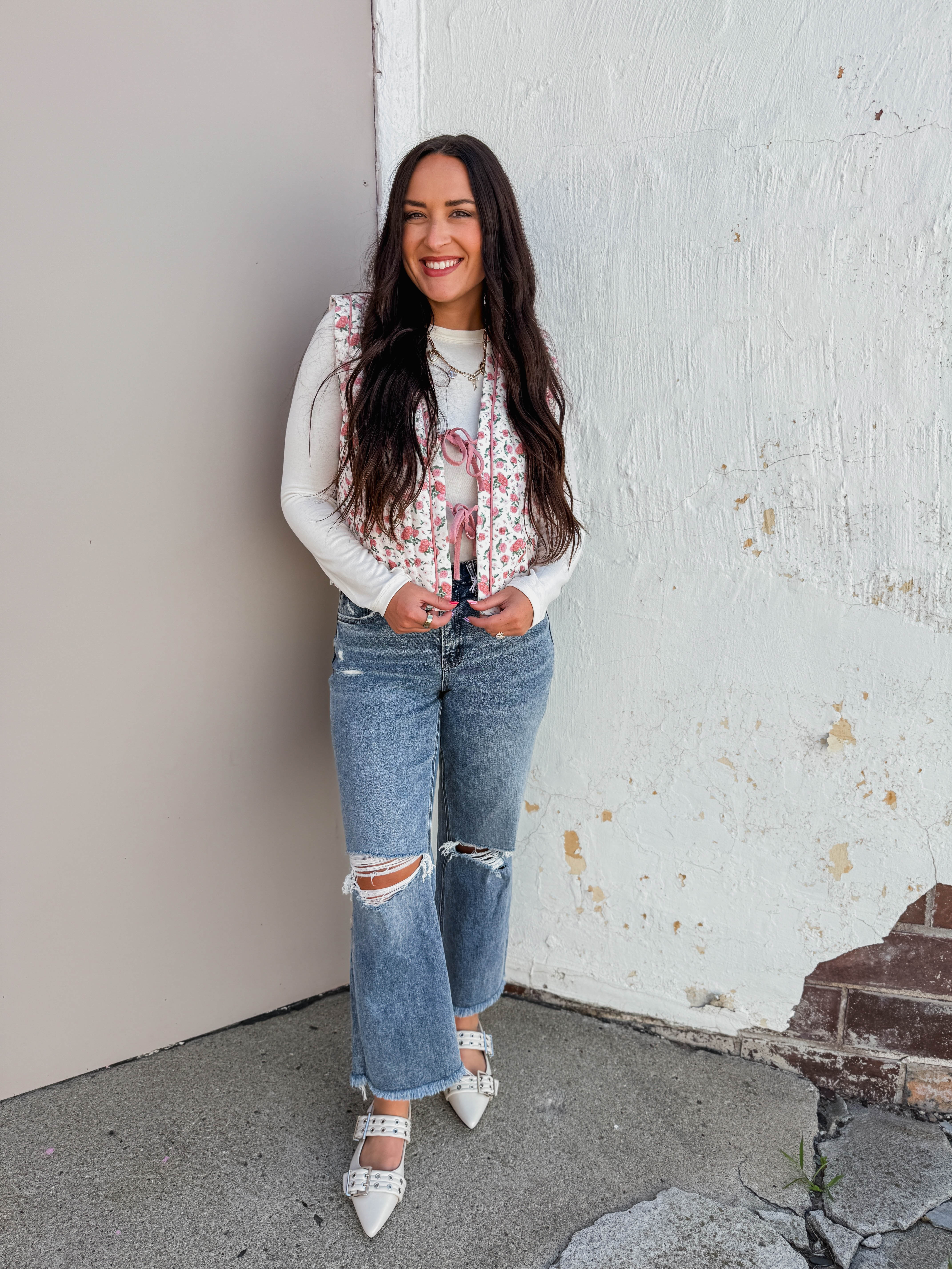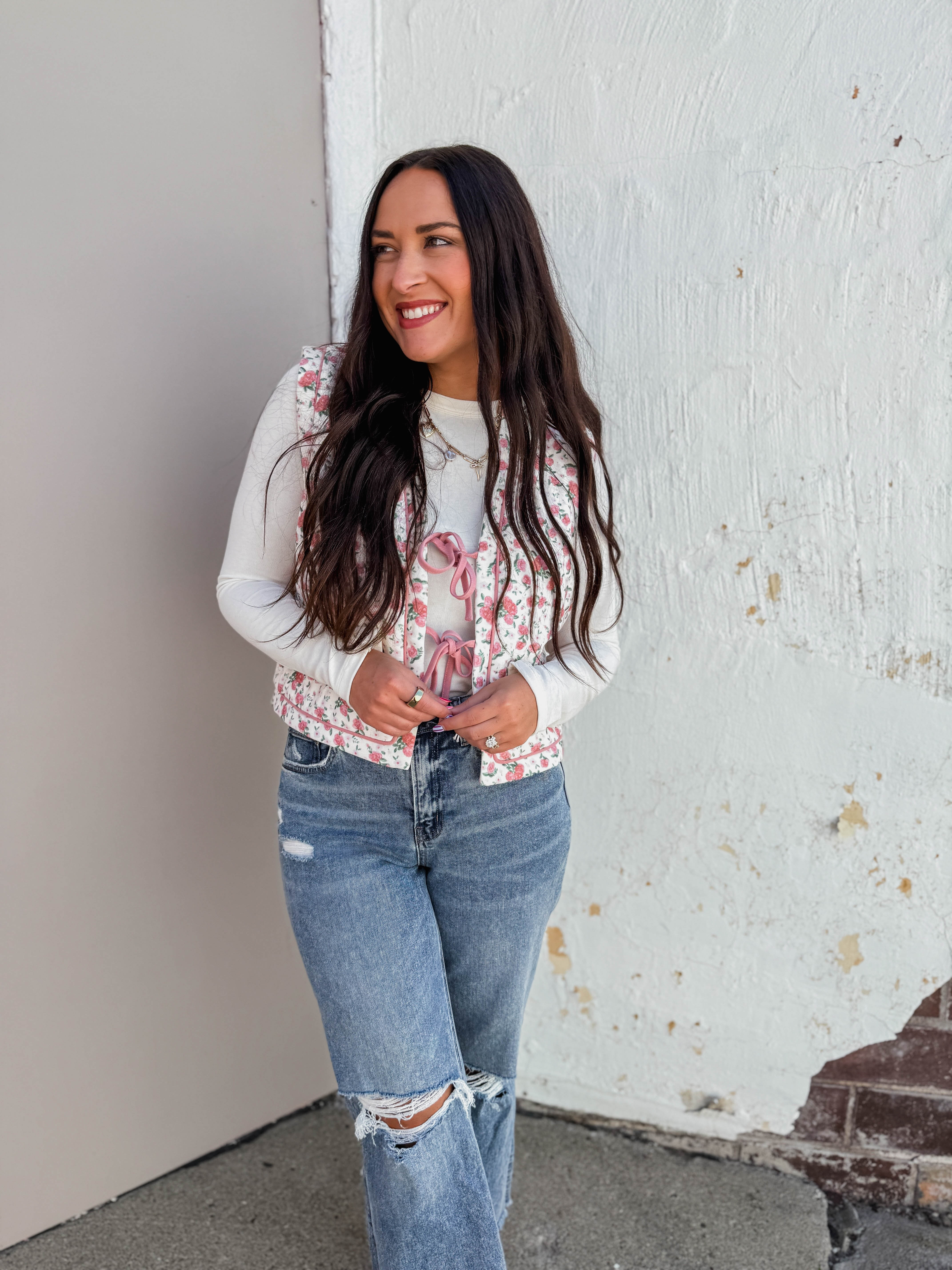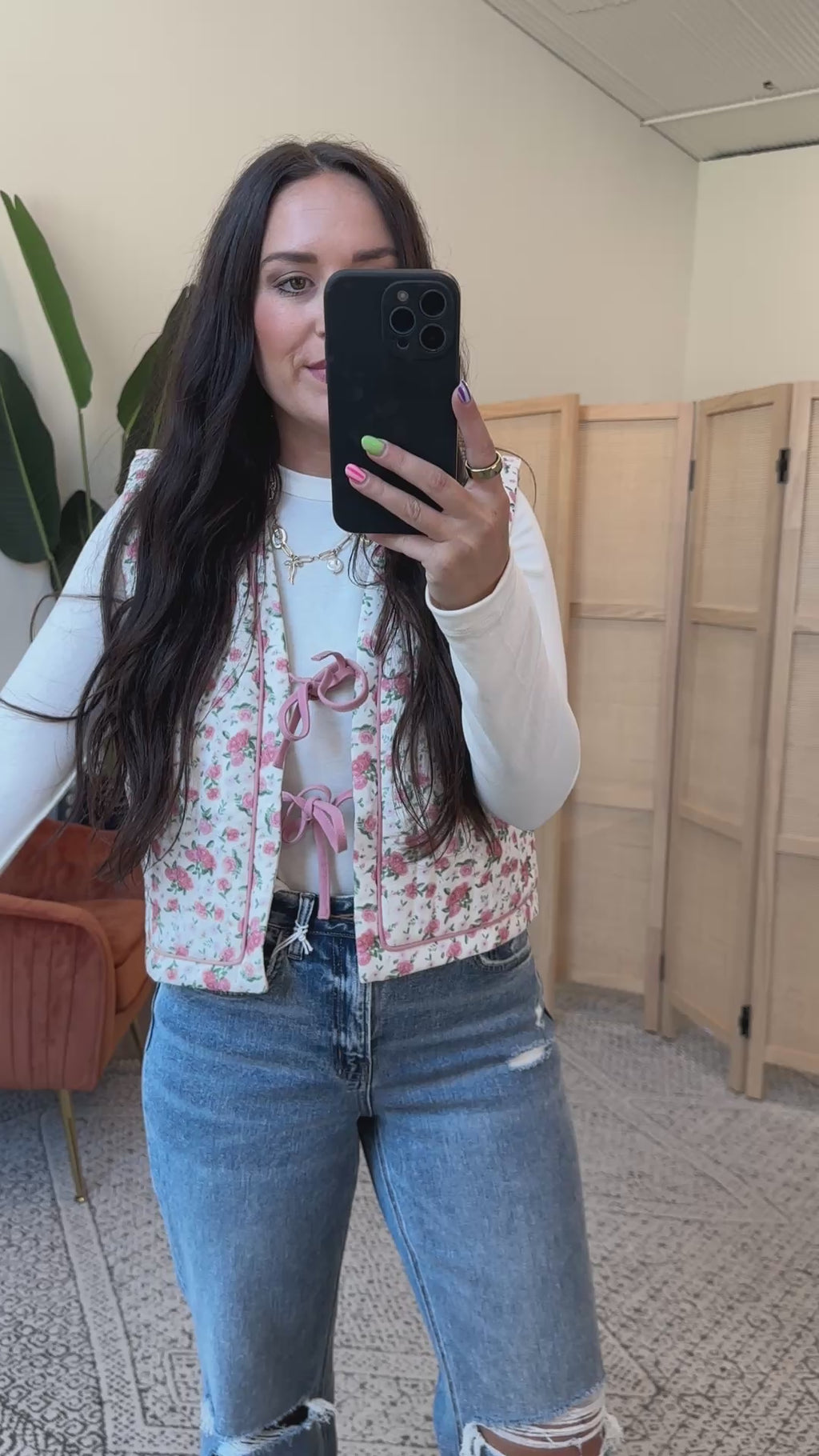 This Mae Floral Quilted Vest features a charming floral print with a playful V-neckline and double front self-tie for a flirty touch. Contrast piping adds a fun detail, making it a cute, feminine layer perfect for year-round wear.