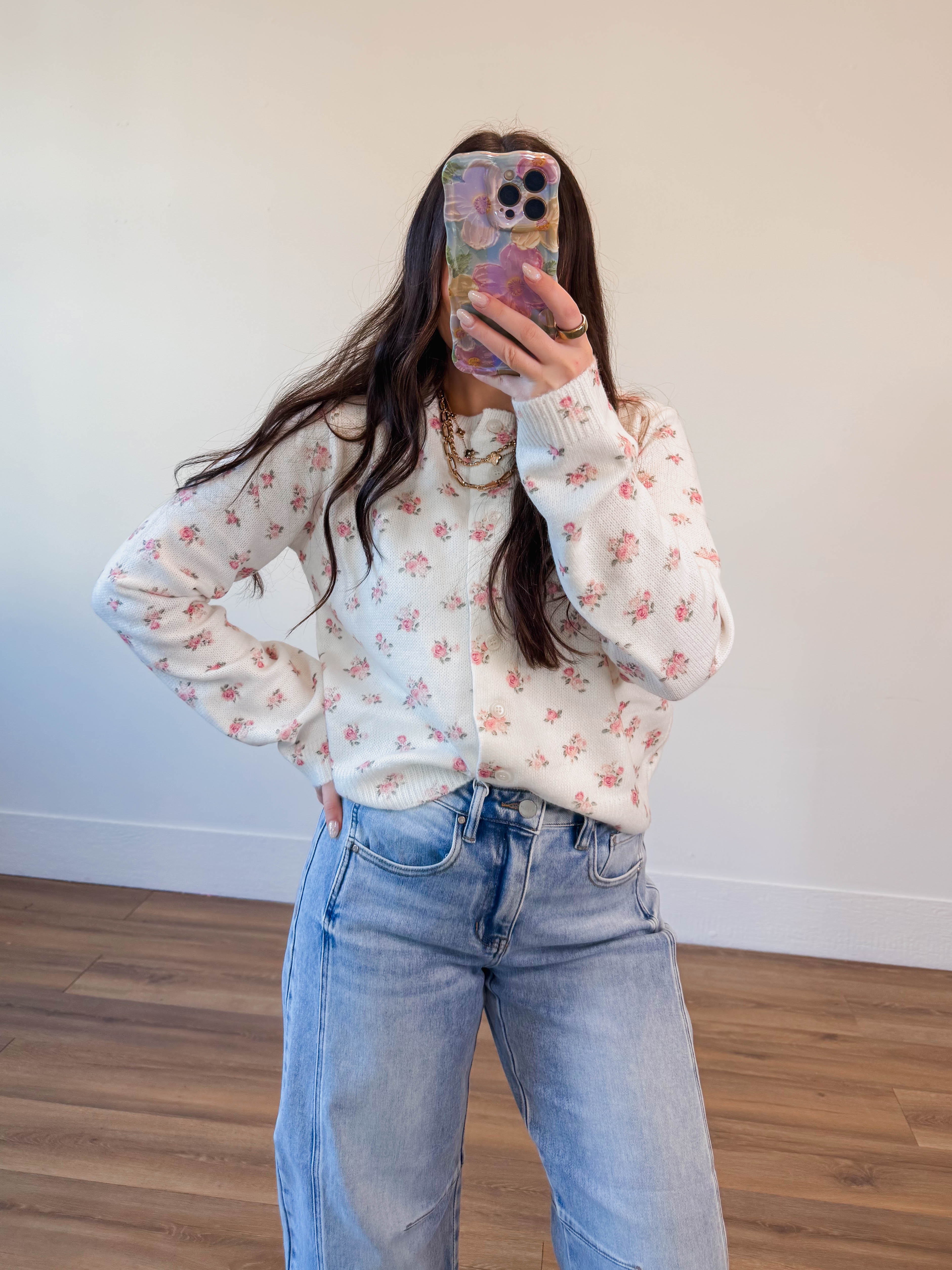Bring the bloom! This floral cardigan is your ticket to year-round cuteness. With its cheerful print, cozy long sleeves, and easy button-front design, it's basically a hug you can wear. The crew neckline keeps things classic while the flowers add that playful, girly touch. Layer it, love it, repeat.