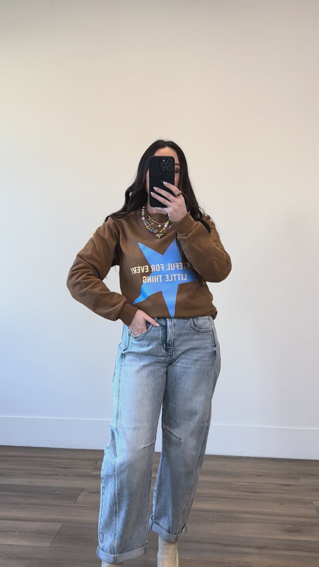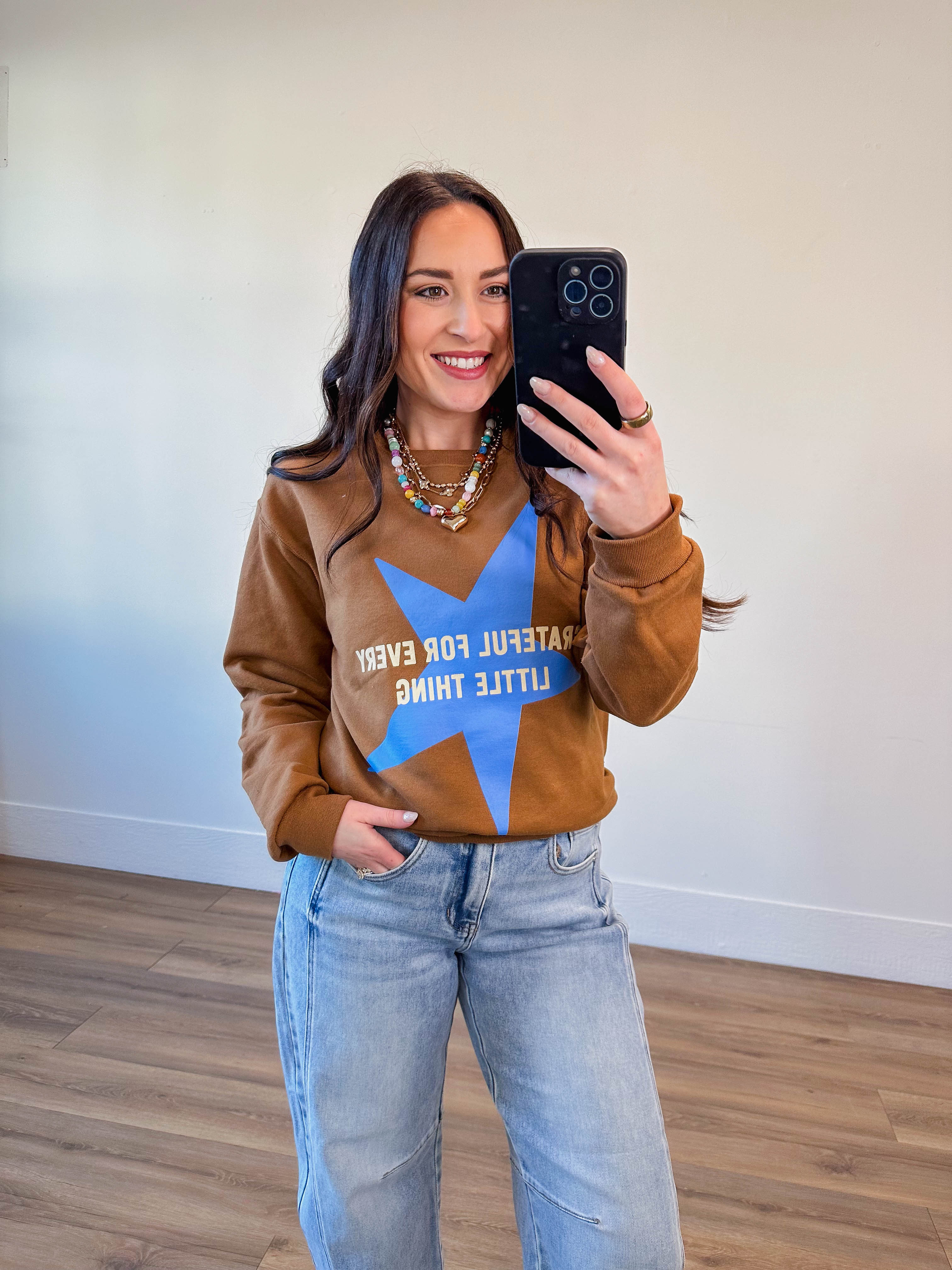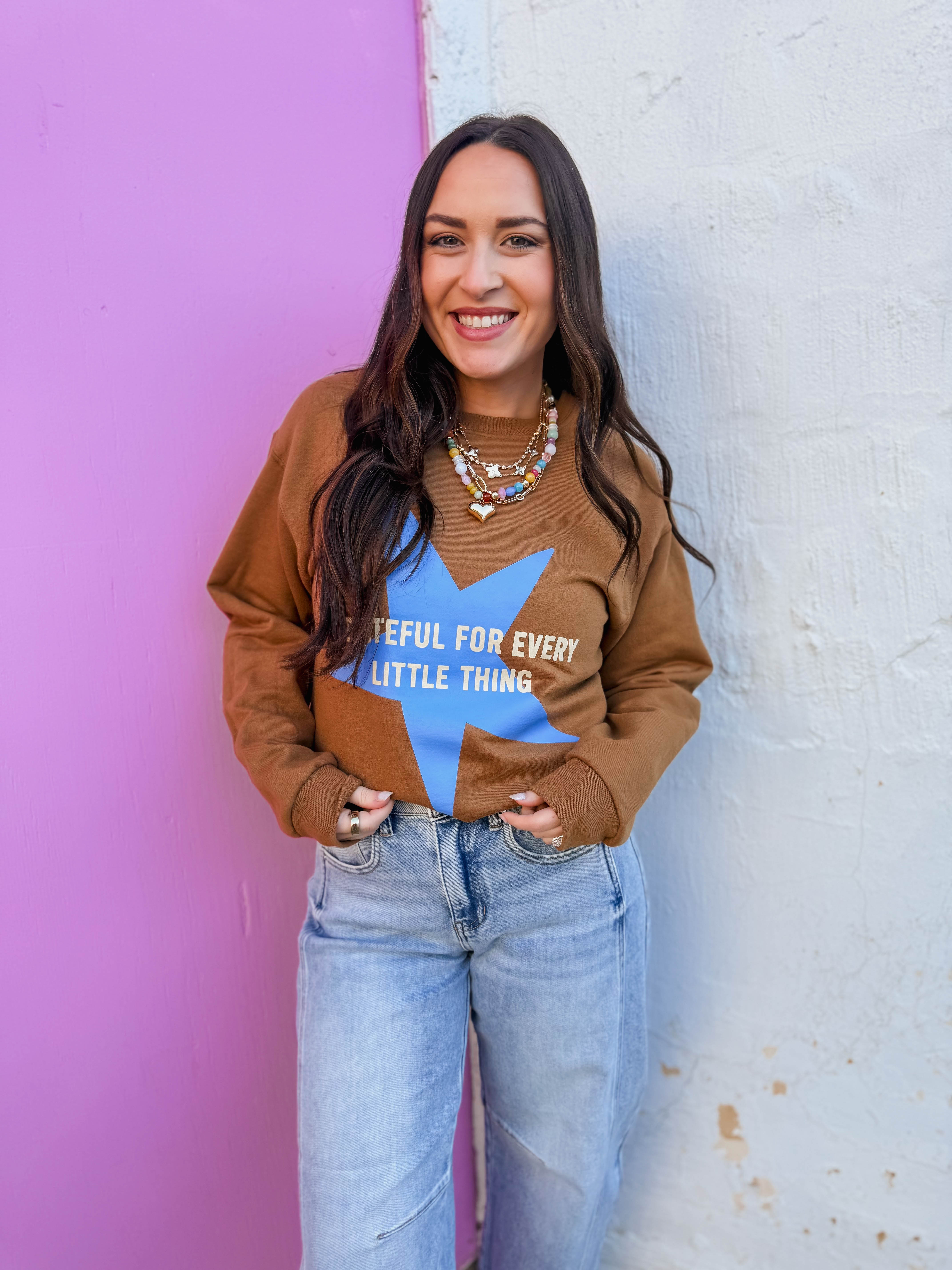 Cozy up in the Grateful For Every Little Thing Crewneck! This fleece-lined sweatshirt features a cute grateful star graphic, long sleeves, and a classic crew neckline—perfect for adding a trendy, comfy touch to your look.