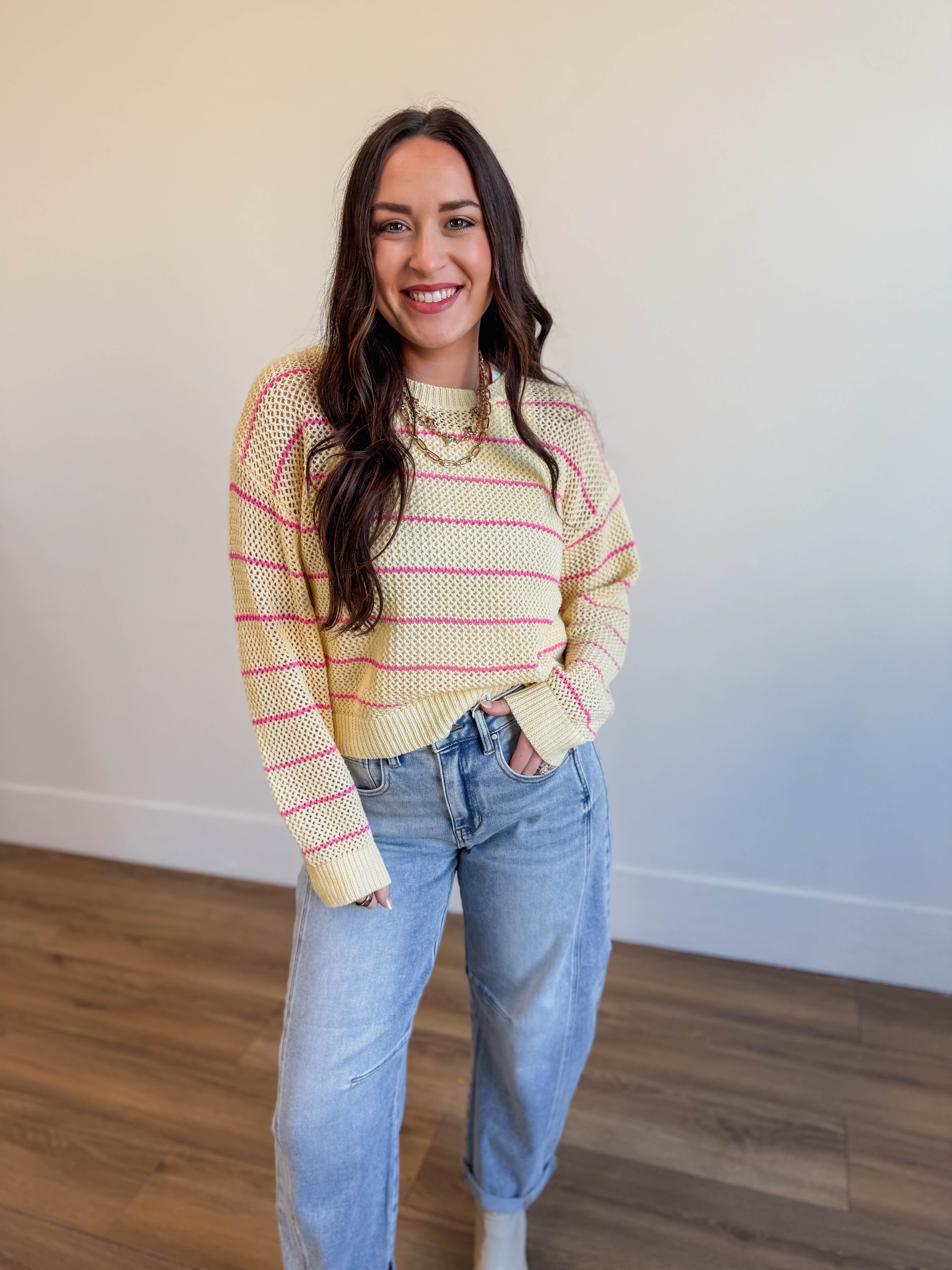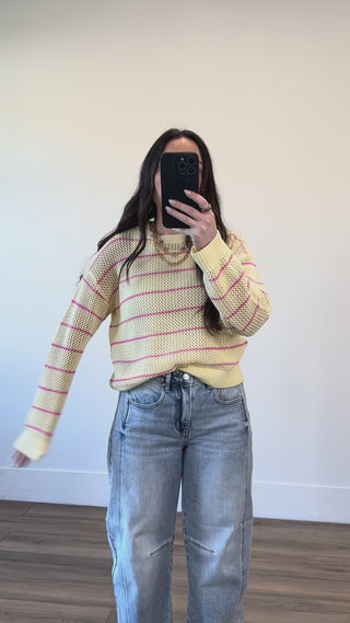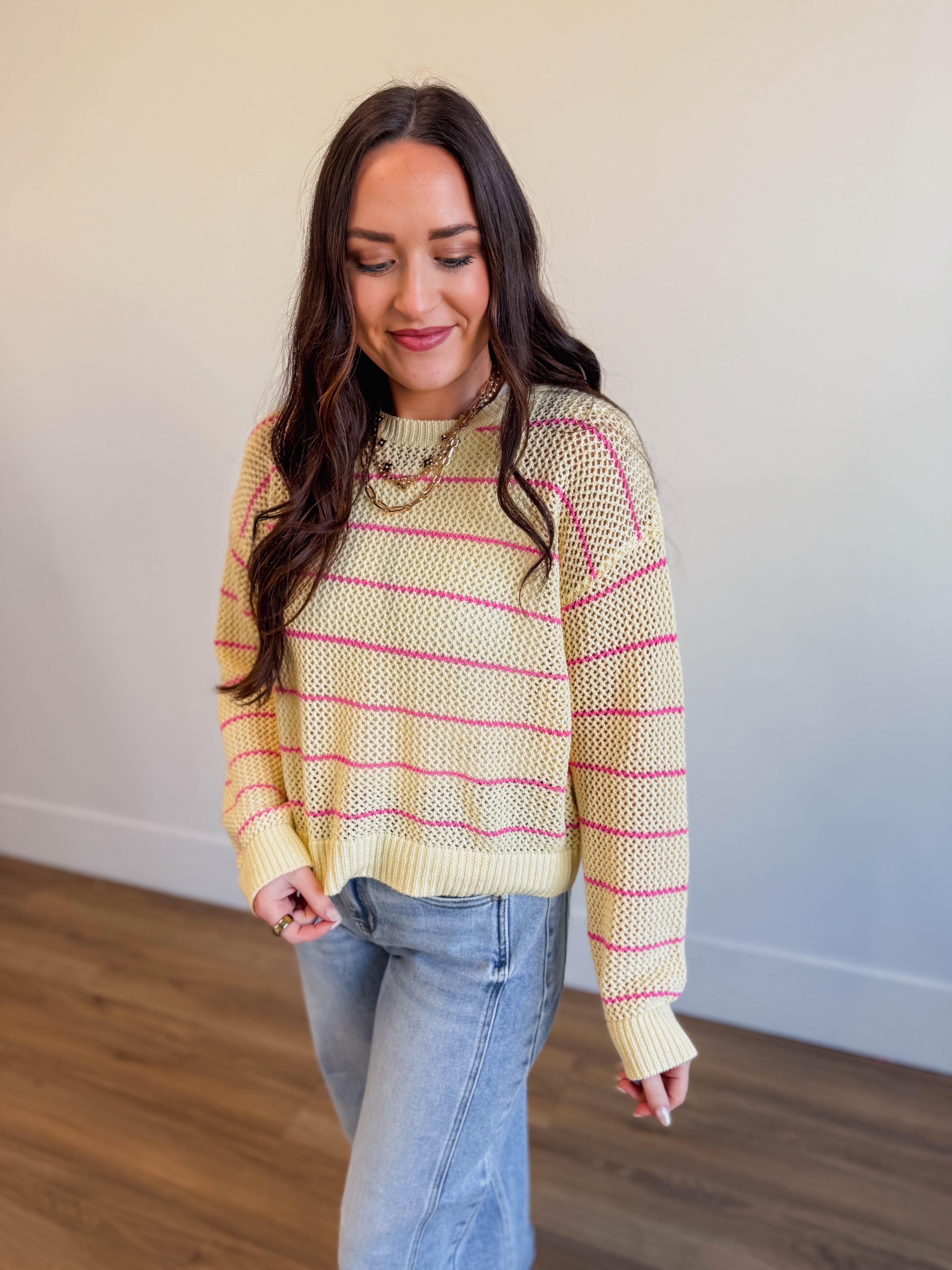 Meet your new seasonal favorite! The Kenna Striped Sweater is the perfect lightweight layer for warmer days. Featuring a crew neckline, long sleeves, and an open knit design, this pullover strikes the ideal balance between cozy and breathable. The fun striped pattern adds a pop of personality, while the semi-sheer fabric keeps things fresh and flowy. Toss it on over a tank or even your swimsuit—either way, you've got effortless spring and summer style covered.