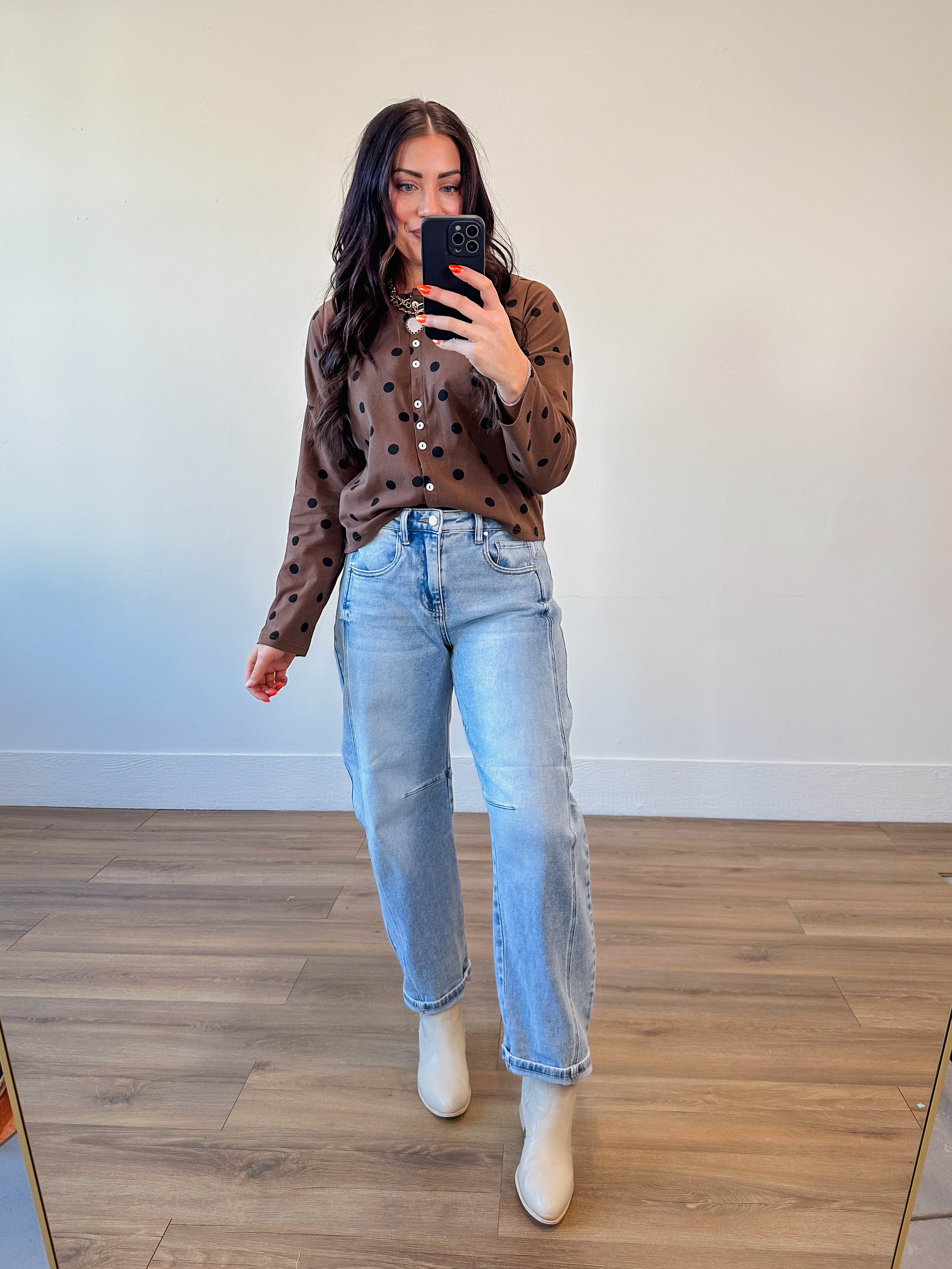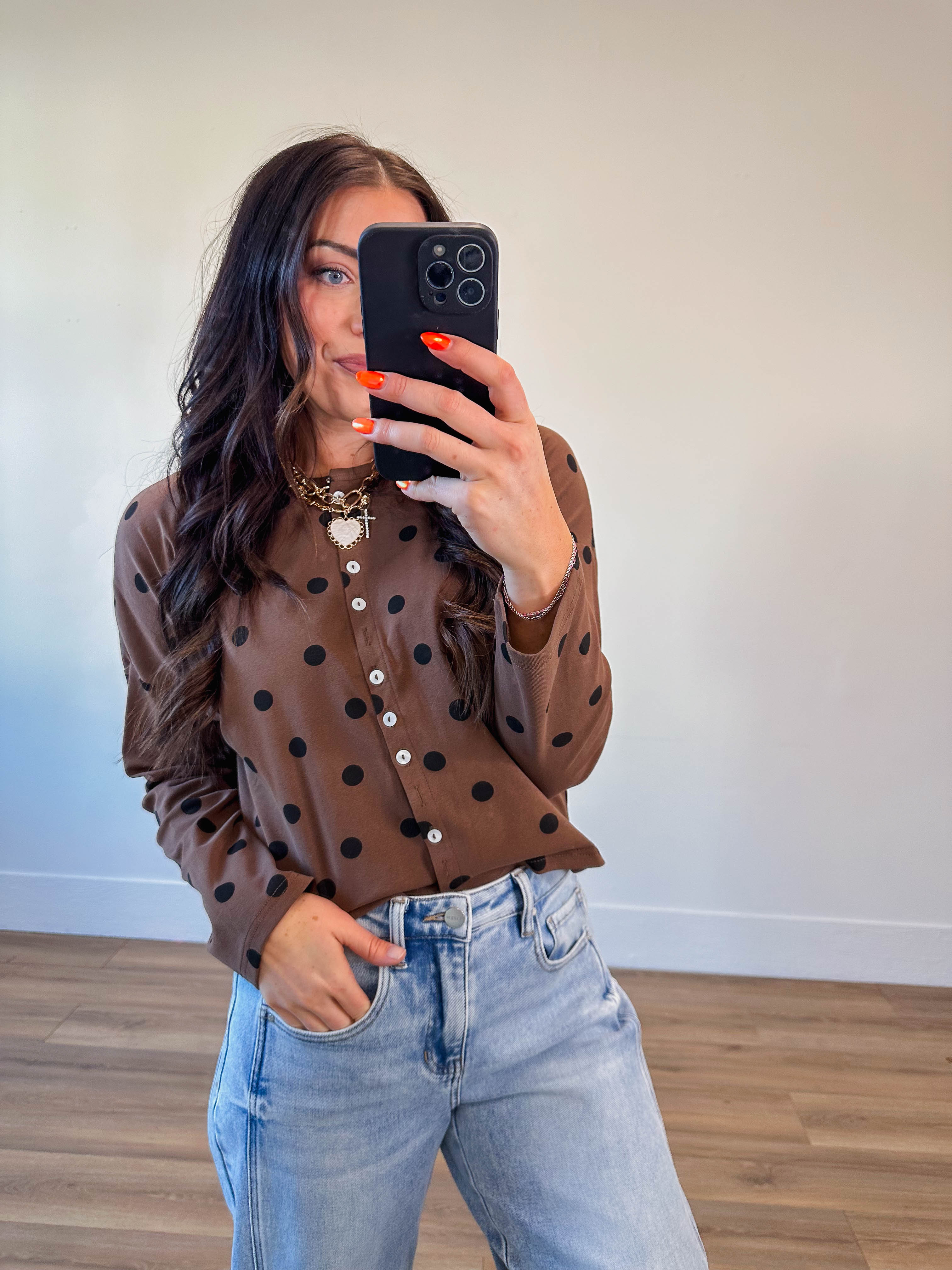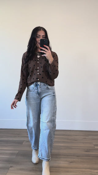 Effortlessly chic, the Sweet Spot Cardi transitions from office to weekend with ease. Featuring a classic round neckline, long sleeves, and convenient button-front closure, it's the perfect layering piece. The playful polka dot pattern adds a fun, trendy touch that keeps things interesting.