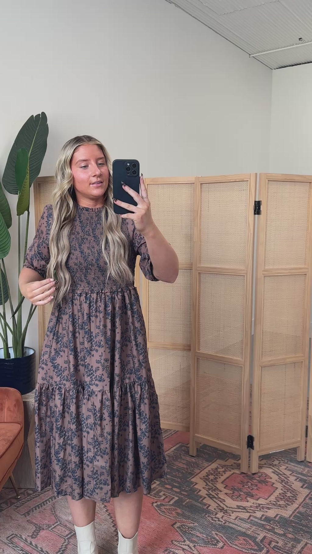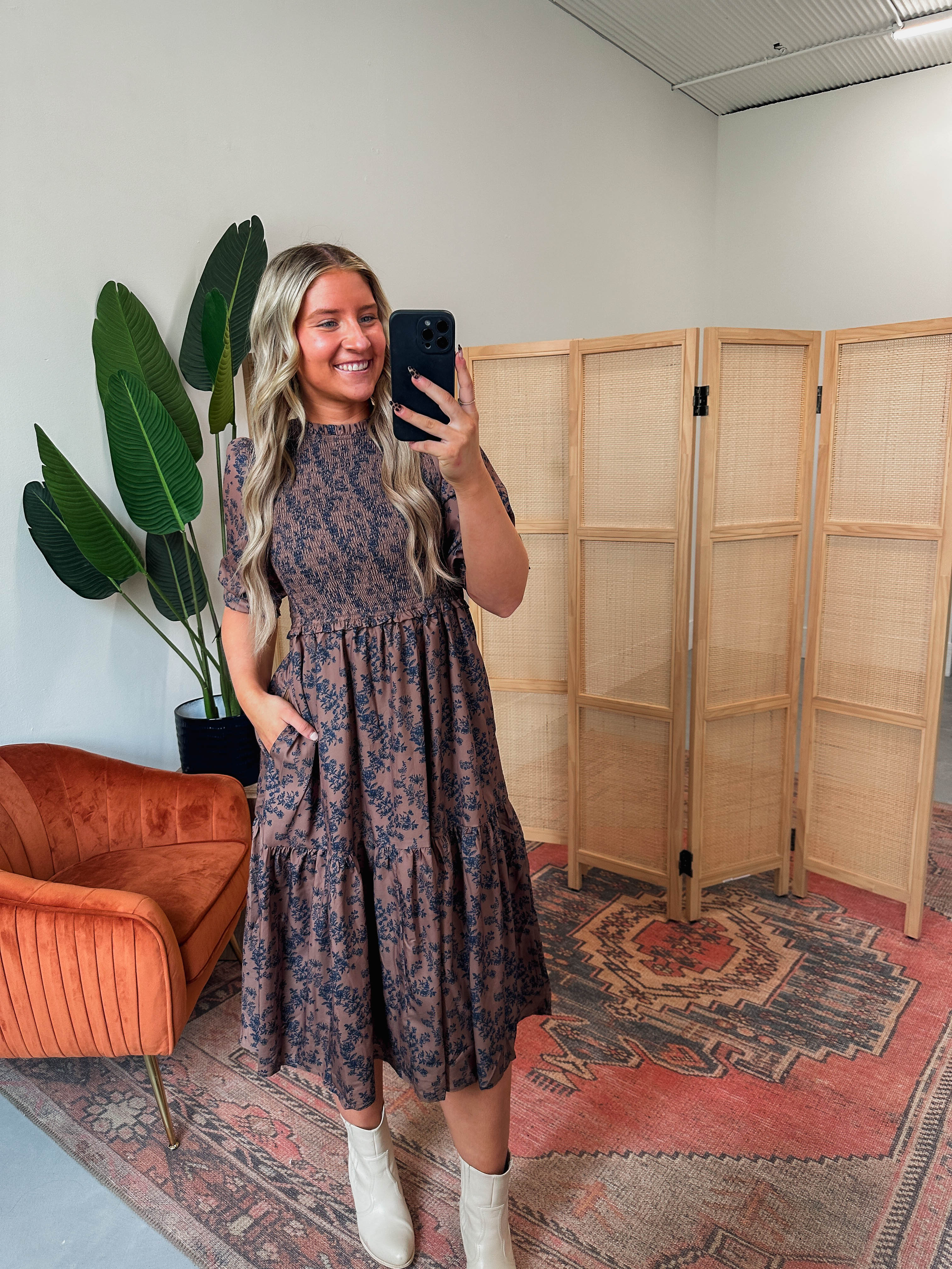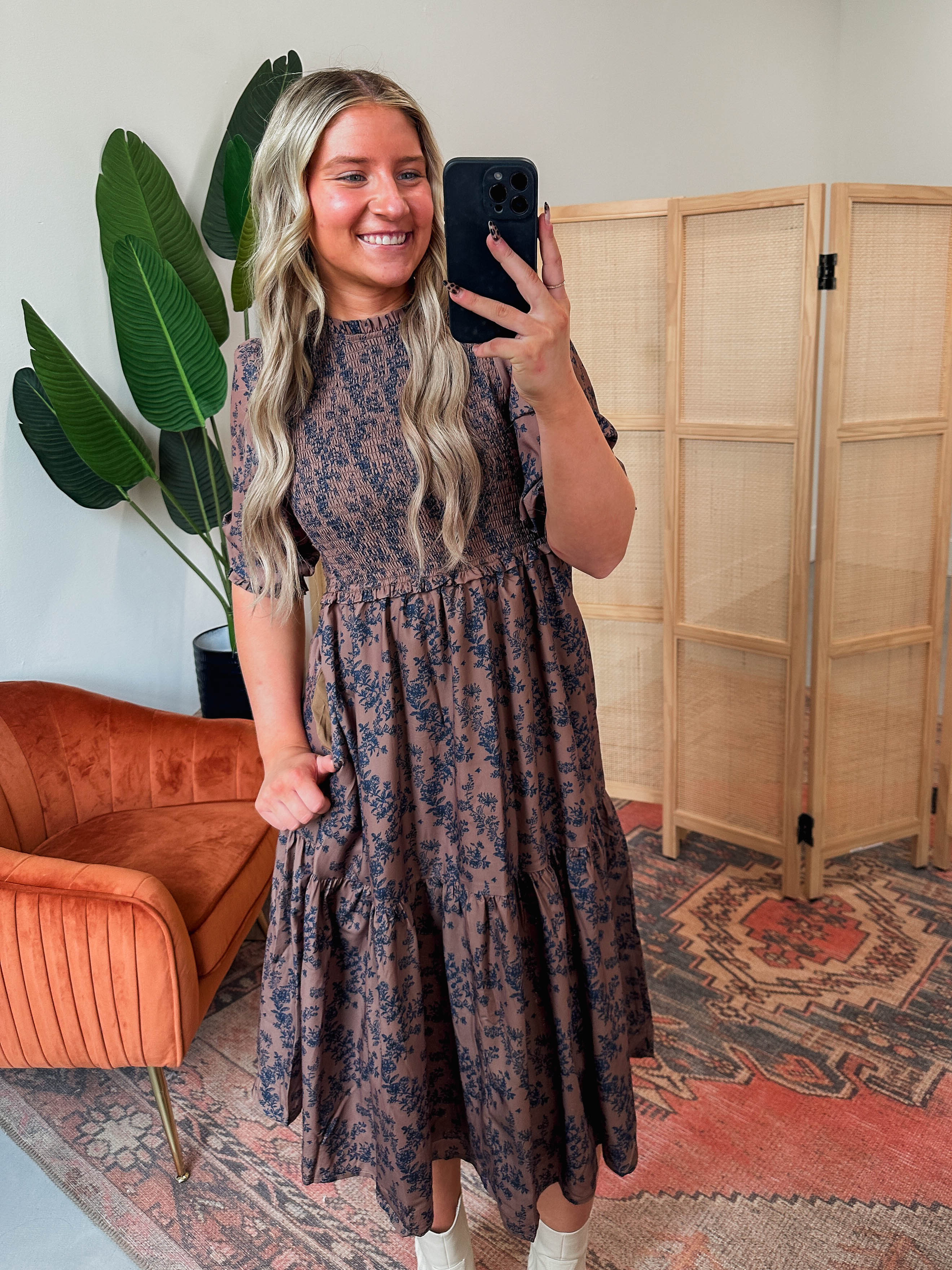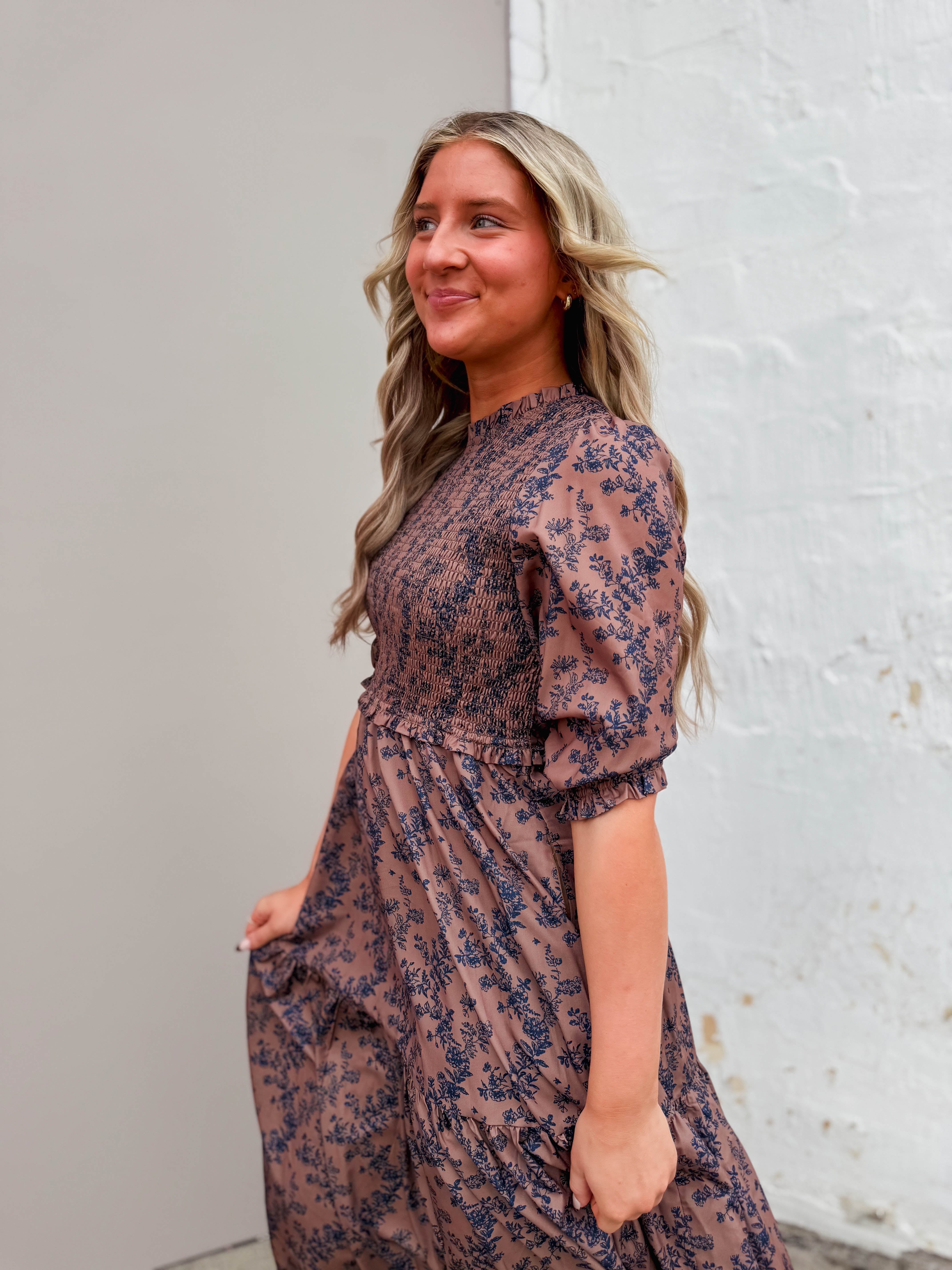 The Ophelia Floral Midi Dress features a charming crew neckline, half sleeves with elastic cuffs, and a smocked bodice for a comfy fit. With side pockets and a playful floral pattern, it’s the perfect pick for fall family photos or weddings. Easy, cute, and ready to impress!