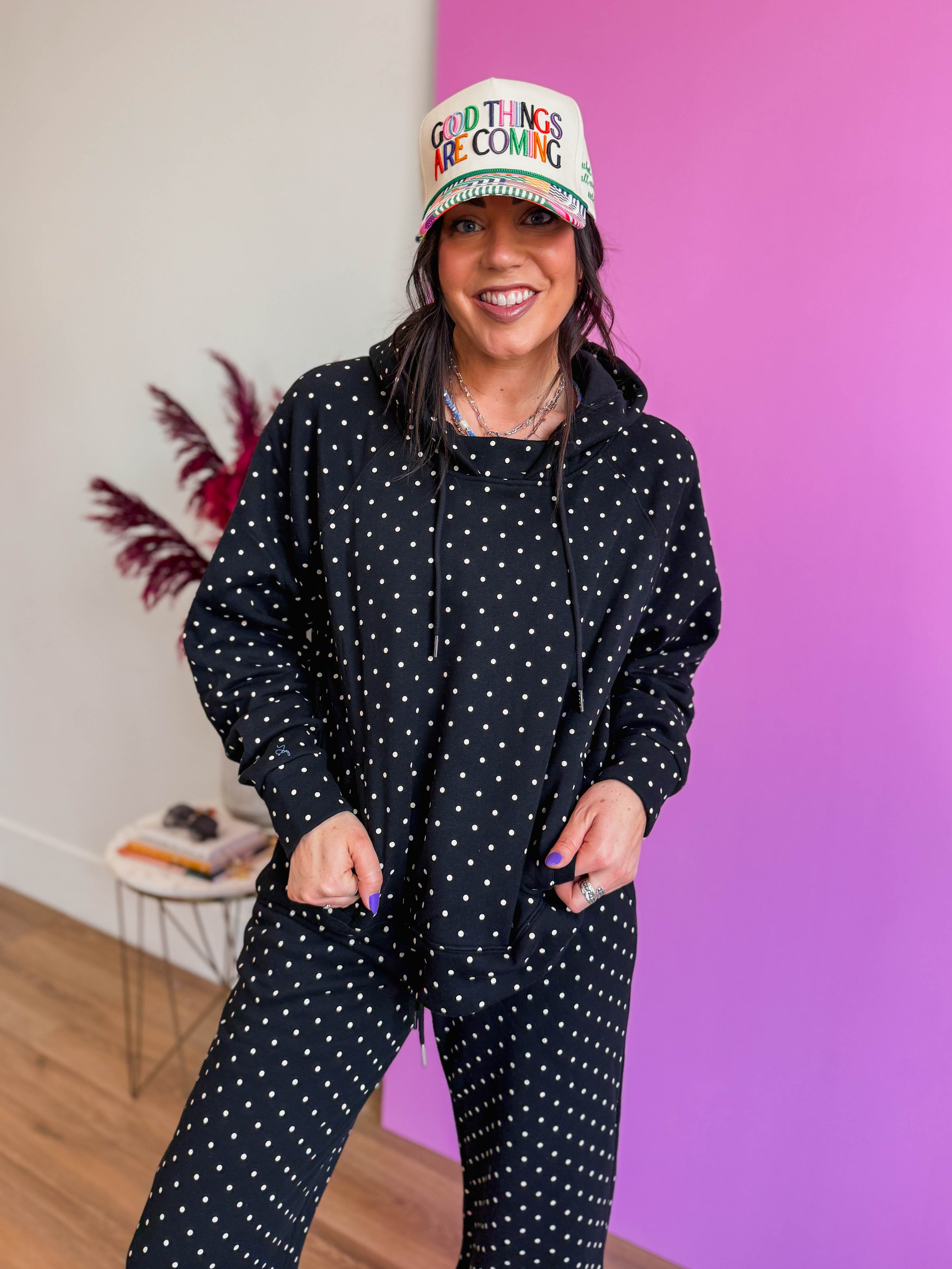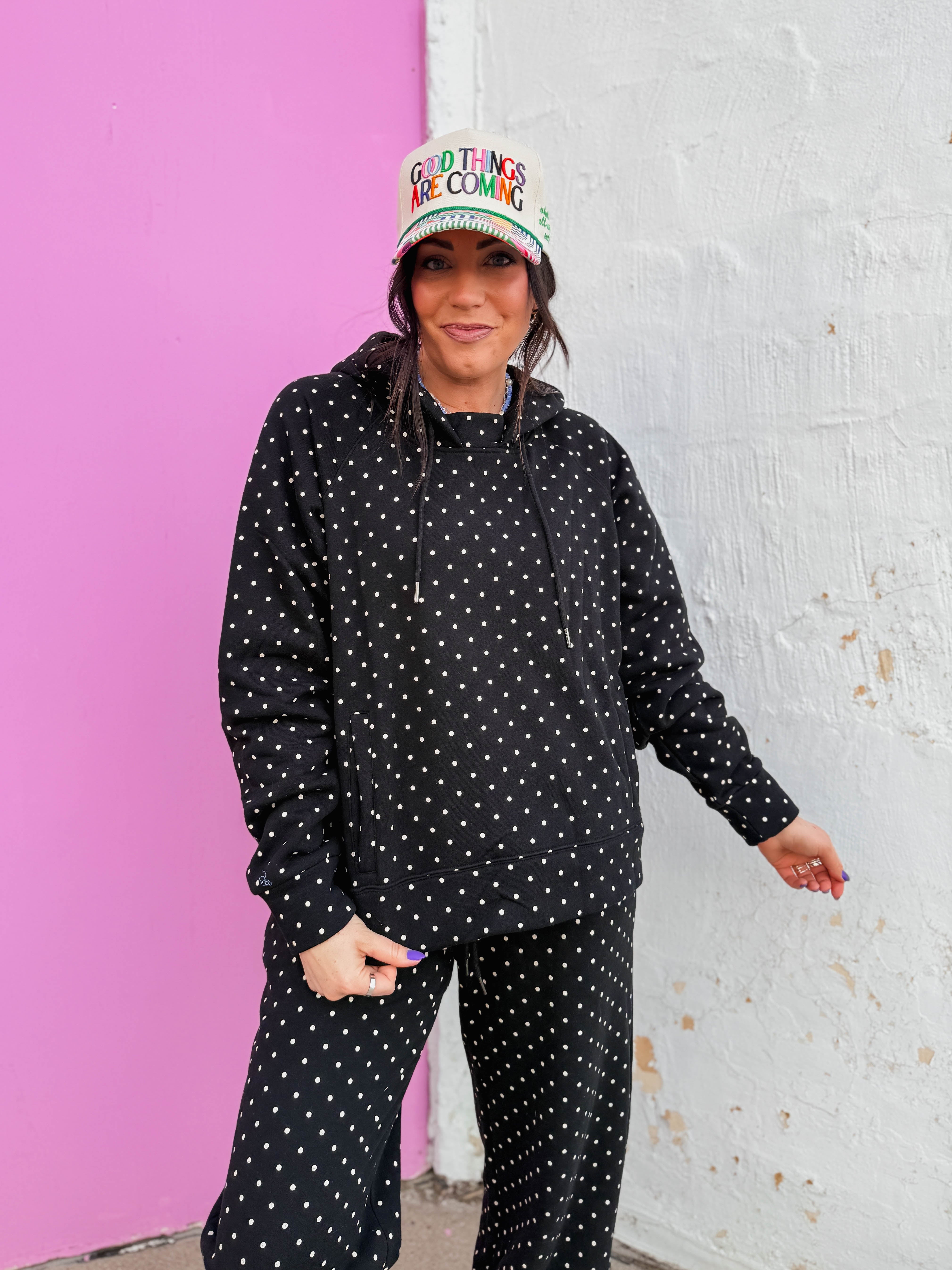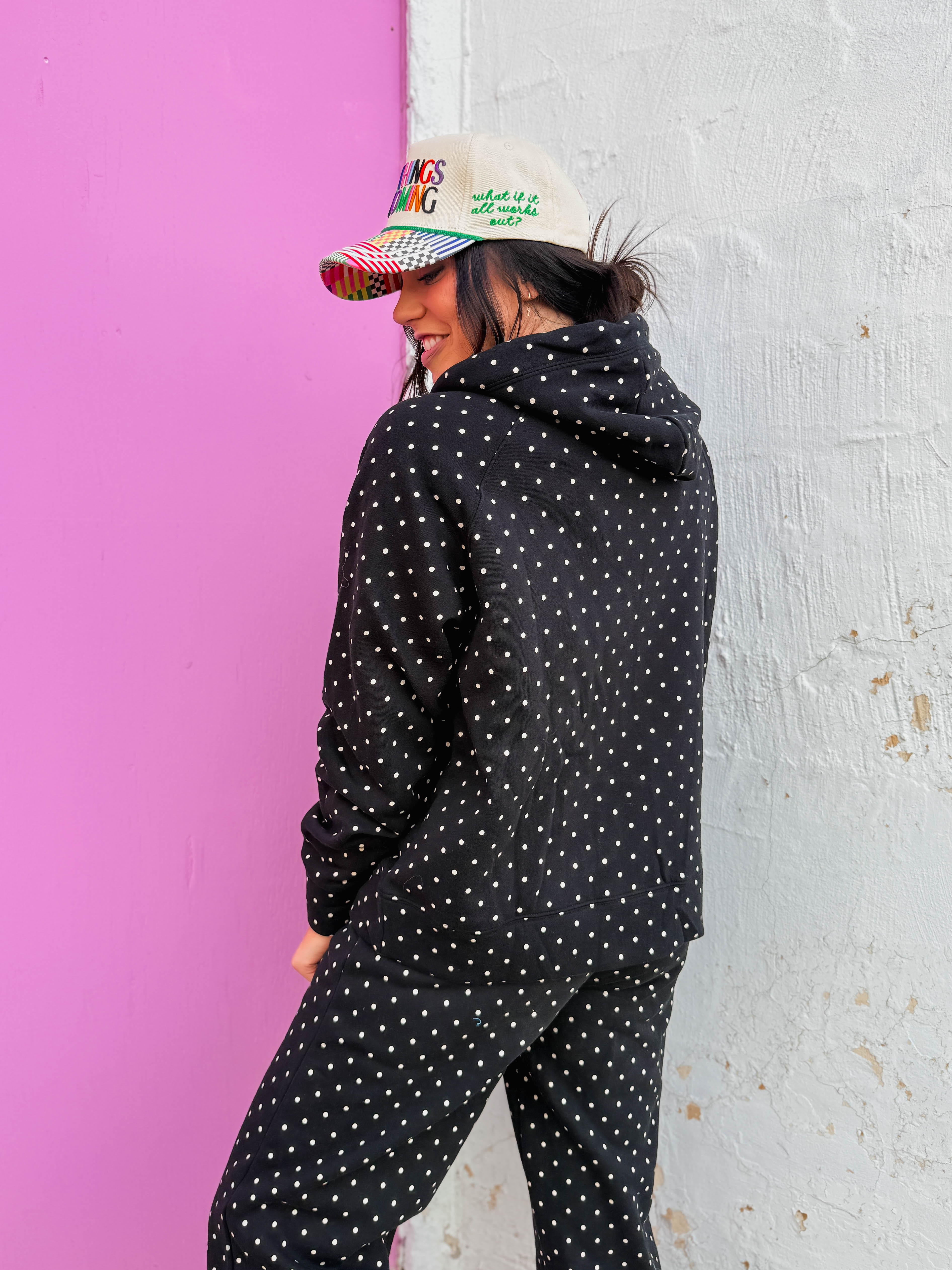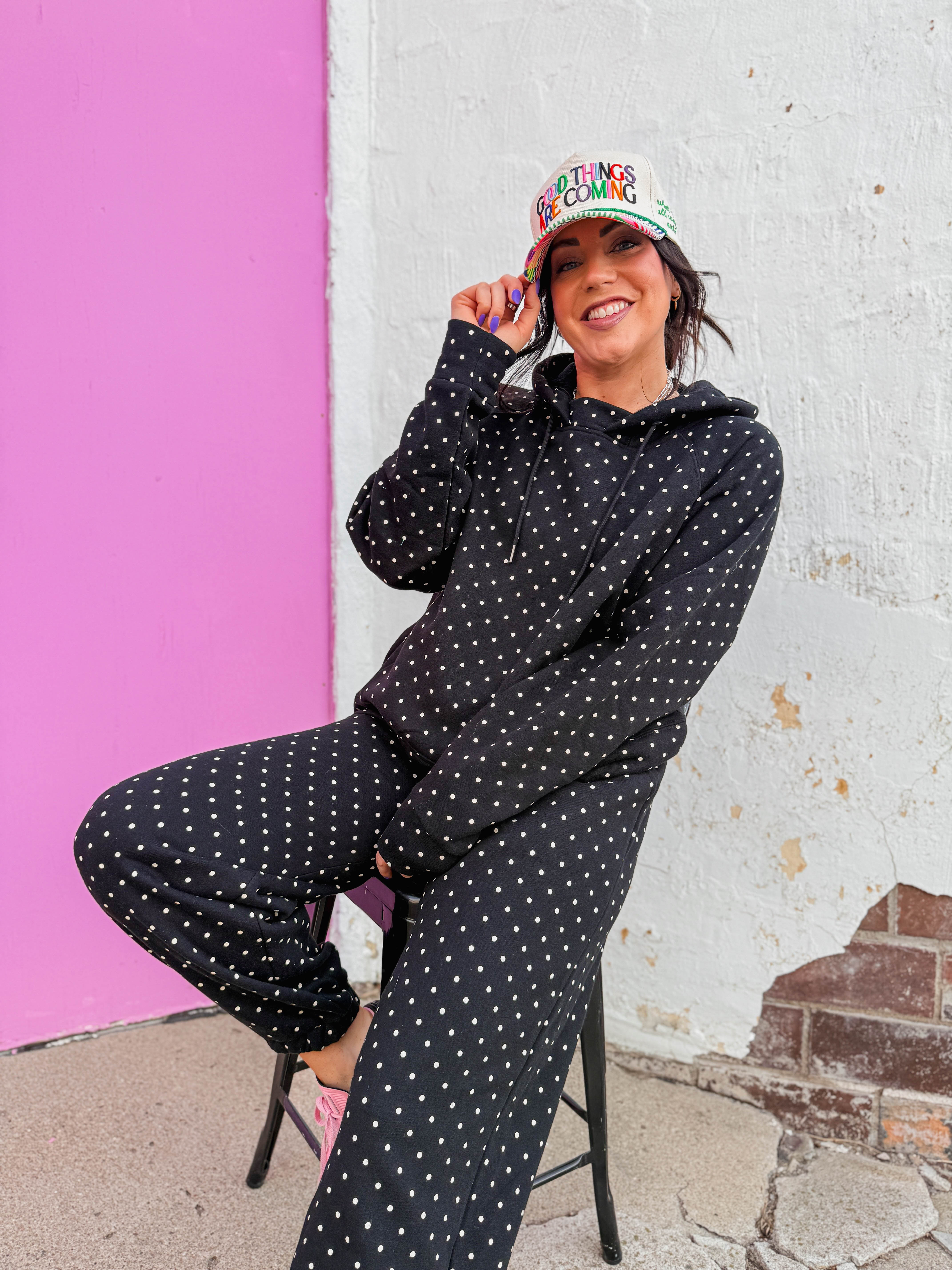 Cozy up in the Chill Spot Hoodie, perfect for relaxed lounge days and casual comfort. The soft fabric keeps you warm while the playful polka dot pattern brings cheerful style to your downtime wardrobe. Designed with a matching pants set available separately, you can create a coordinated lounge look that feels put-together even when you're staying home.