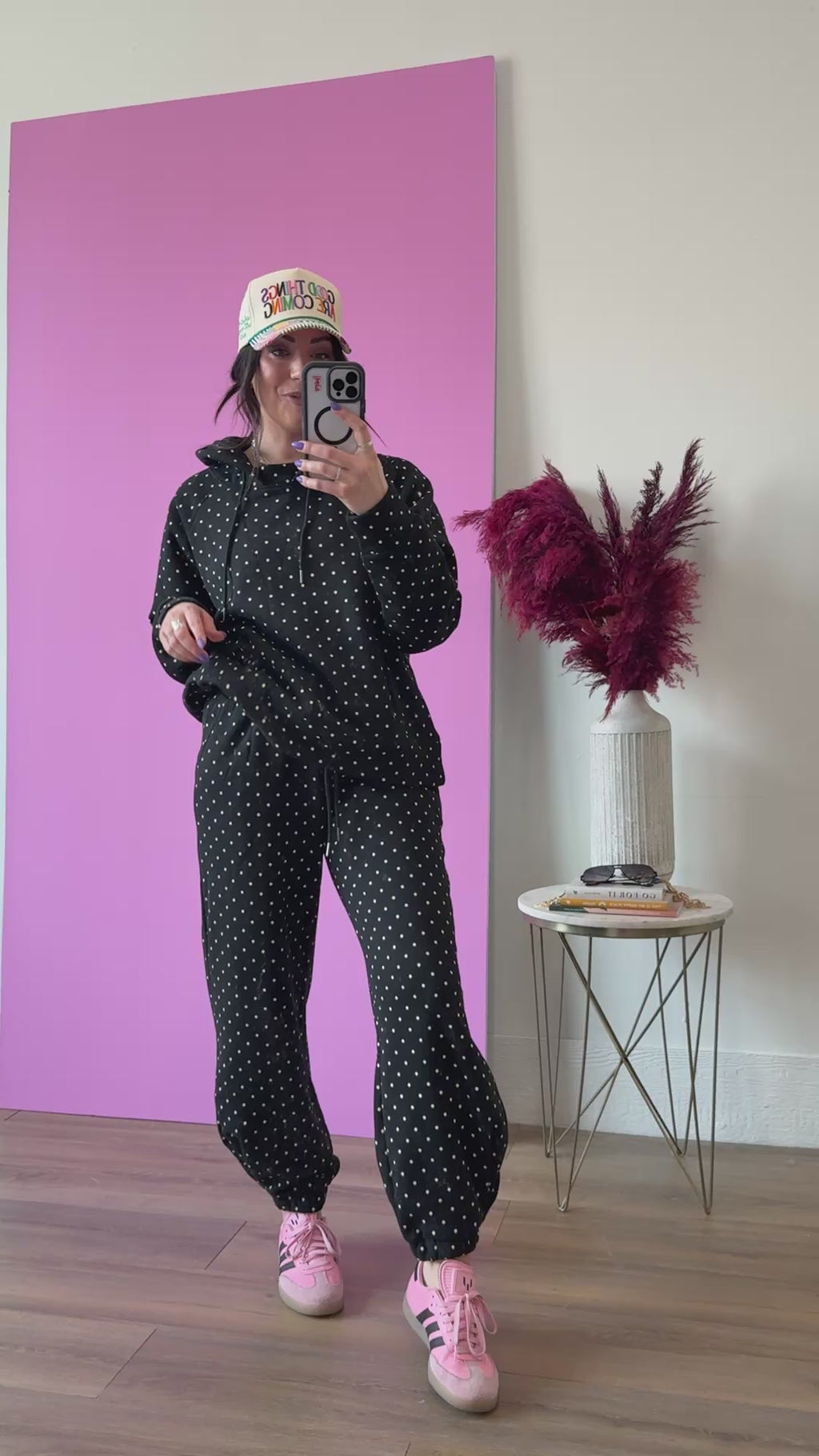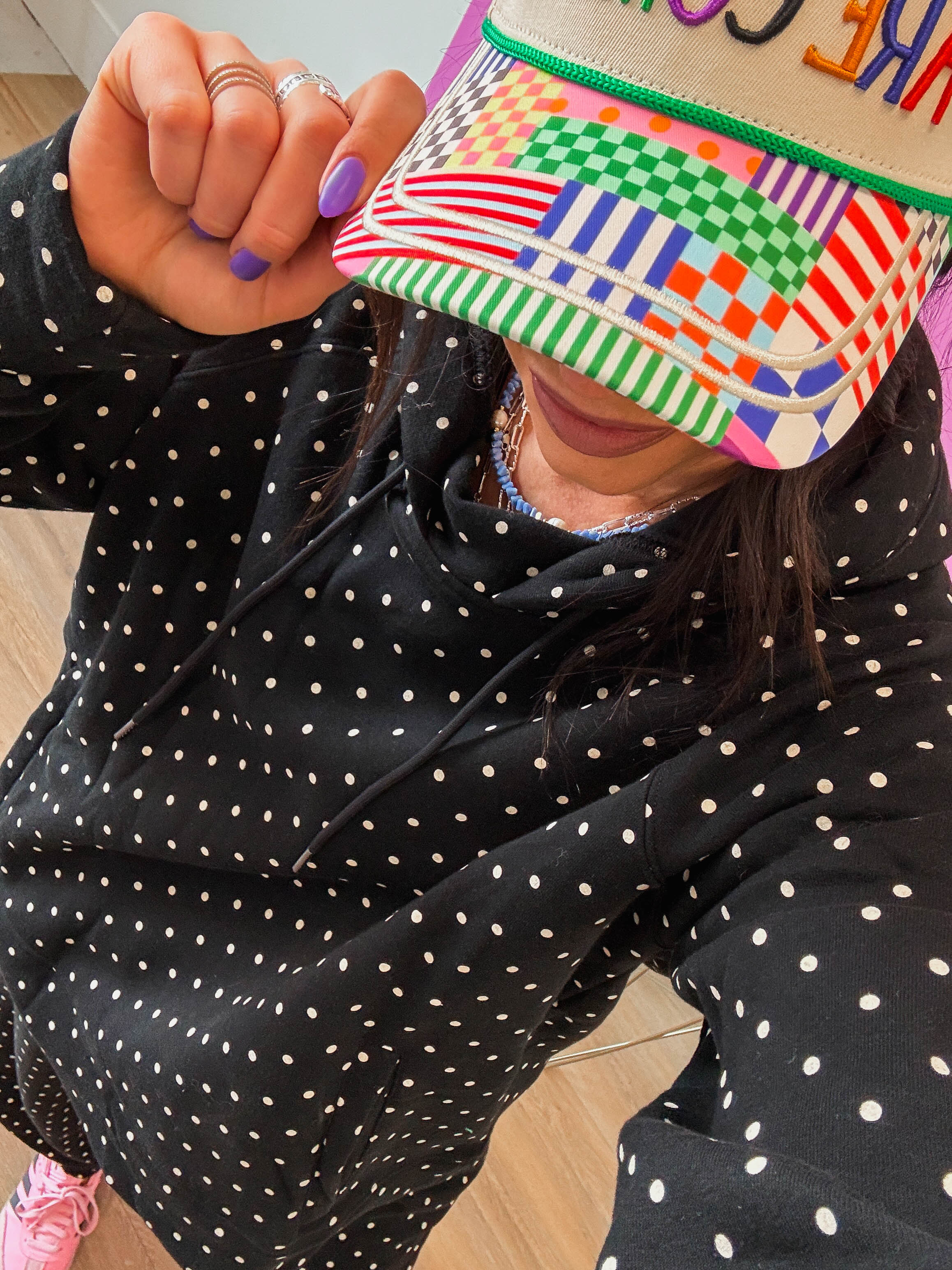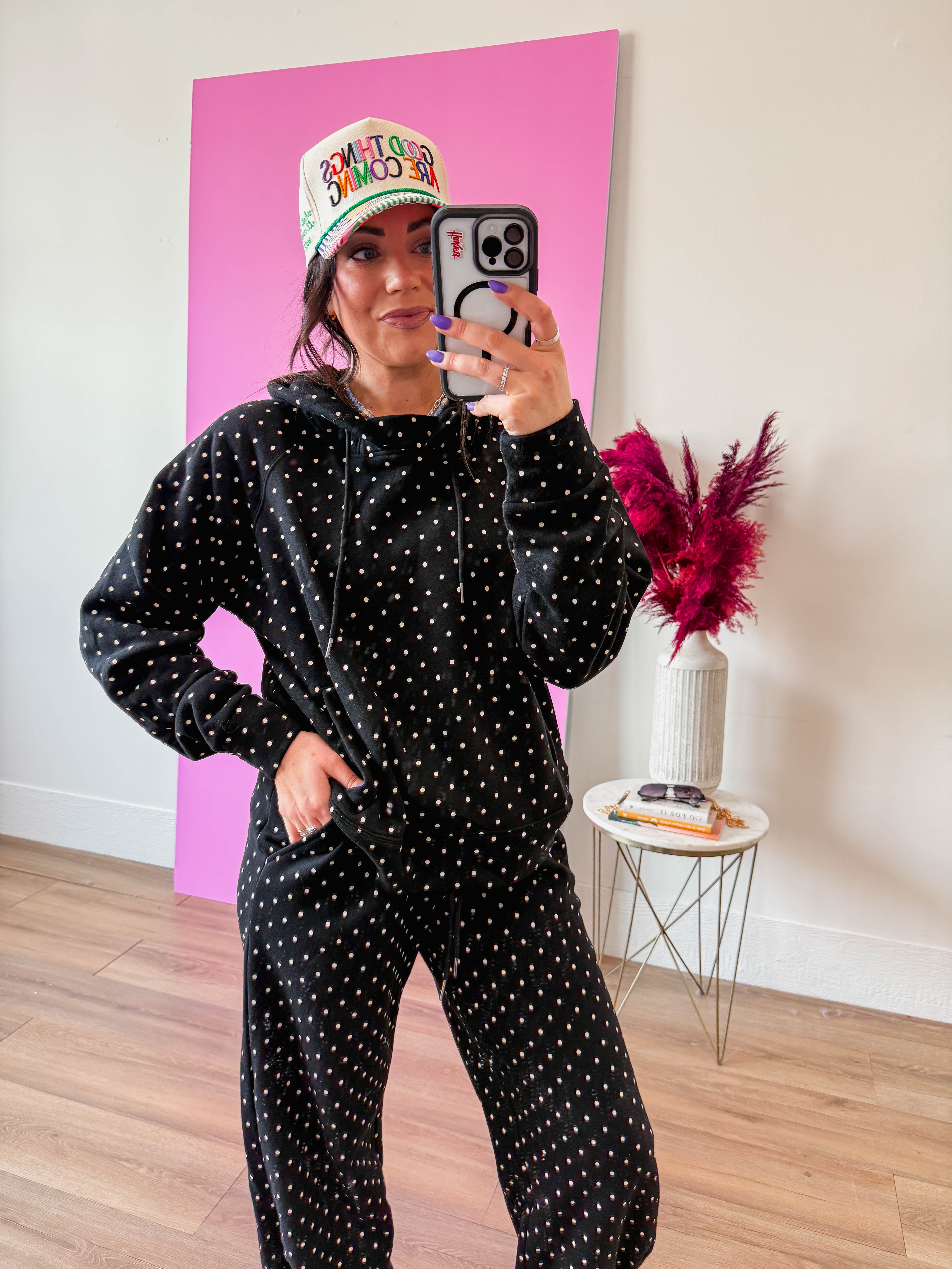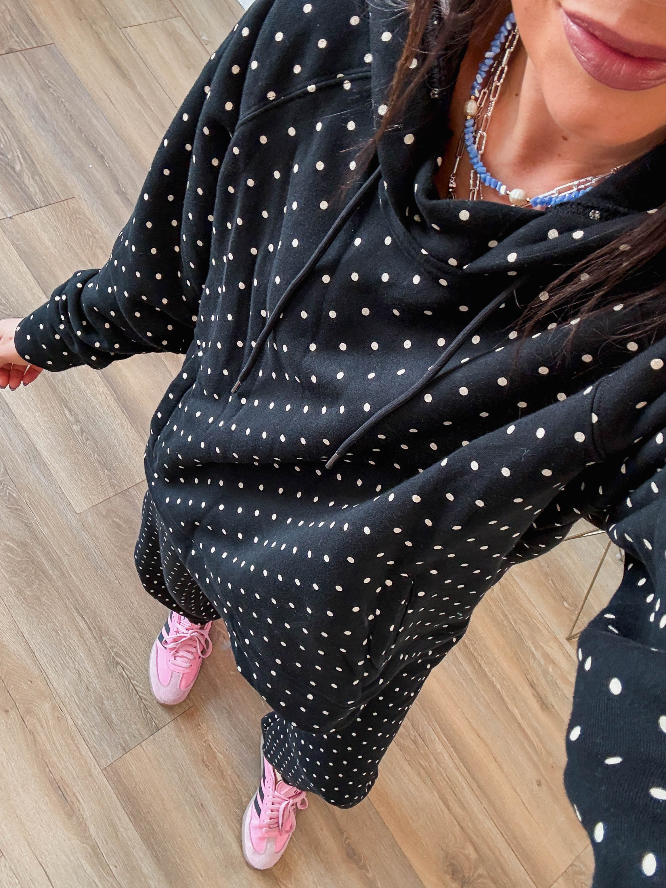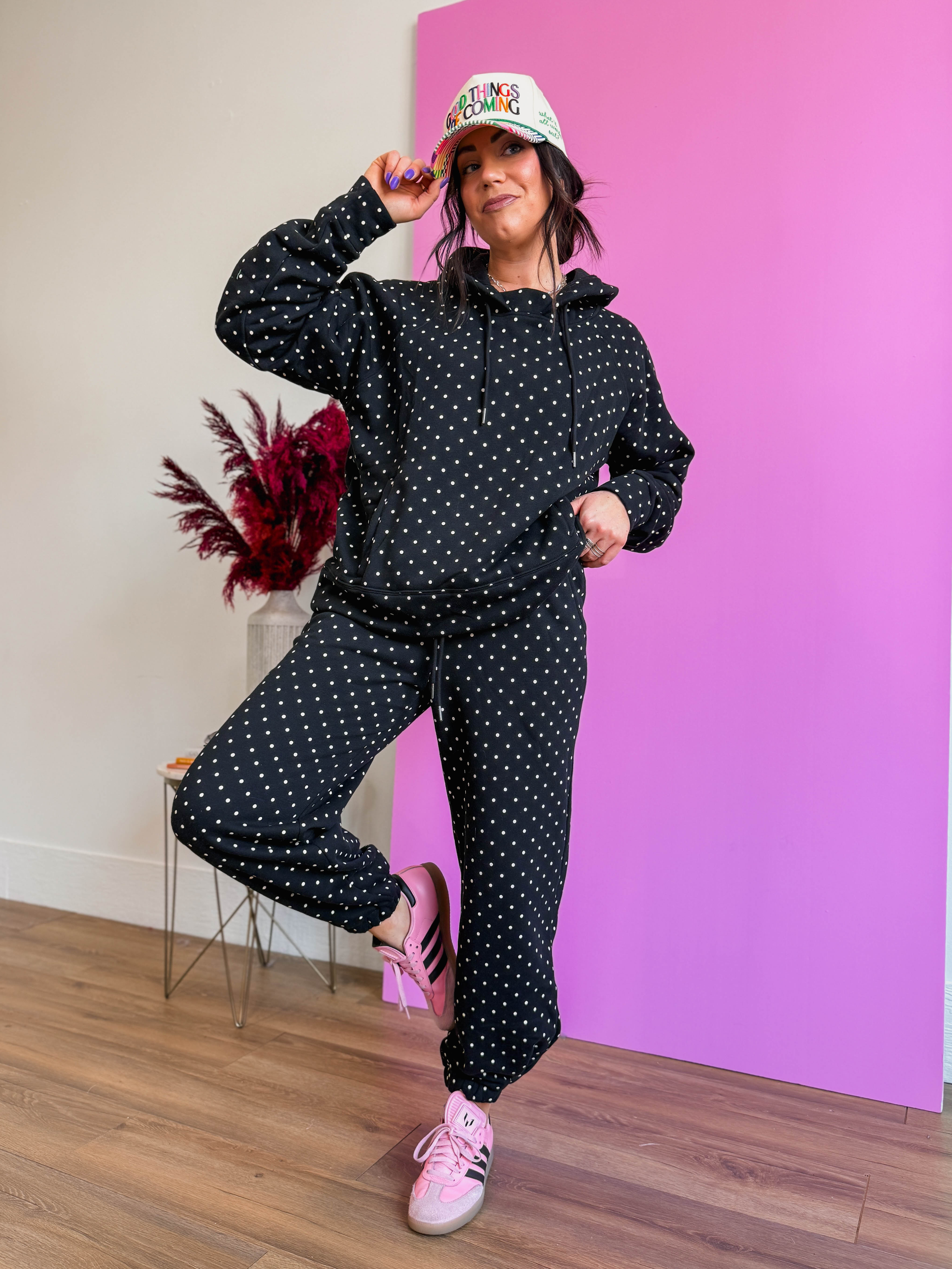 Cozy up in the Chill Spot Hoodie, perfect for relaxed lounge days and casual comfort. The soft fabric keeps you warm while the playful polka dot pattern brings cheerful style to your downtime wardrobe. Designed with a matching pants set available separately, you can create a coordinated lounge look that feels put-together even when you're staying home.