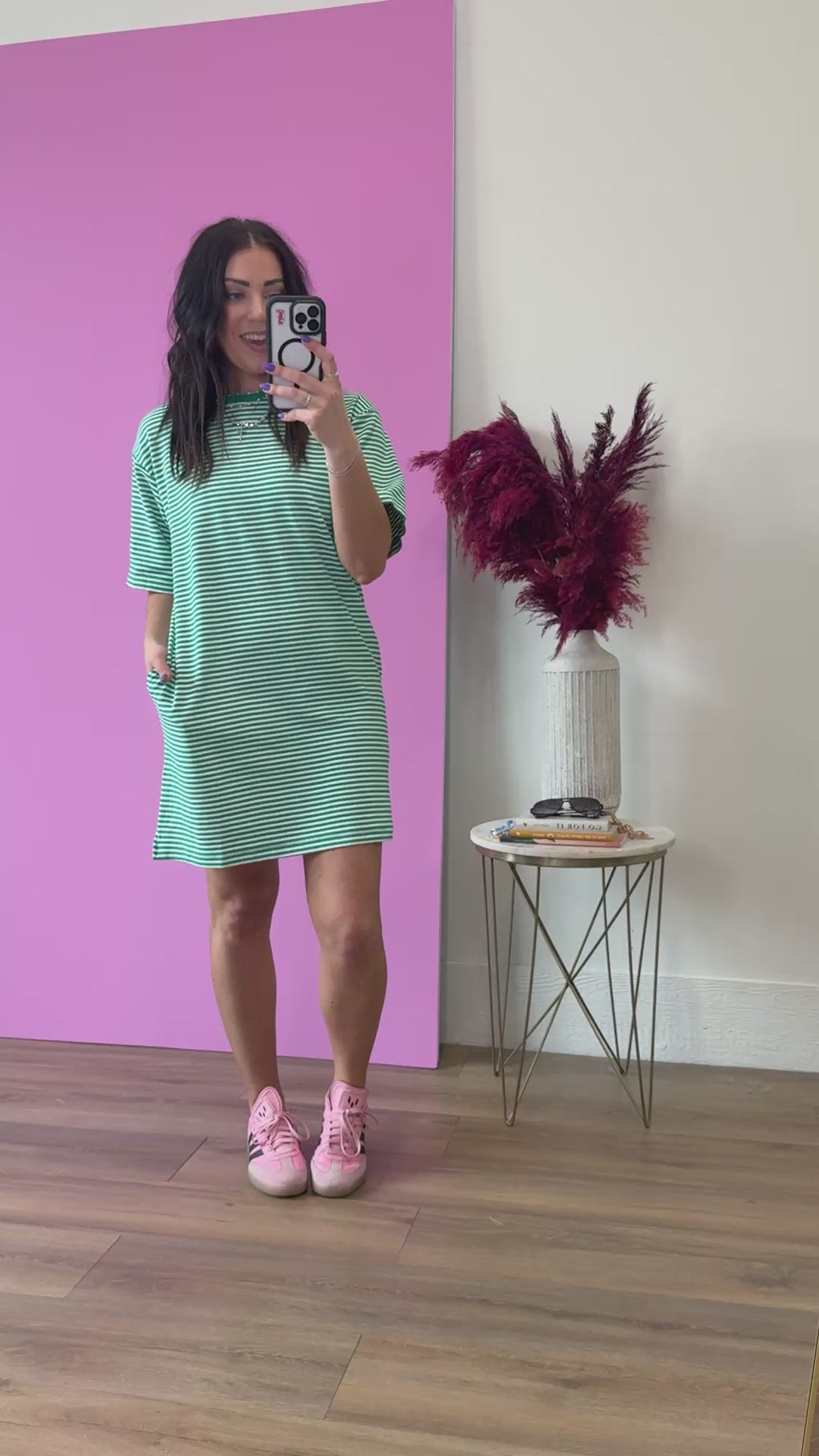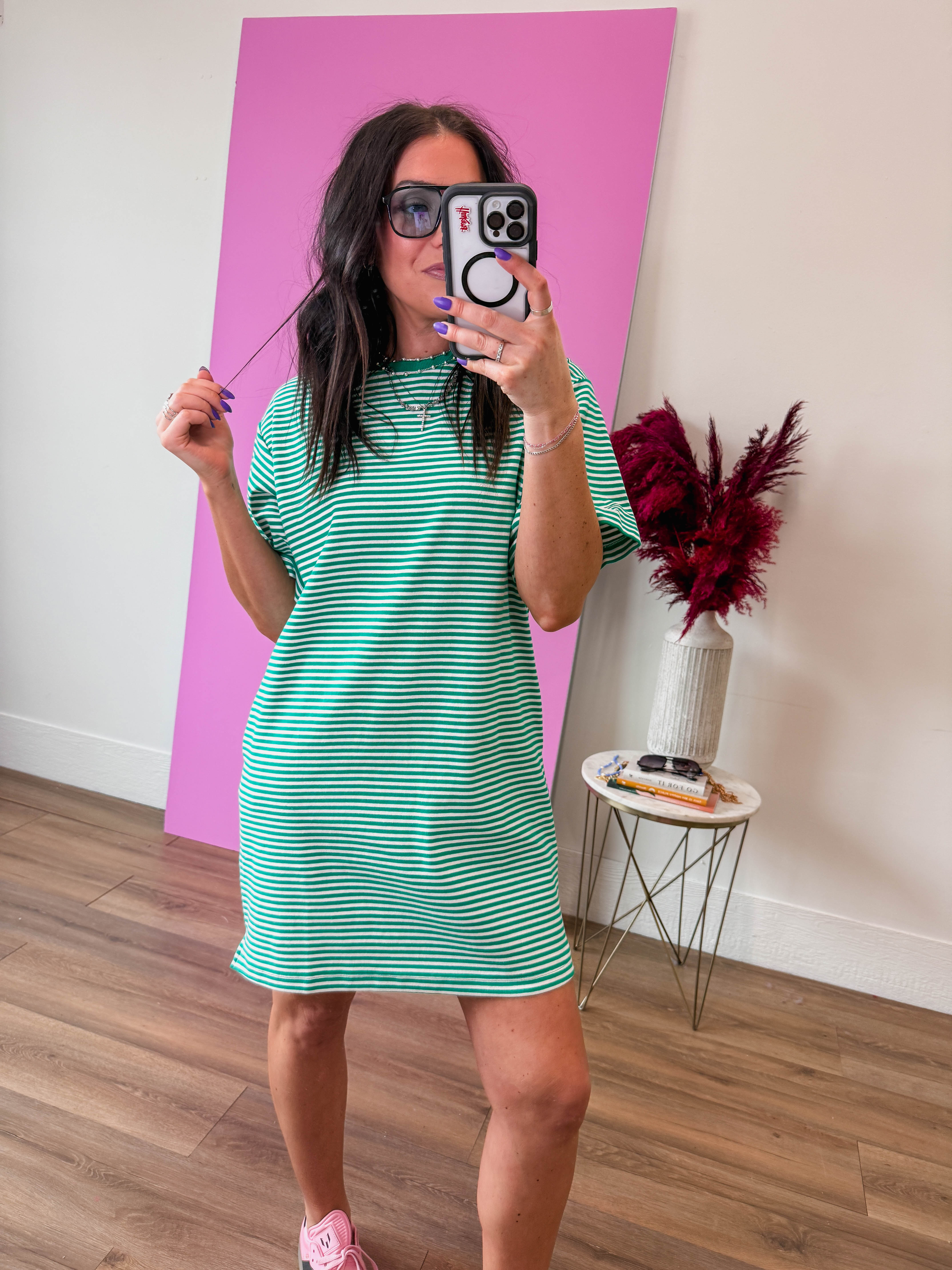 Rock a playful, effortless look with this green striped mini t-shirt dress, perfect for casual days and relaxed outings. Crafted from soft, breathable fabric, this dress works beautifully on its own or layered with jackets, cardigans, or denim shirts for cooler weather. Style it with sneakers for a laid-back vibe or dress it up with boots and accessories for a night out.