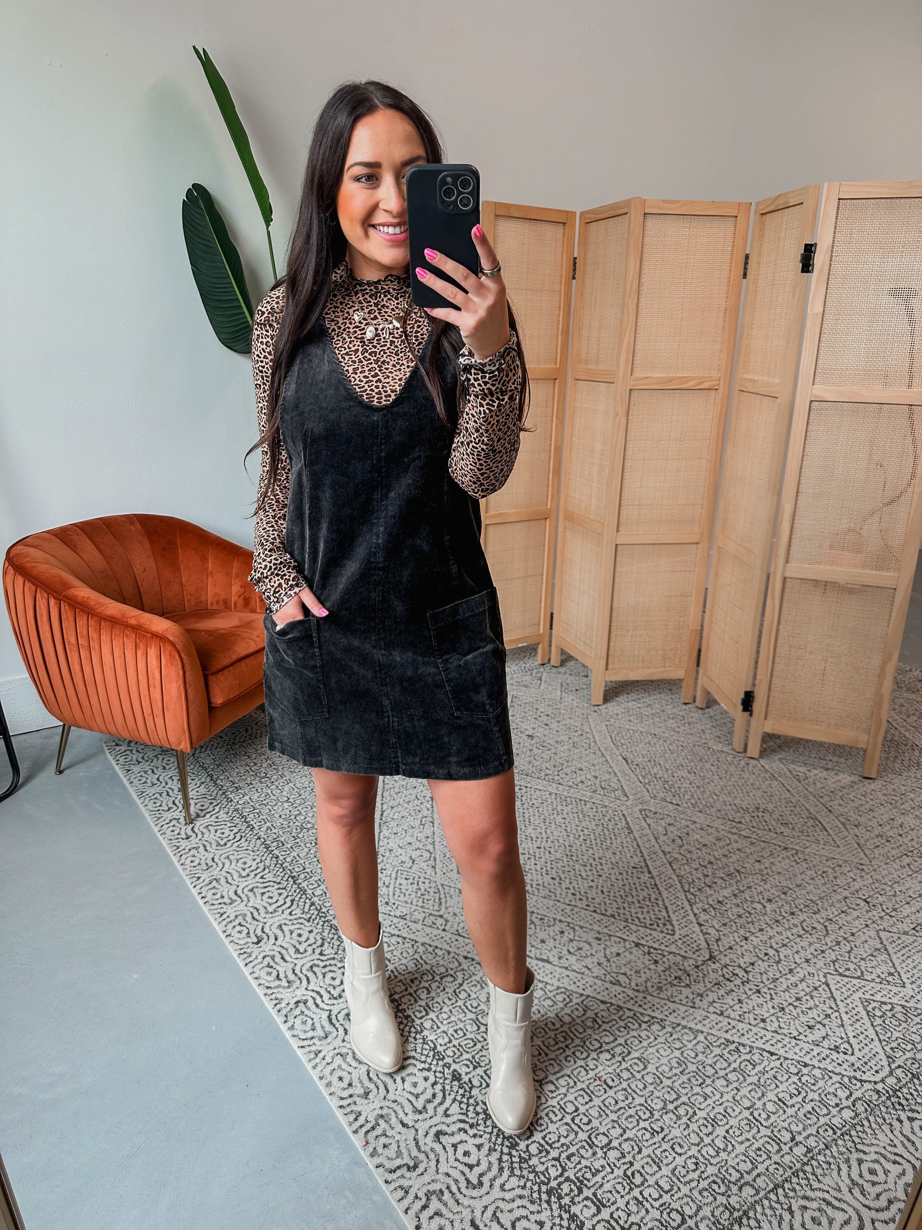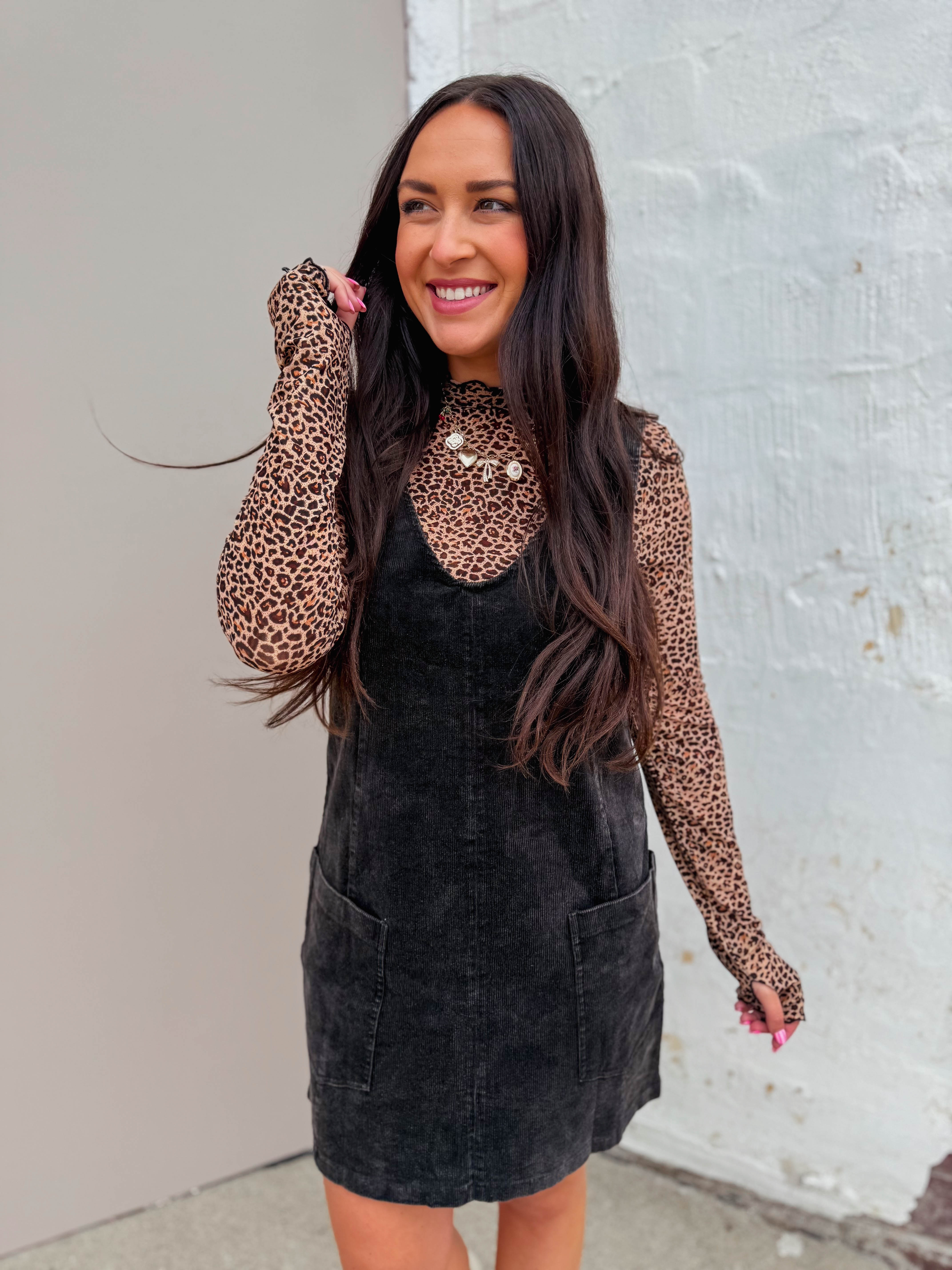 RESTOCK! This Adeline Corduroy Overall Dress in black features a cozy corduroy fabric with a trendy snow-washed finish. Its playful V-neckline and open back add a flirty touch, while adjustable straps and front pockets keep it practical. Perfect for fall family photos and chilly days, it’s a fun, stylish pick for the season.