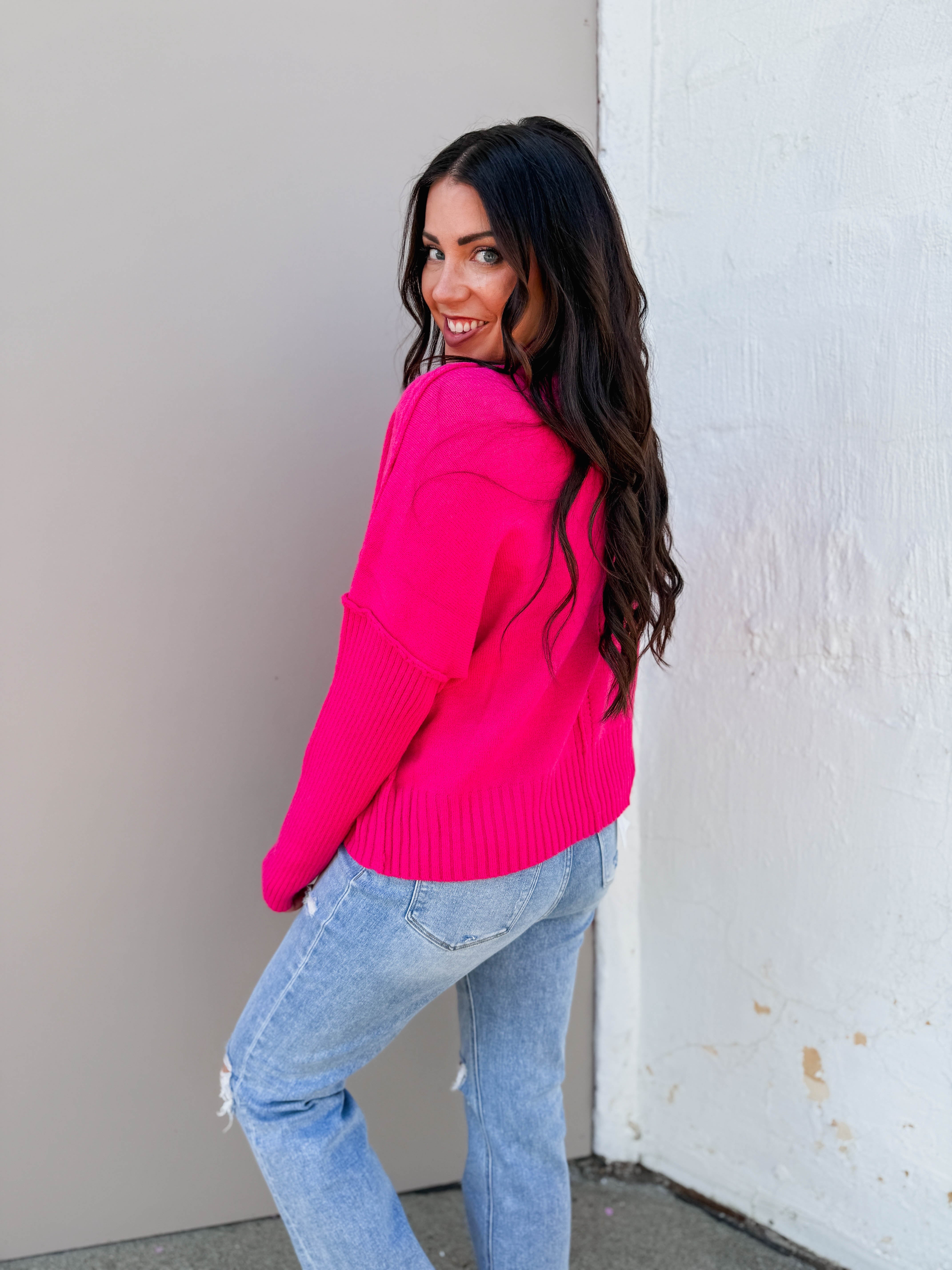 Stay cozy and stylish in the Alyssa Sweater in Hot Pink. Featuring a high neckline, long sleeves, and playful exposed seams with ribbed contrast, it’s perfect for taking you from work to weekend with ease. Brighten your day with a pop of color and comfy vibes!
