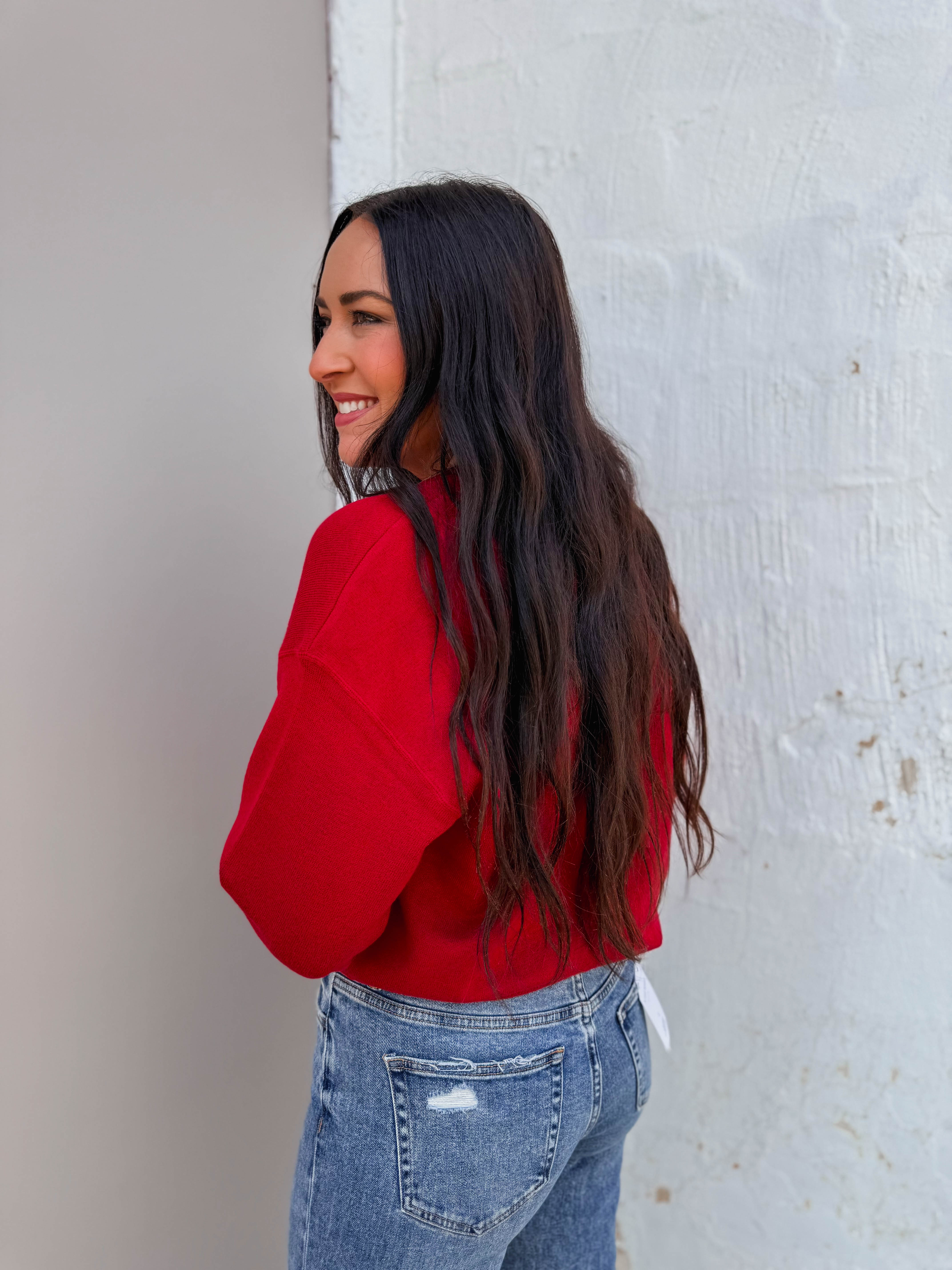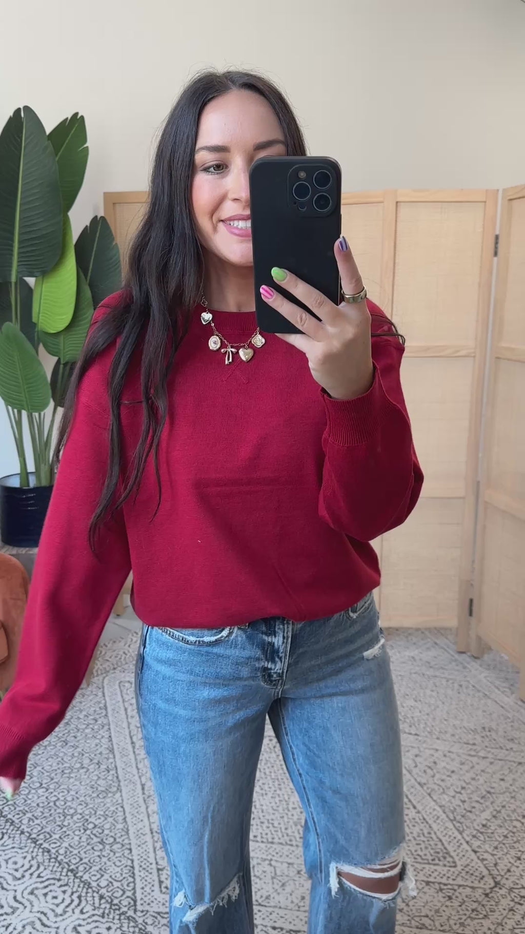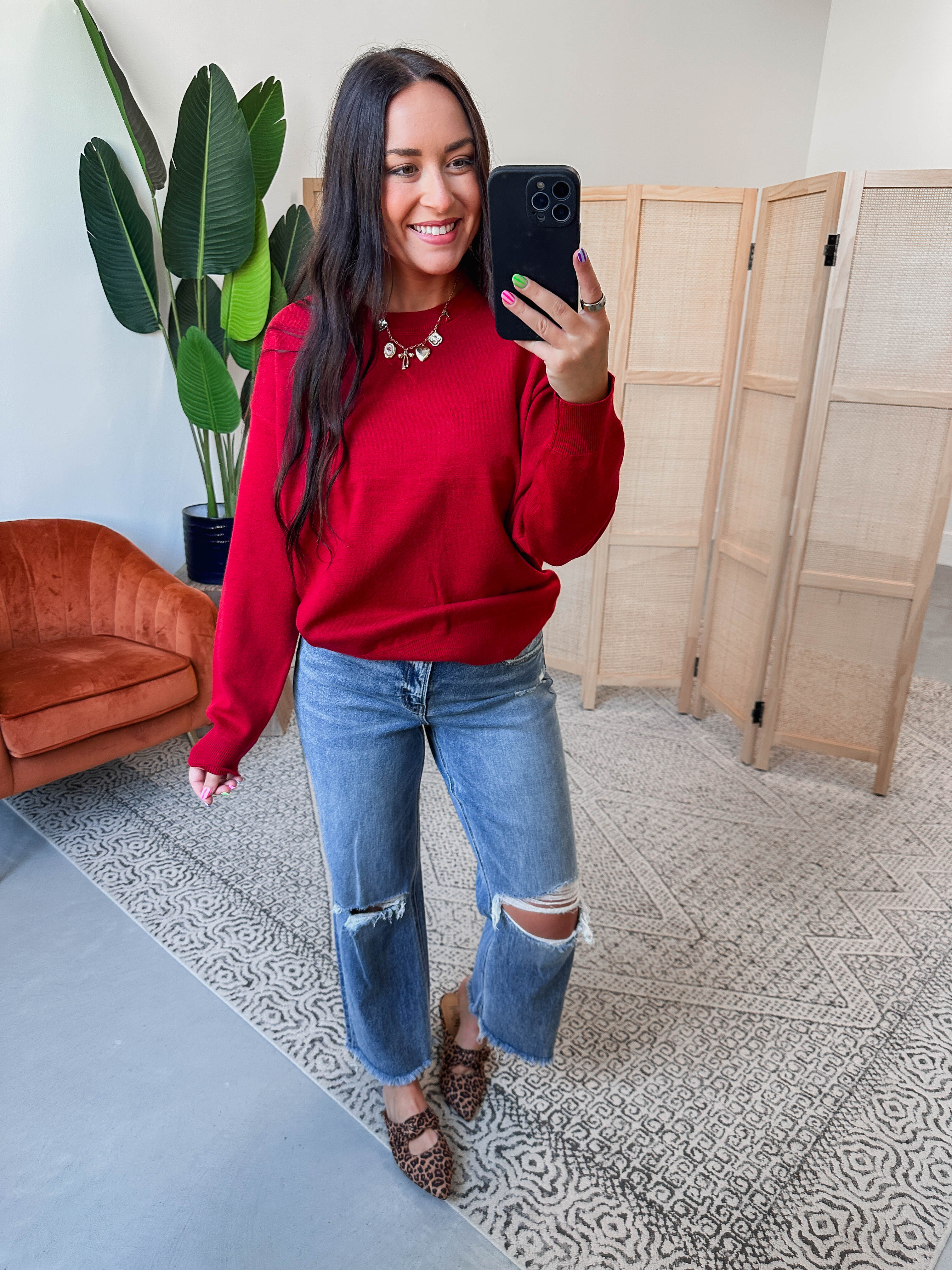 Cozy up in the Beth Sweater in Red! With its crew neckline, long sleeves, and heavy knit, it’s perfect for work or weekend fun. The relaxed fit makes it your go-to for chilly fall and winter days.