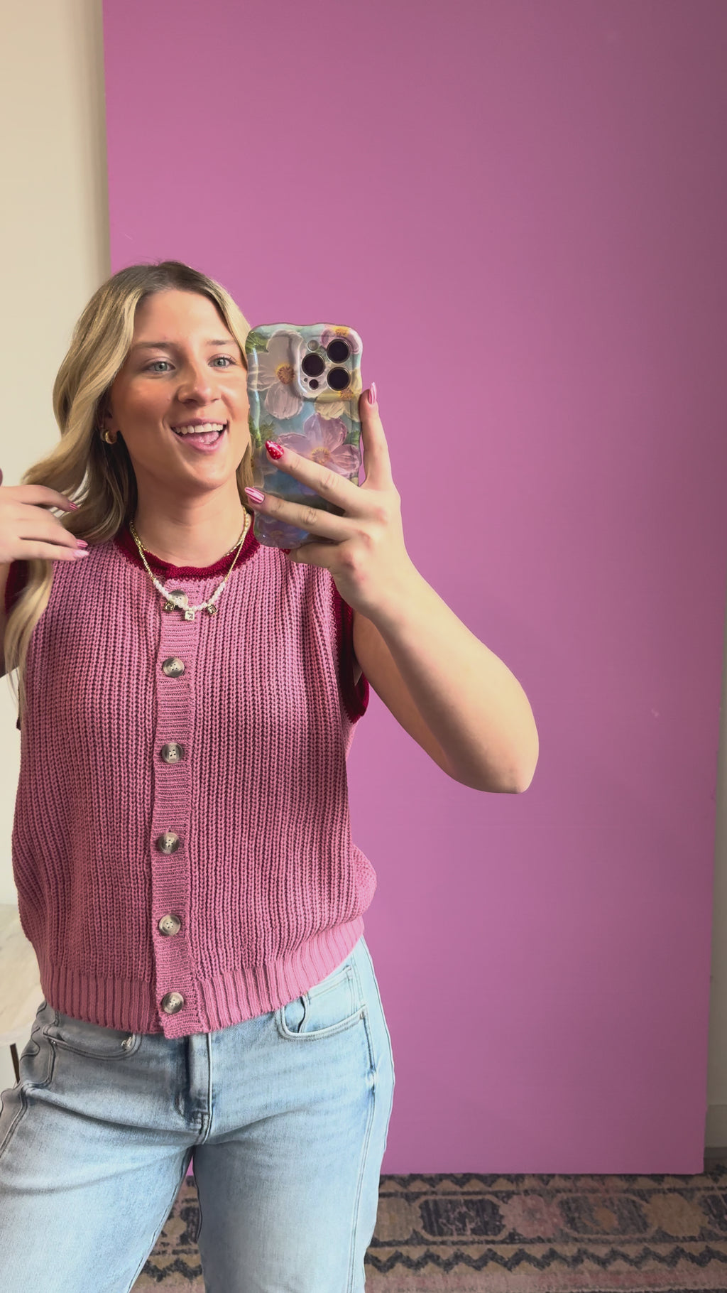 The Brandi Sweater Vest brings playful energy with its vibrant red and pink color blocking. Layer it over a long sleeve for cooler months, or rock it solo with denim shorts when the weather warms up. Versatile enough to transition seamlessly from spring through winter, this piece is a fun addition to any wardrobe.