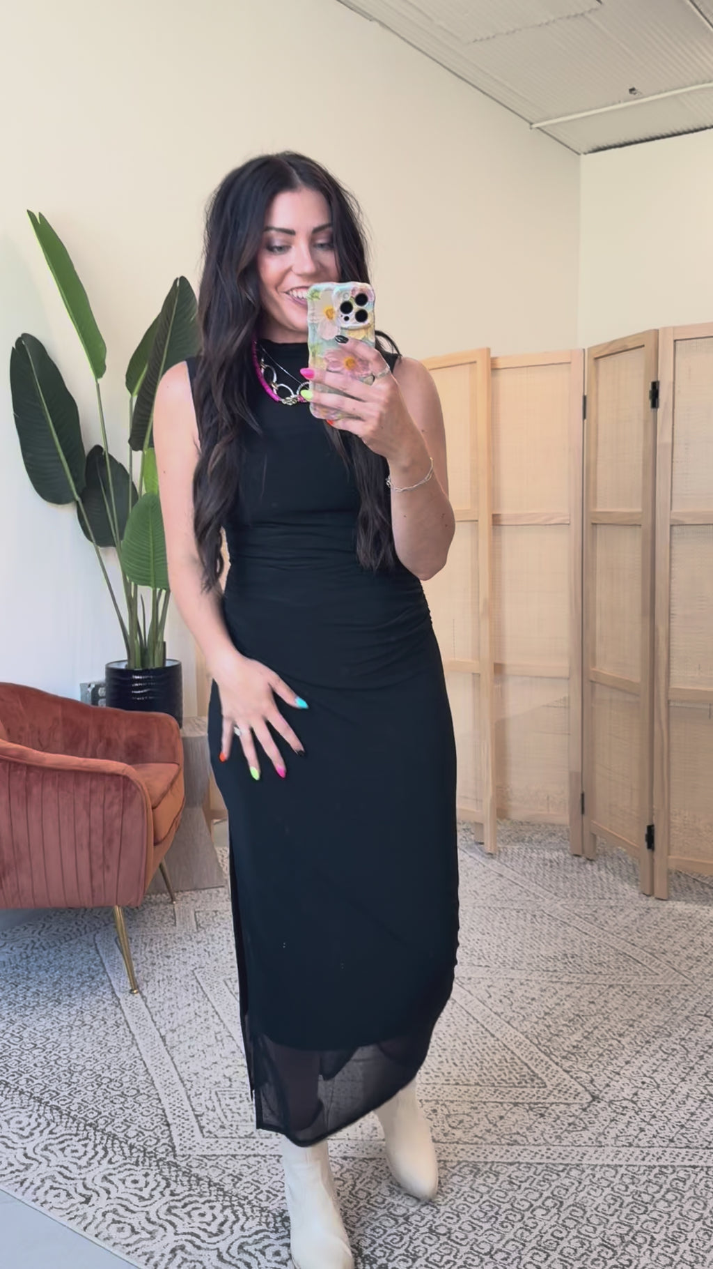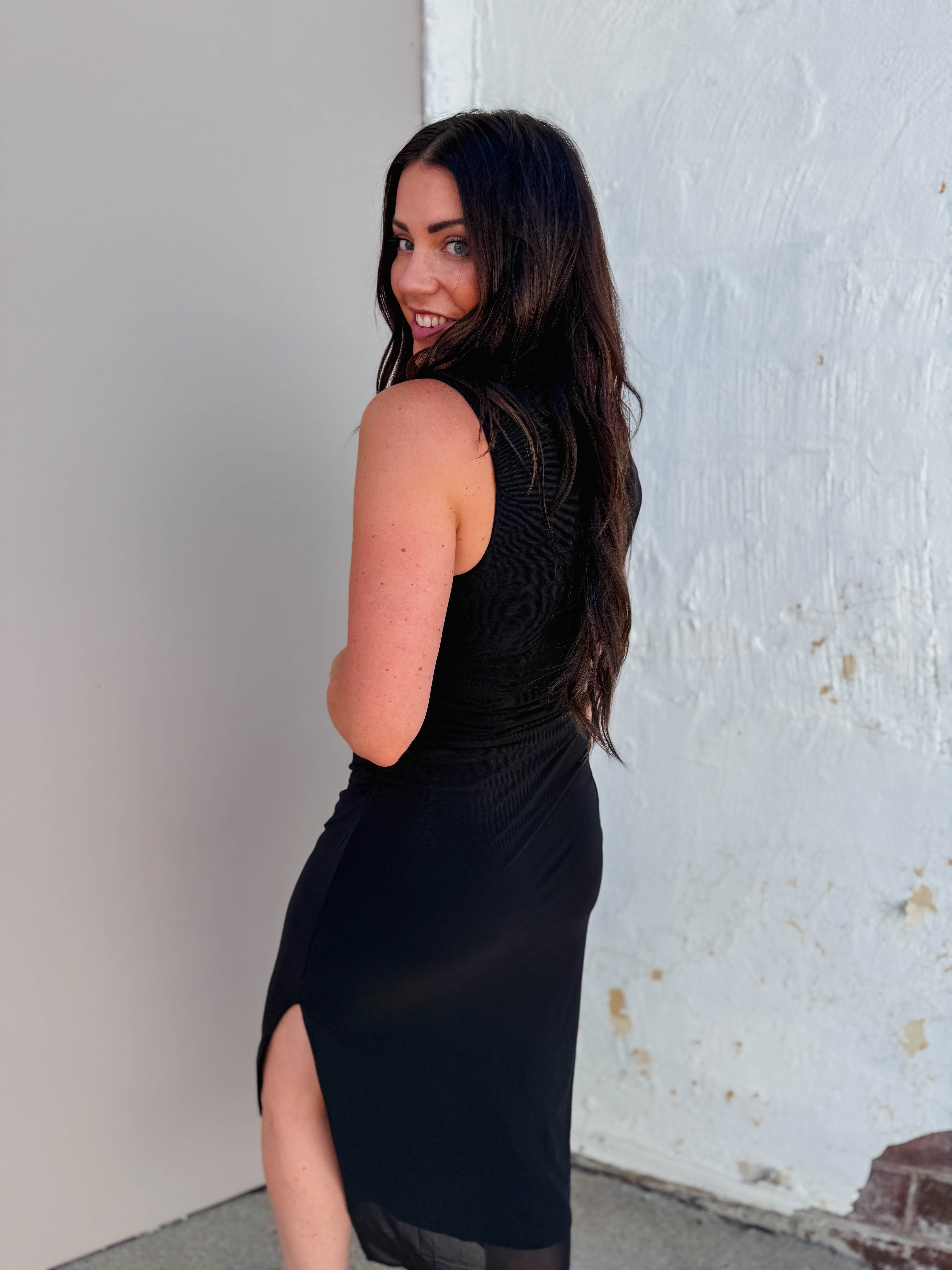 Step out in style with the Brianna Midi Dress! Featuring a chic mock neckline and a ruched mesh overlay, this sleeveless, fitted silhouette dress is perfect for turning heads at any formal event.