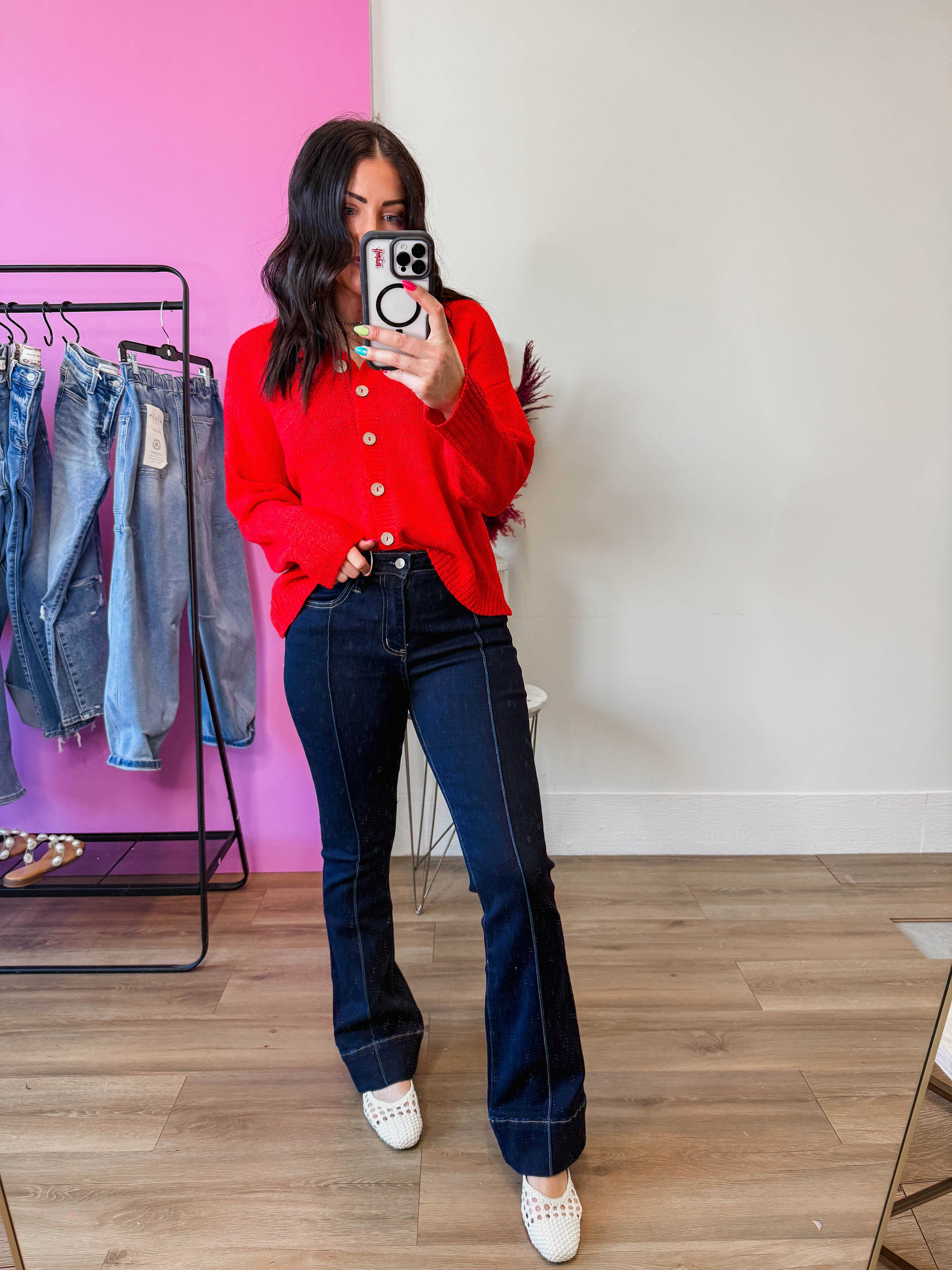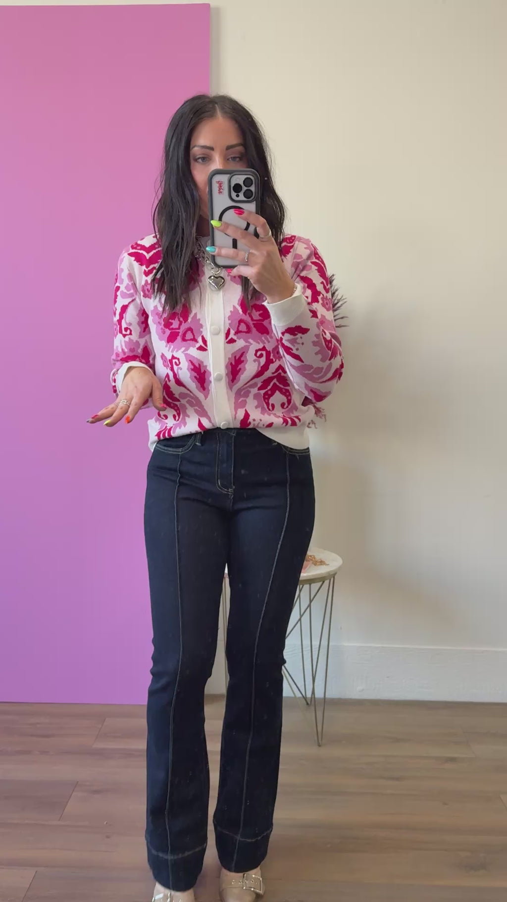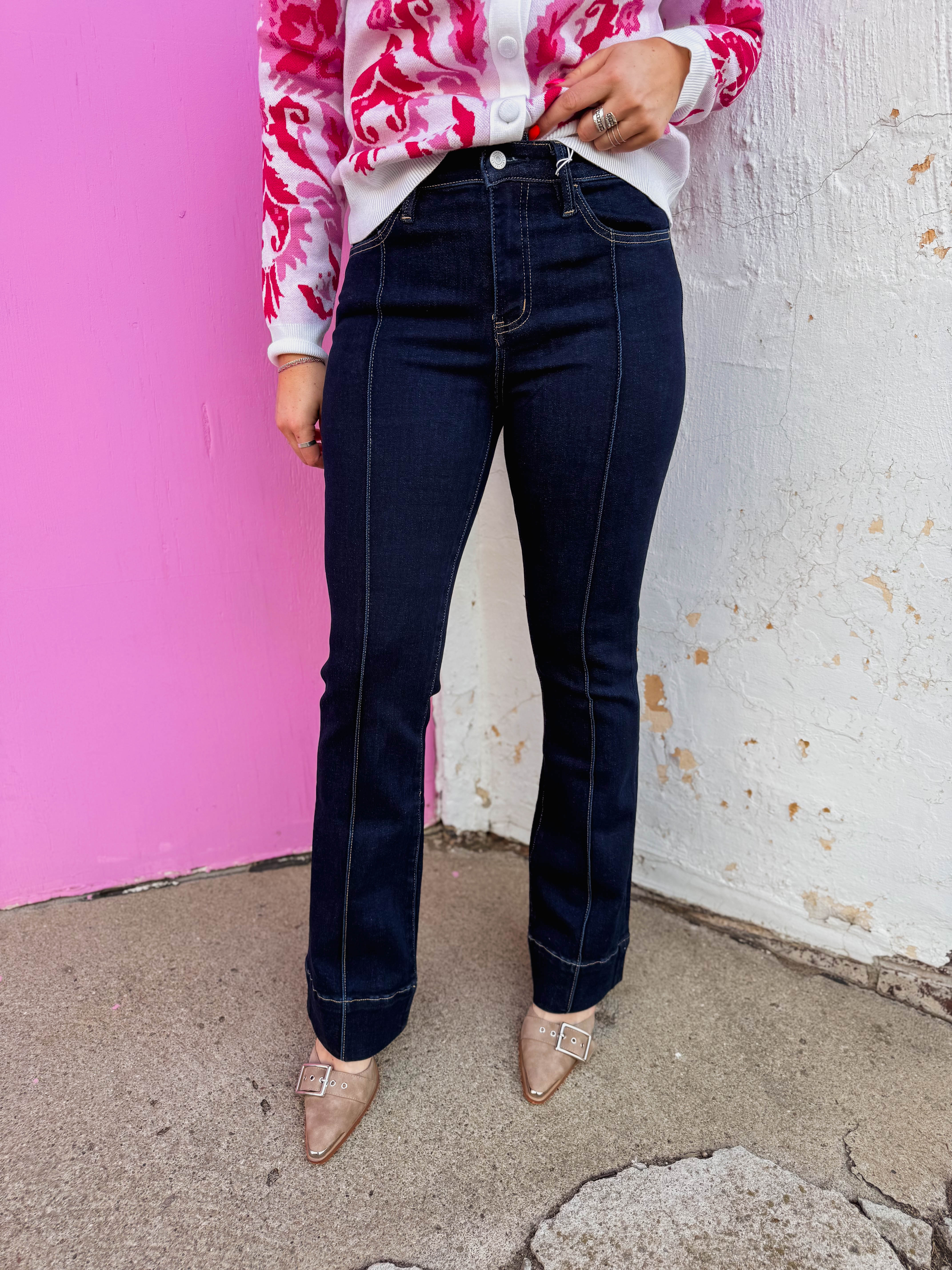 Elevate your denim game with the Caitlin High Rise Bootcut. This dark wash pair features a flattering high rise cut and classic bootcut silhouette, accented with distinctive pin tuck detailing that sets it apart. Versatile enough to transition seamlessly from the office to weekend plans, these jeans are your new go-to for effortless style.