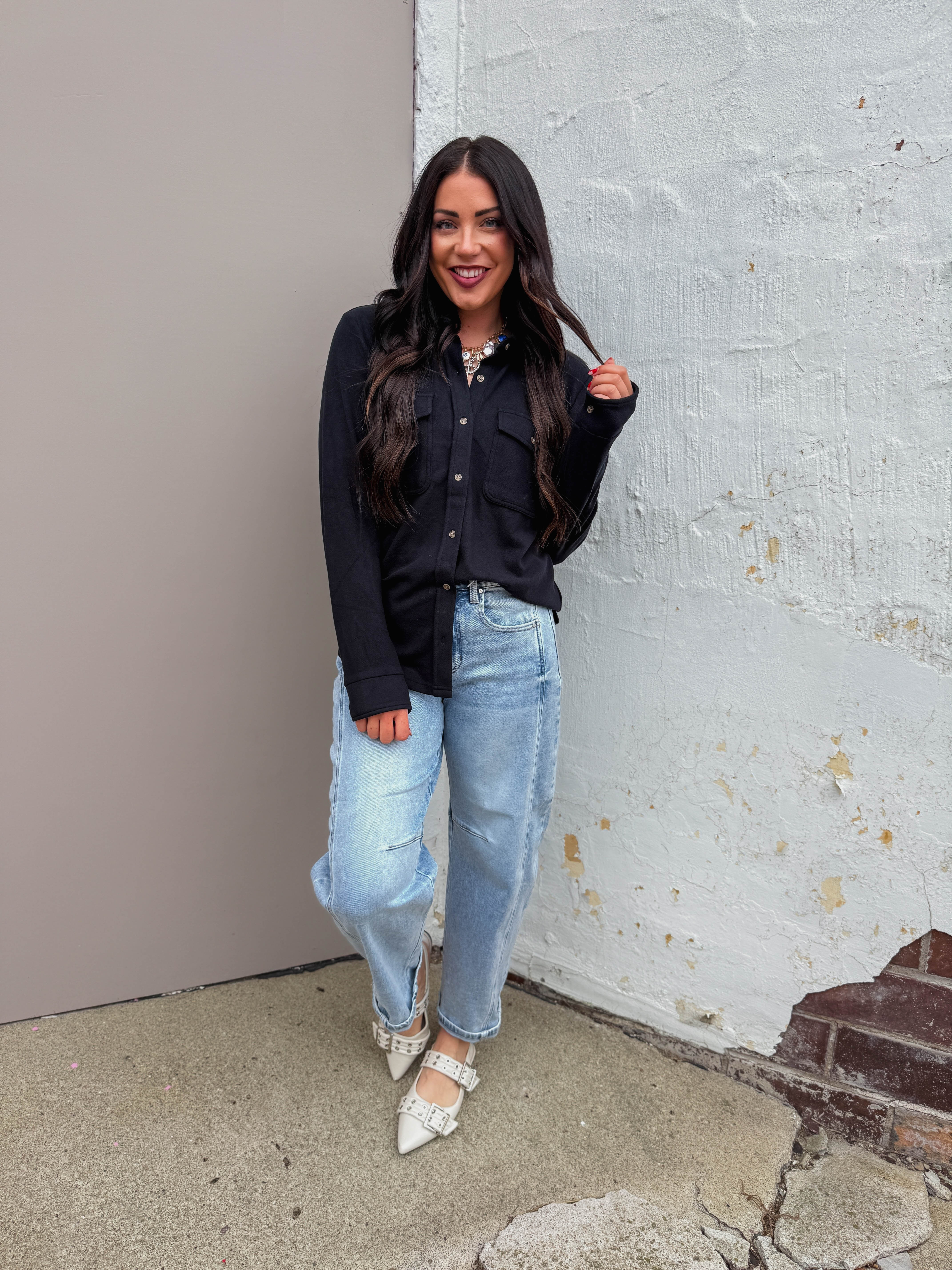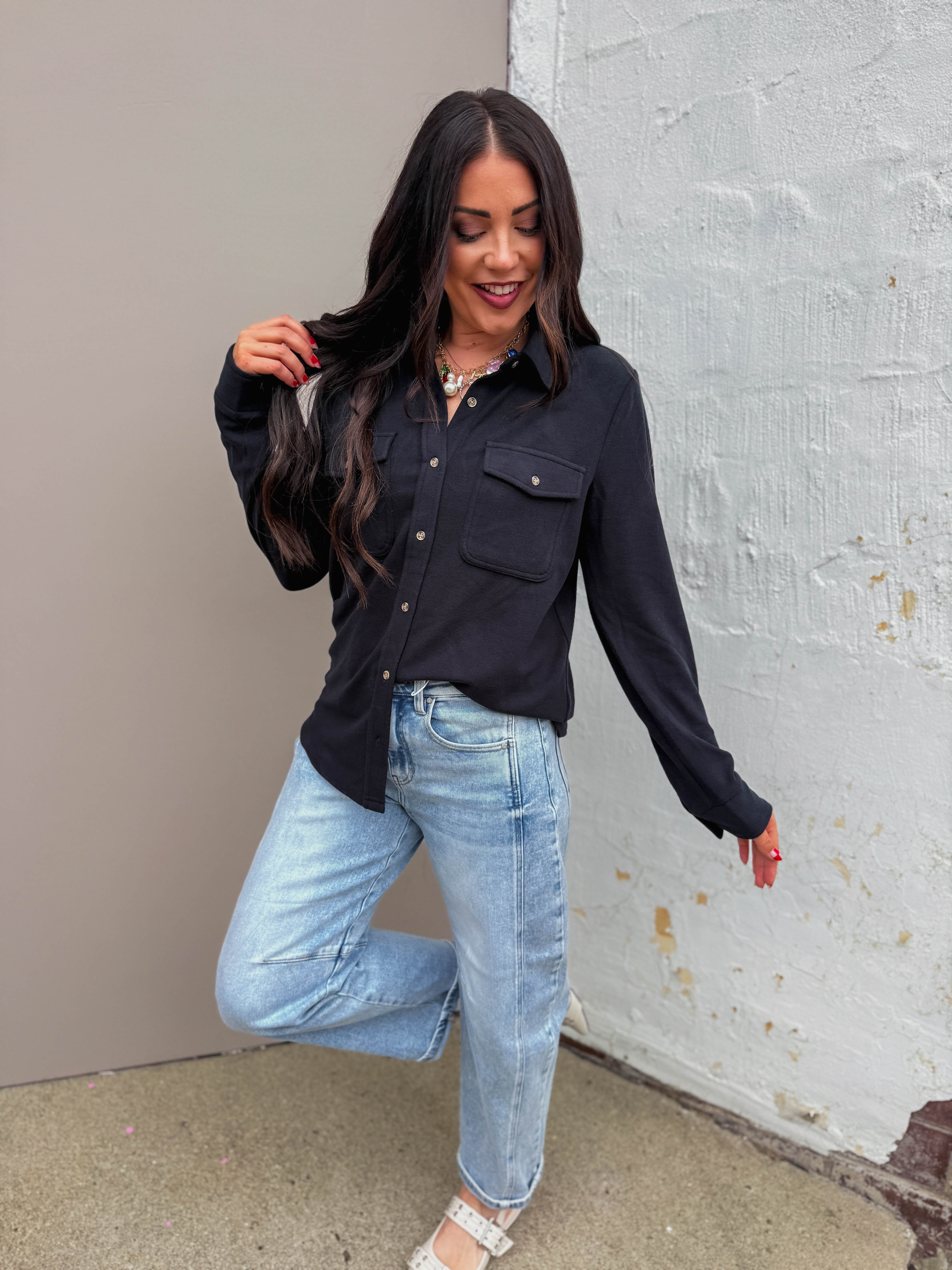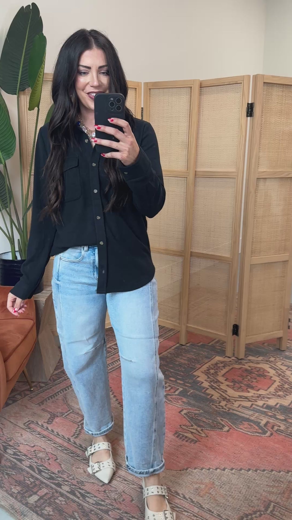 The Cassian Shirt in Black is your go-to lightweight shacket with a collared neckline and button-front closure. Featuring dual chest pockets and a shirt tail hem, it’s perfect for transitioning from work to weekend. A fun and easy fall staple you’ll reach for again and again!