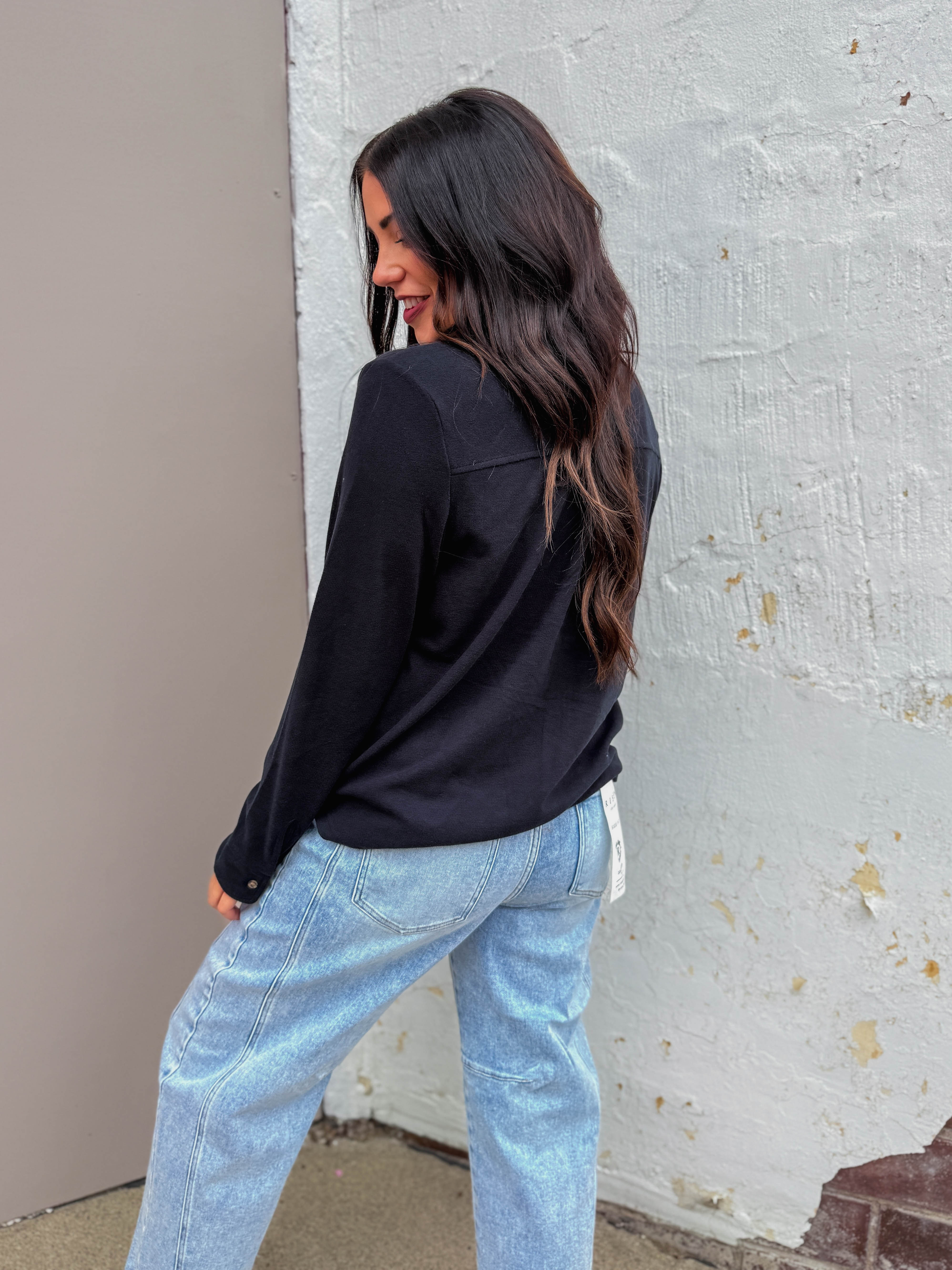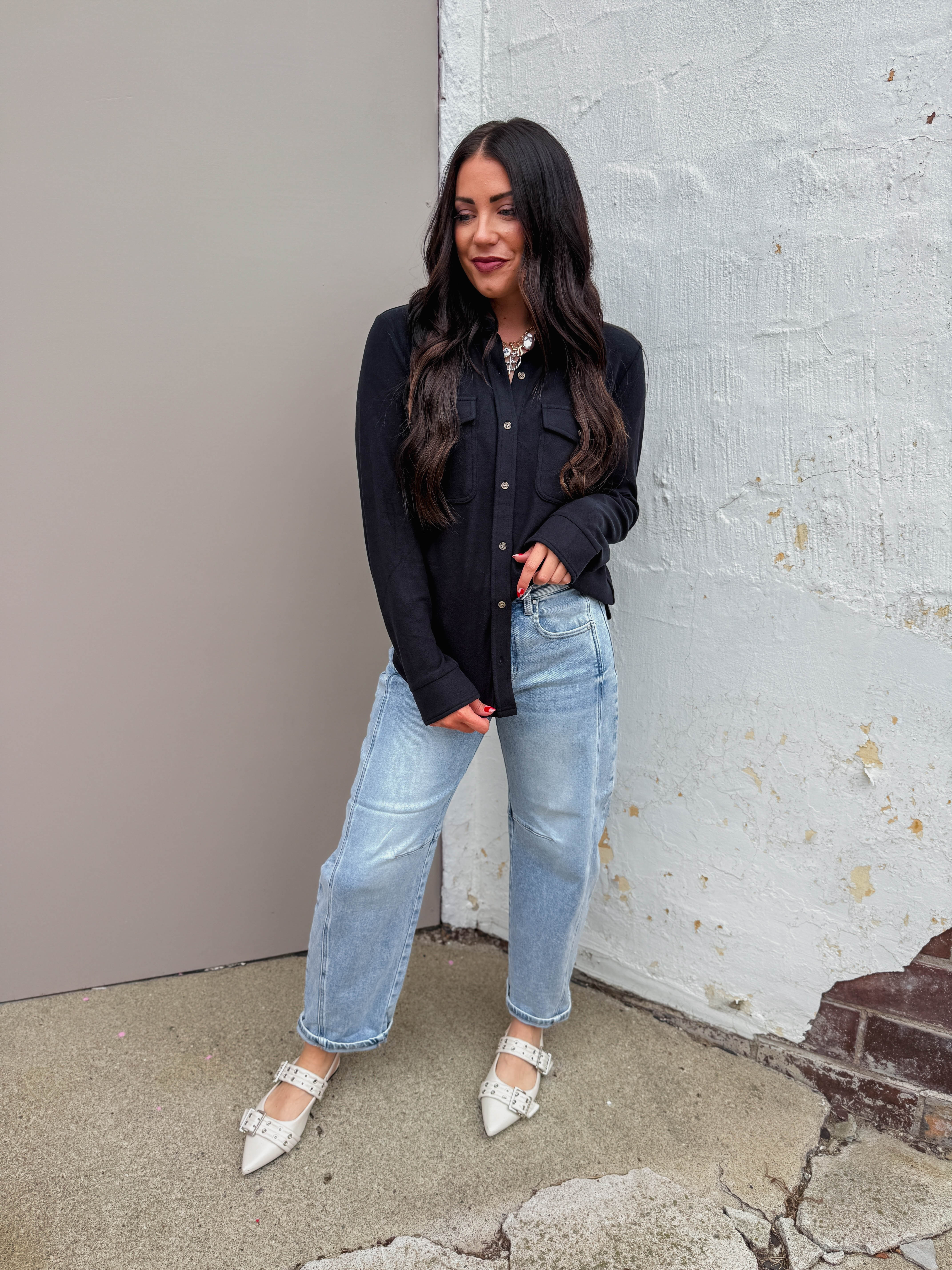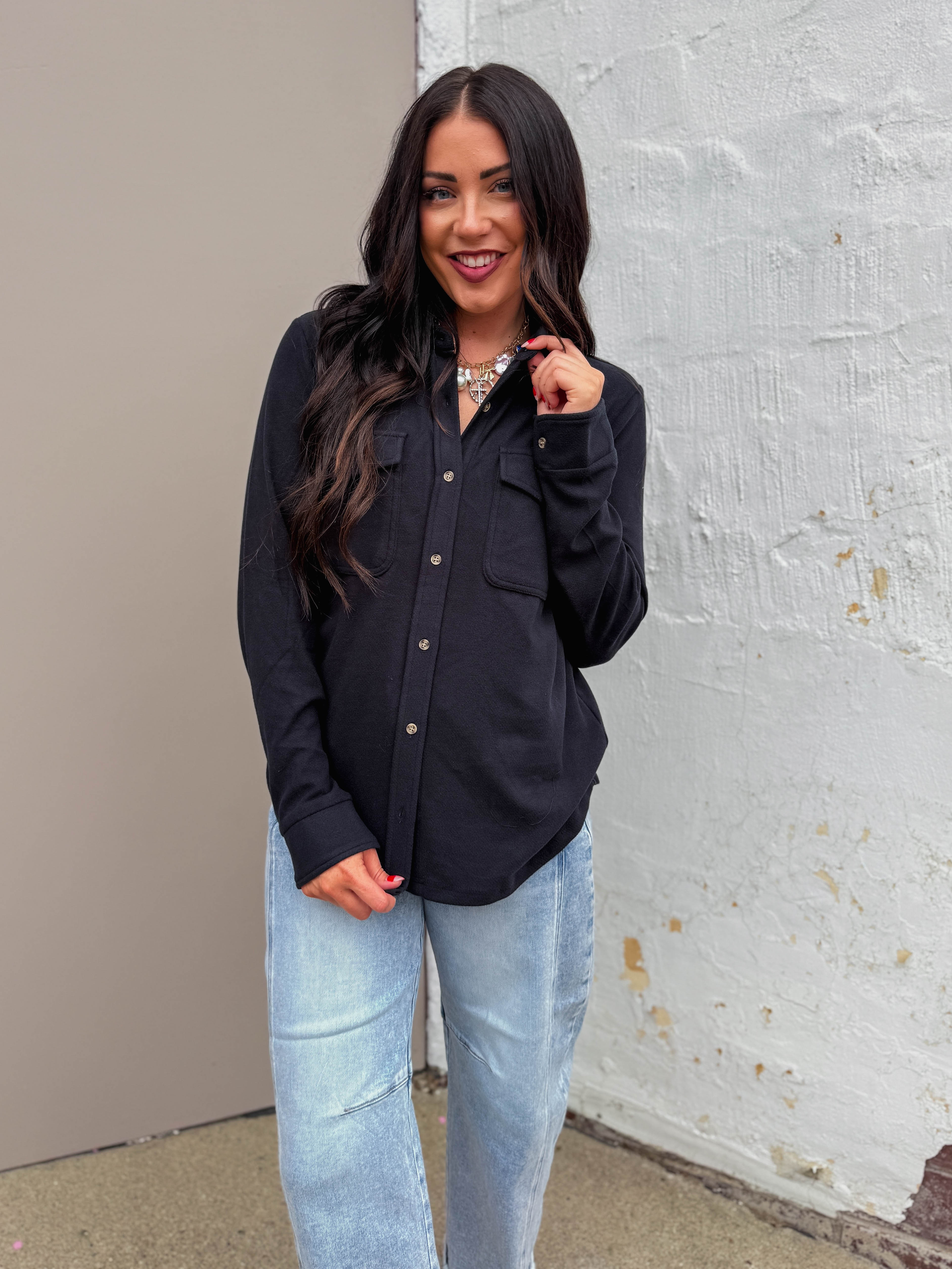 The Cassian Shirt in Black is your go-to lightweight shacket with a collared neckline and button-front closure. Featuring dual chest pockets and a shirt tail hem, it’s perfect for transitioning from work to weekend. A fun and easy fall staple you’ll reach for again and again!