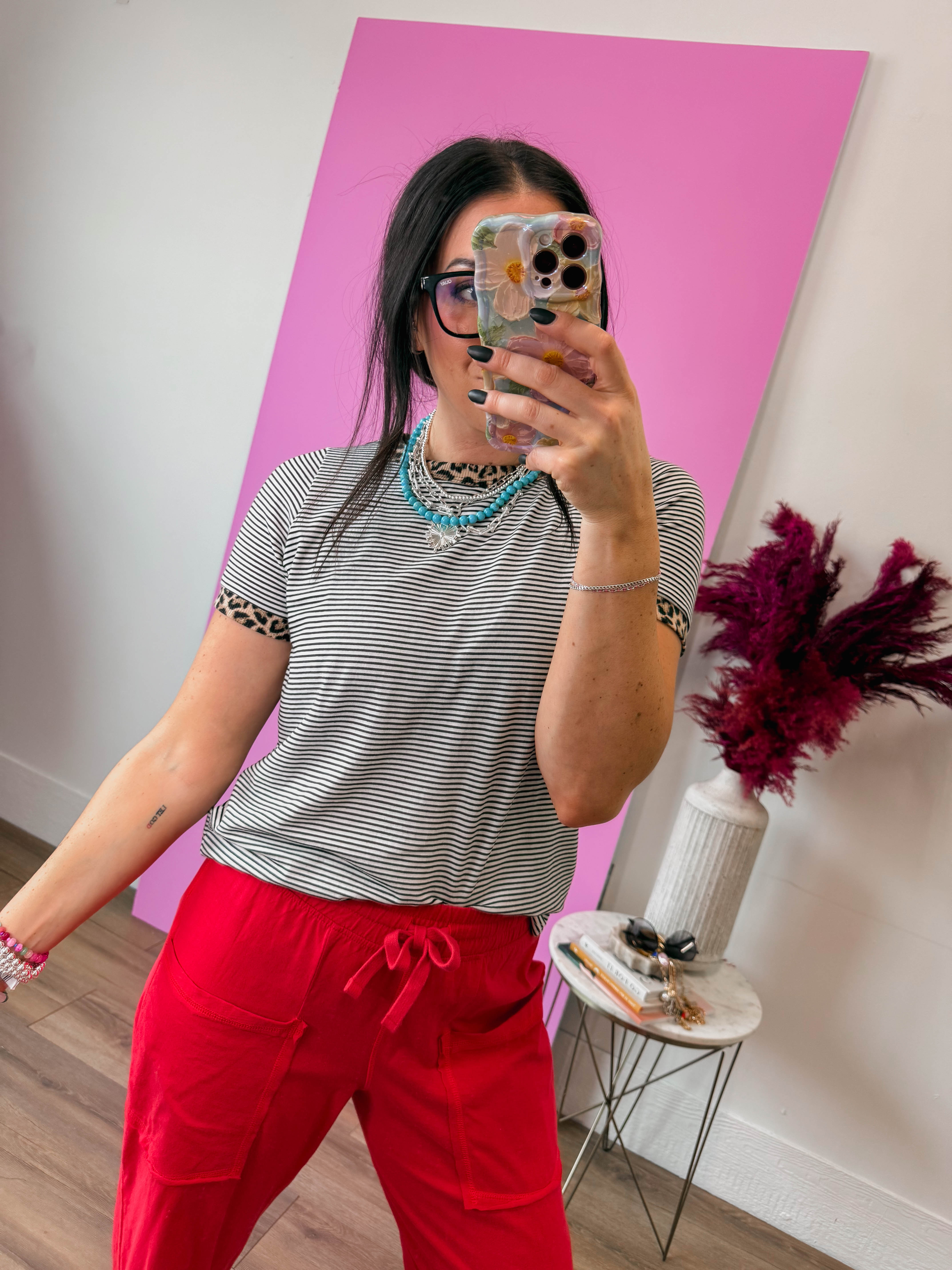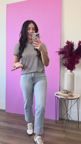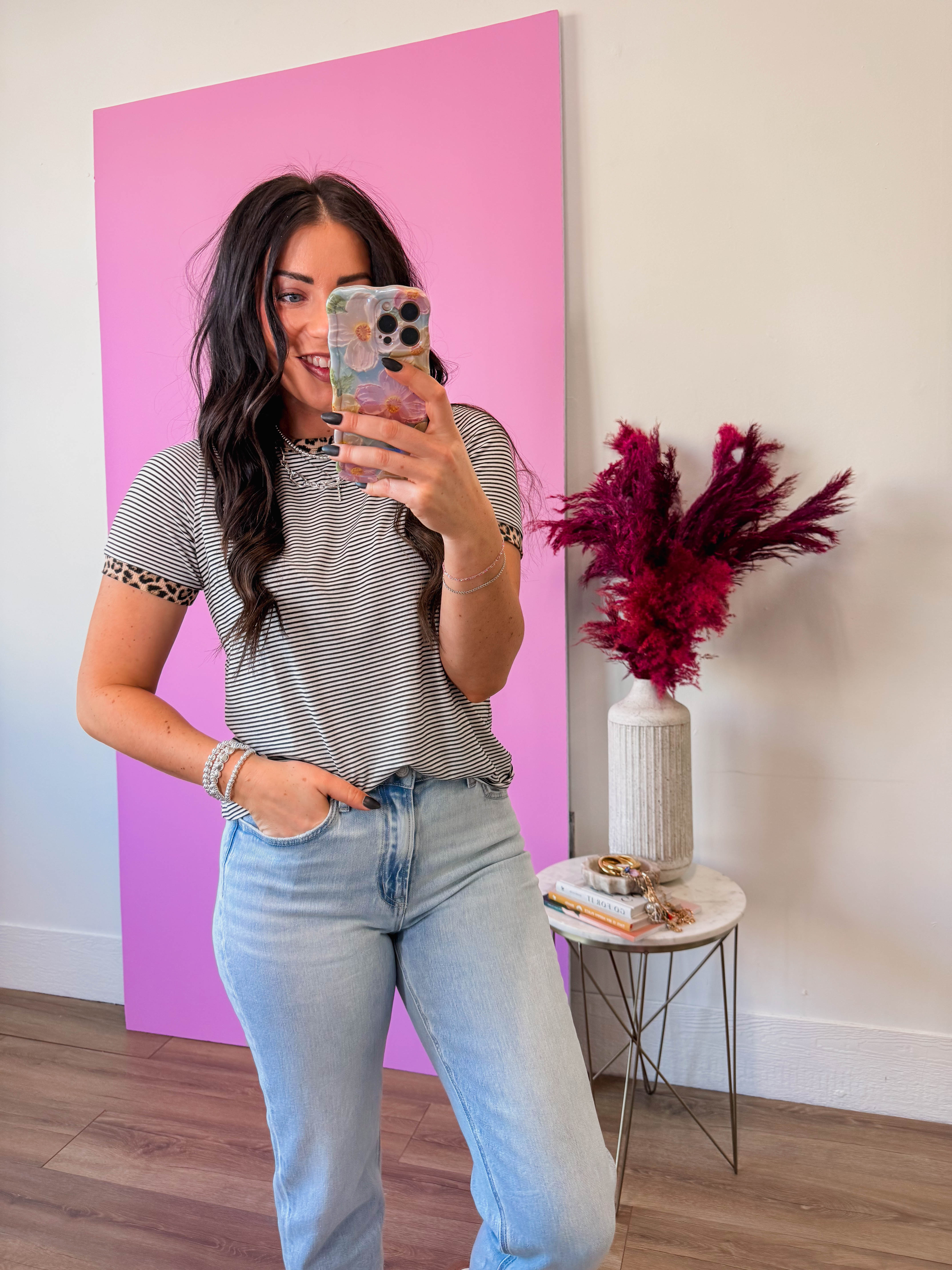 The Claire Striped Top brings effortless style from office to weekend. This crew neck tee features bold pinstripes with a fun leopard trim that adds a playful pop of pattern to any outfit. Short sleeves keep it breezy and comfortable, while the ivory base keeps it versatile enough to pair with everything in your closet.