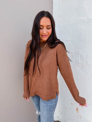 Cozy up in the Erin Sweater in Caramel! With a comfy crew neckline, long sleeves, and playful side slits, this horizontally ribbed pullover moves seamlessly from work to weekend. Perfect for layering or wearing solo, it’s your new go-to for effortless style and comfort.