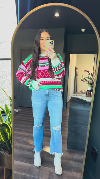 Cozy up in the Feeling Festive Sweater! Featuring a cheerful winter pattern, round neckline, and comfy long sleeves with ribbed hems, it’s perfect for spreading holiday cheer in style.
