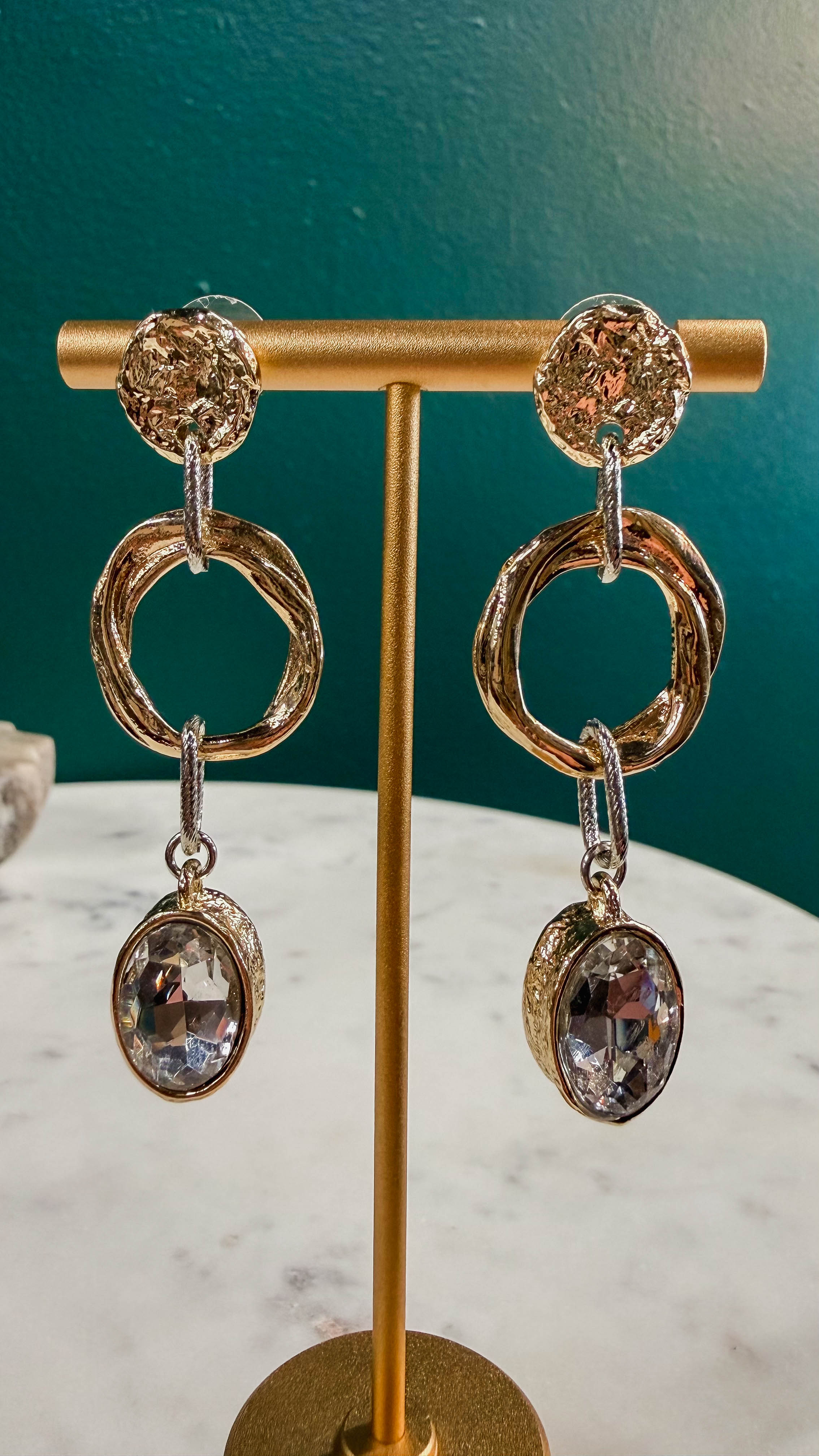 Gold Hammered Coin with Open Silver Circle and Clear Rhinestone 2" Drop Earring