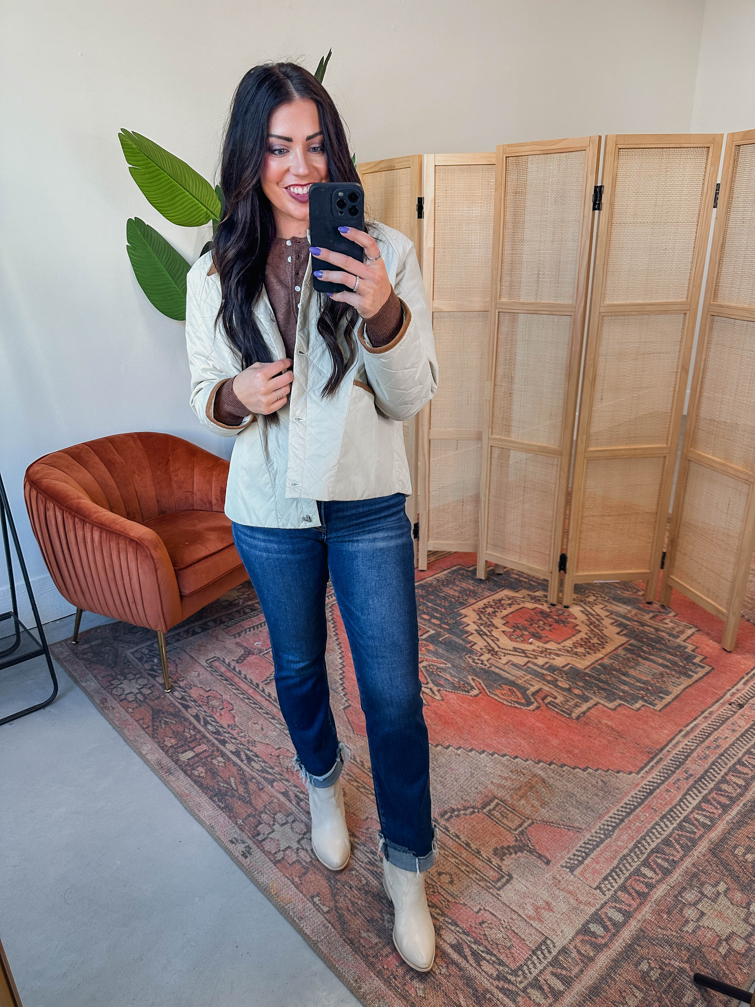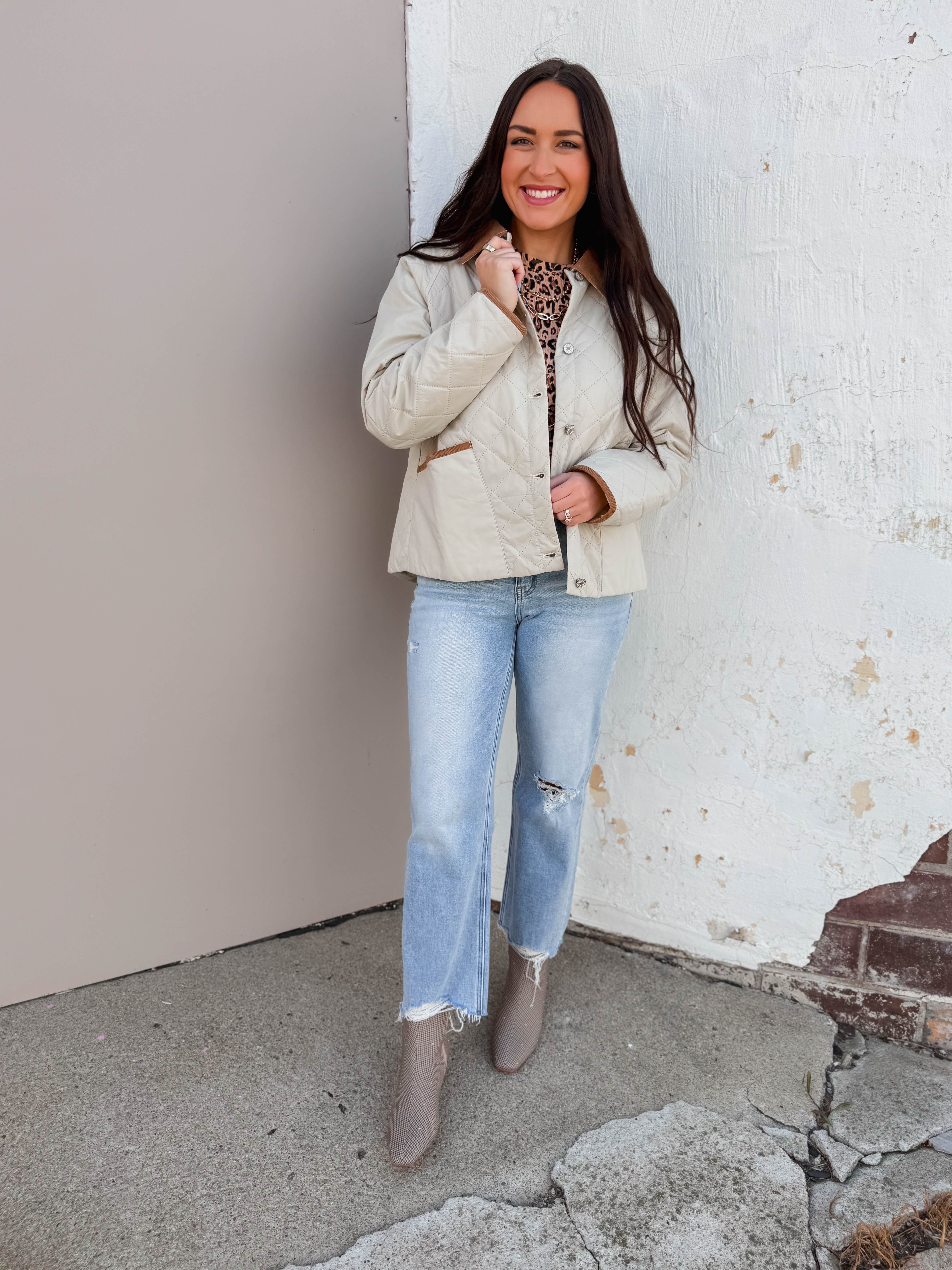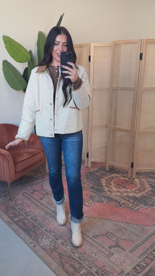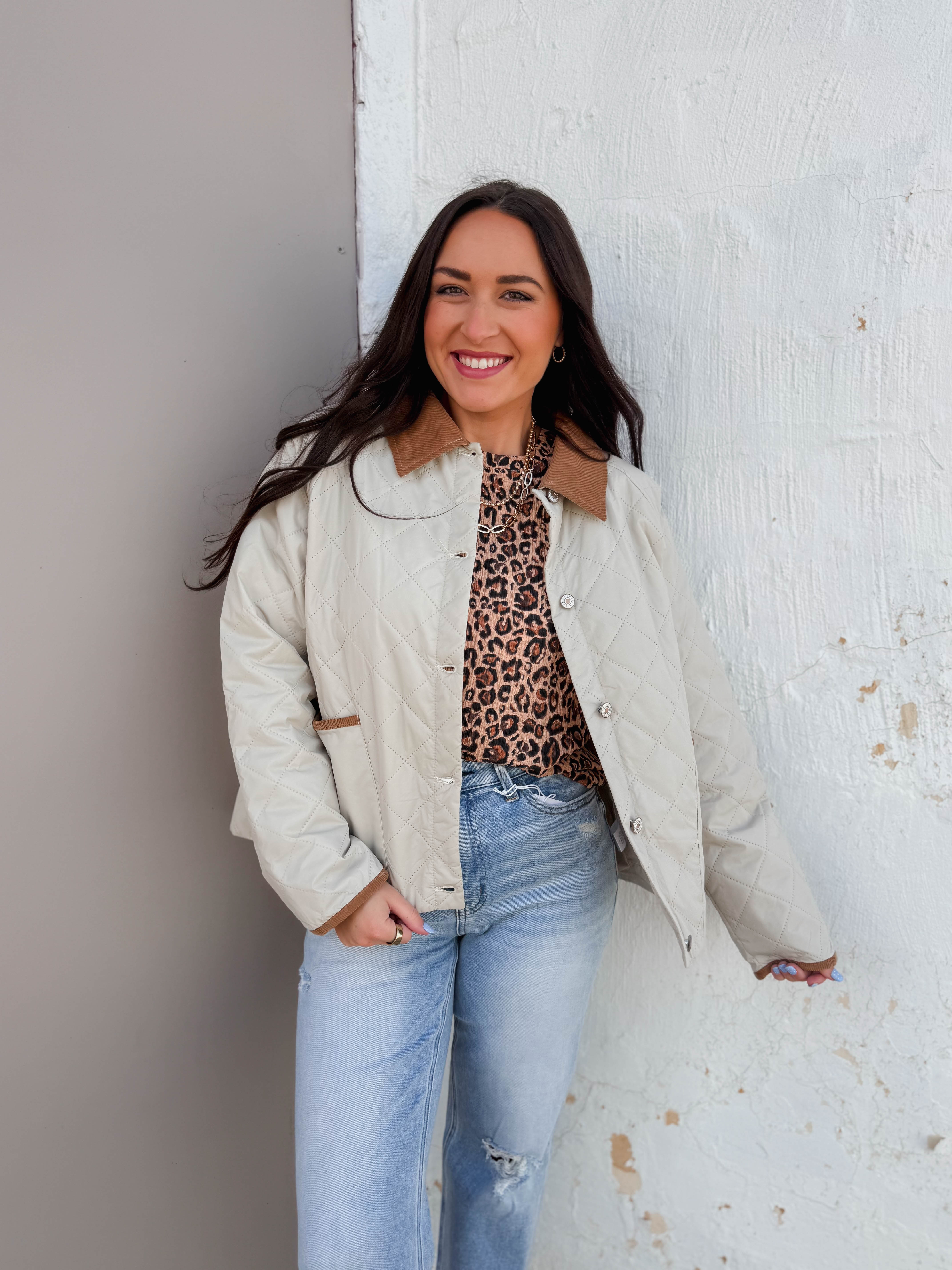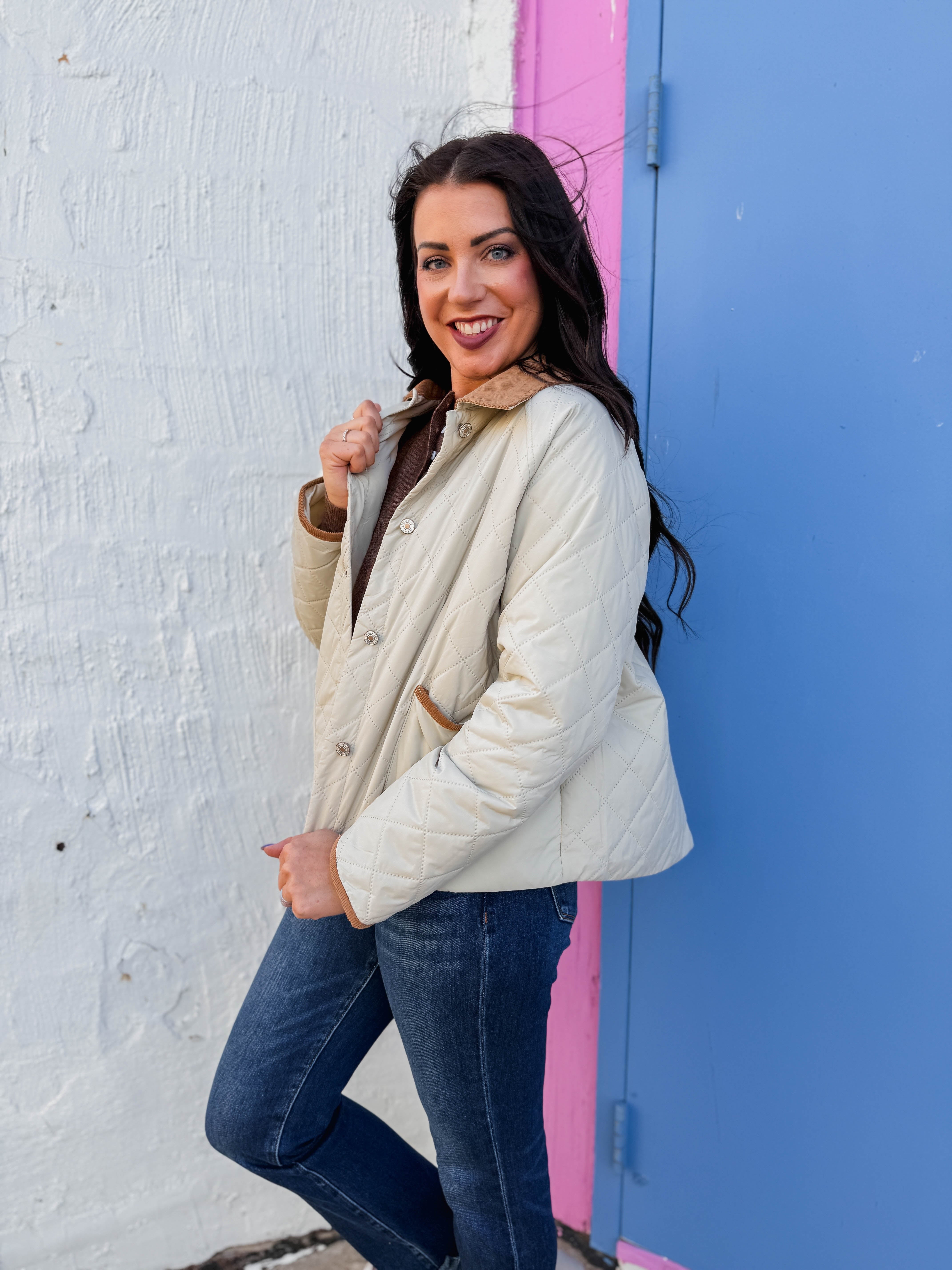 Stay cozy and stylish this fall with the Hanna Quilted Jacket in Sand. Featuring a chic collared neckline, quilted design, and button front closure with fun contrast details, it’s the perfect layer for crisp autumn days.