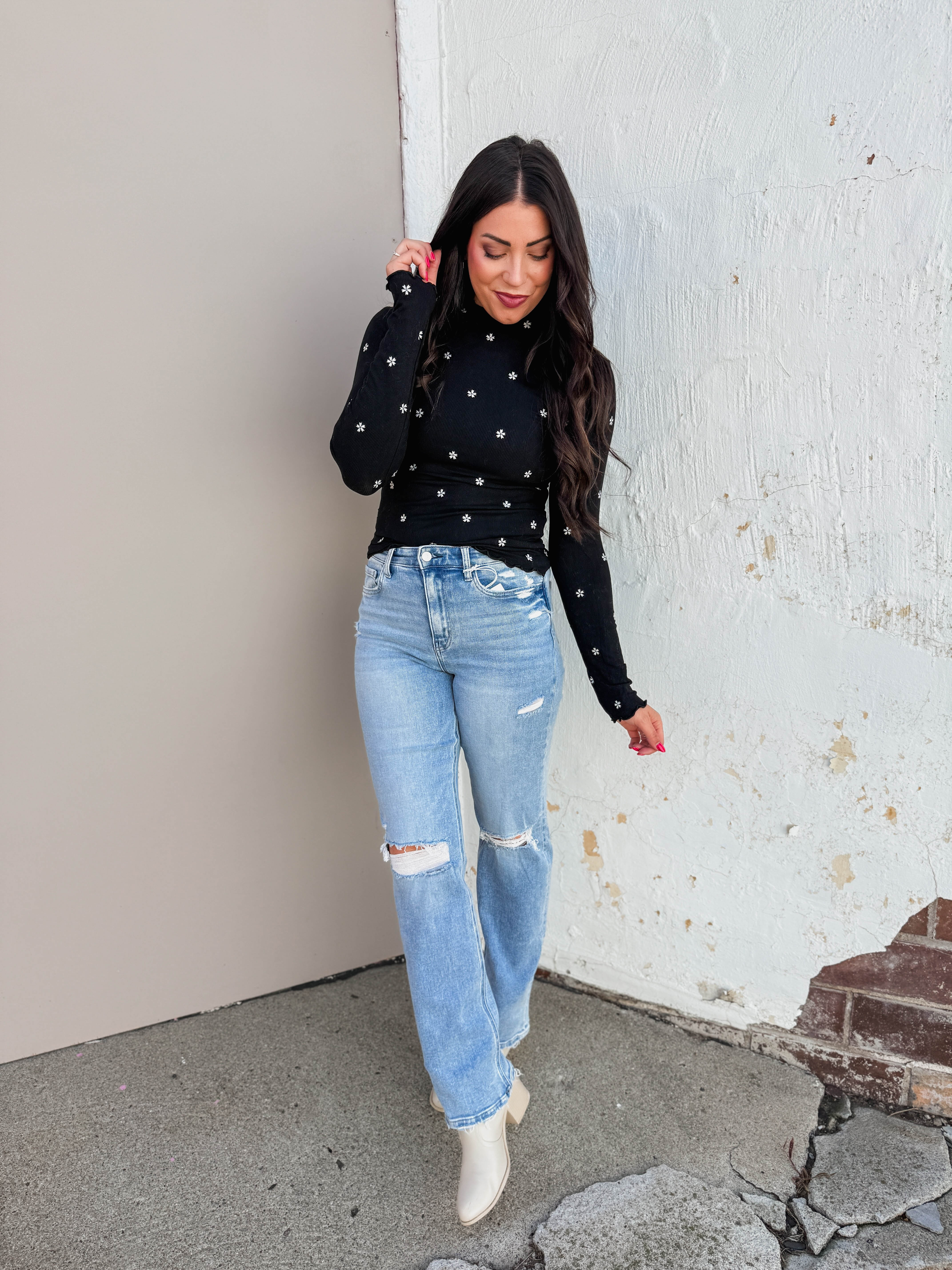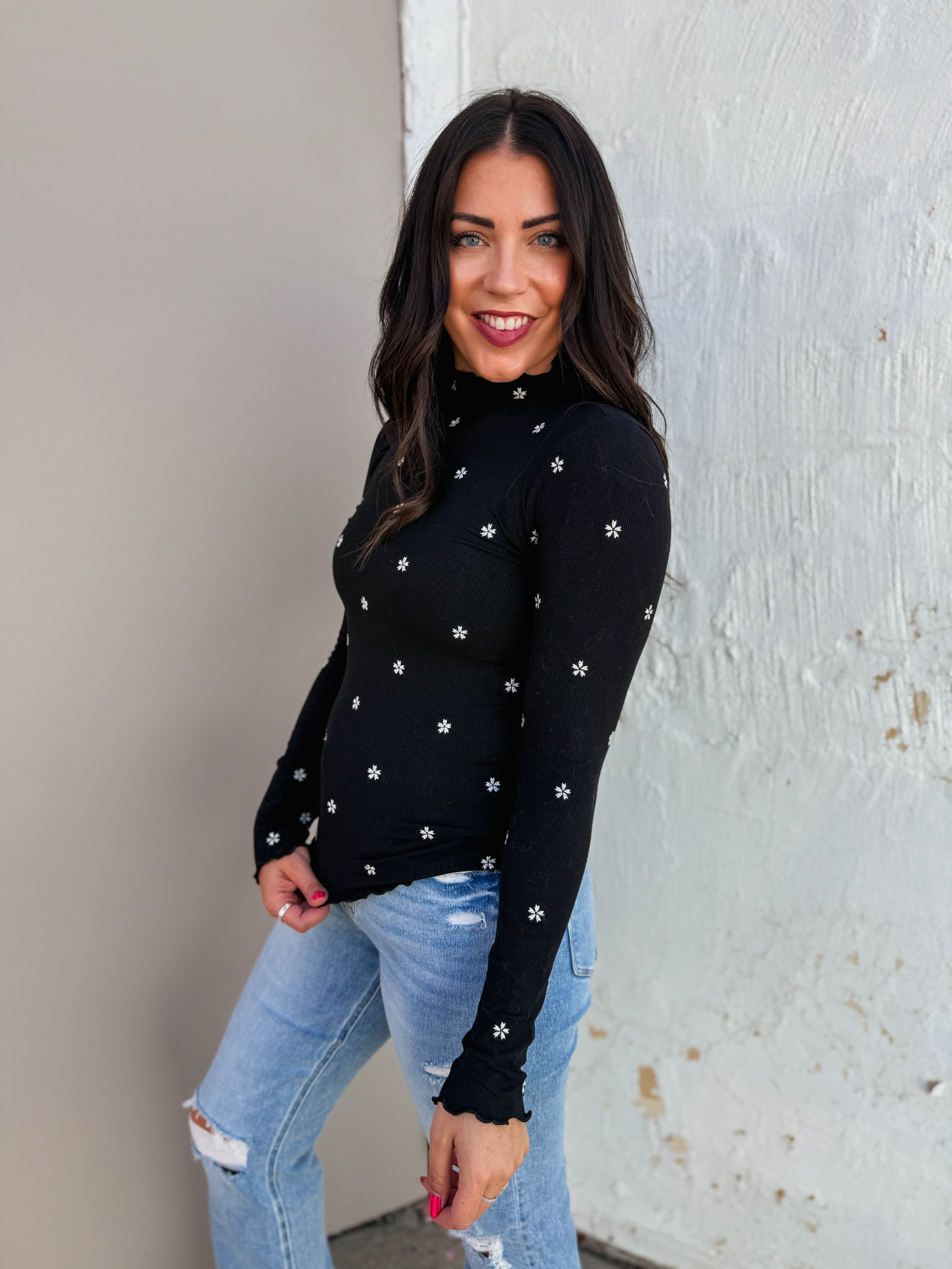 RESTOCK! This ribbed Kaci top features a chic mock neckline and long sleeves, perfect for layering or wearing solo. Adorned with delicate flower embroidery and trendy cabbage hems, it’s your go-to for effortless style from work to weekend. Cozy up in fall and winter with this cute, versatile piece!