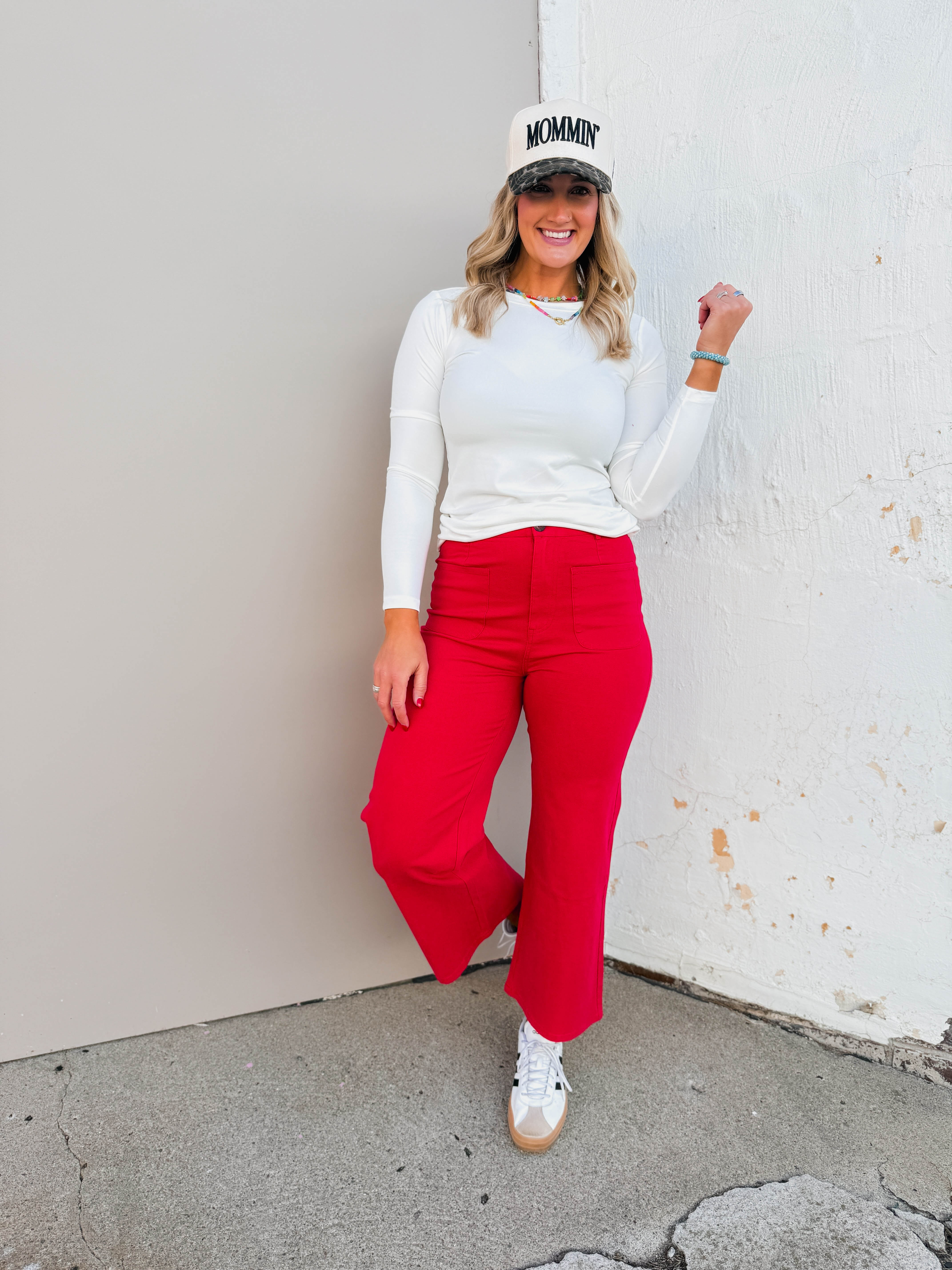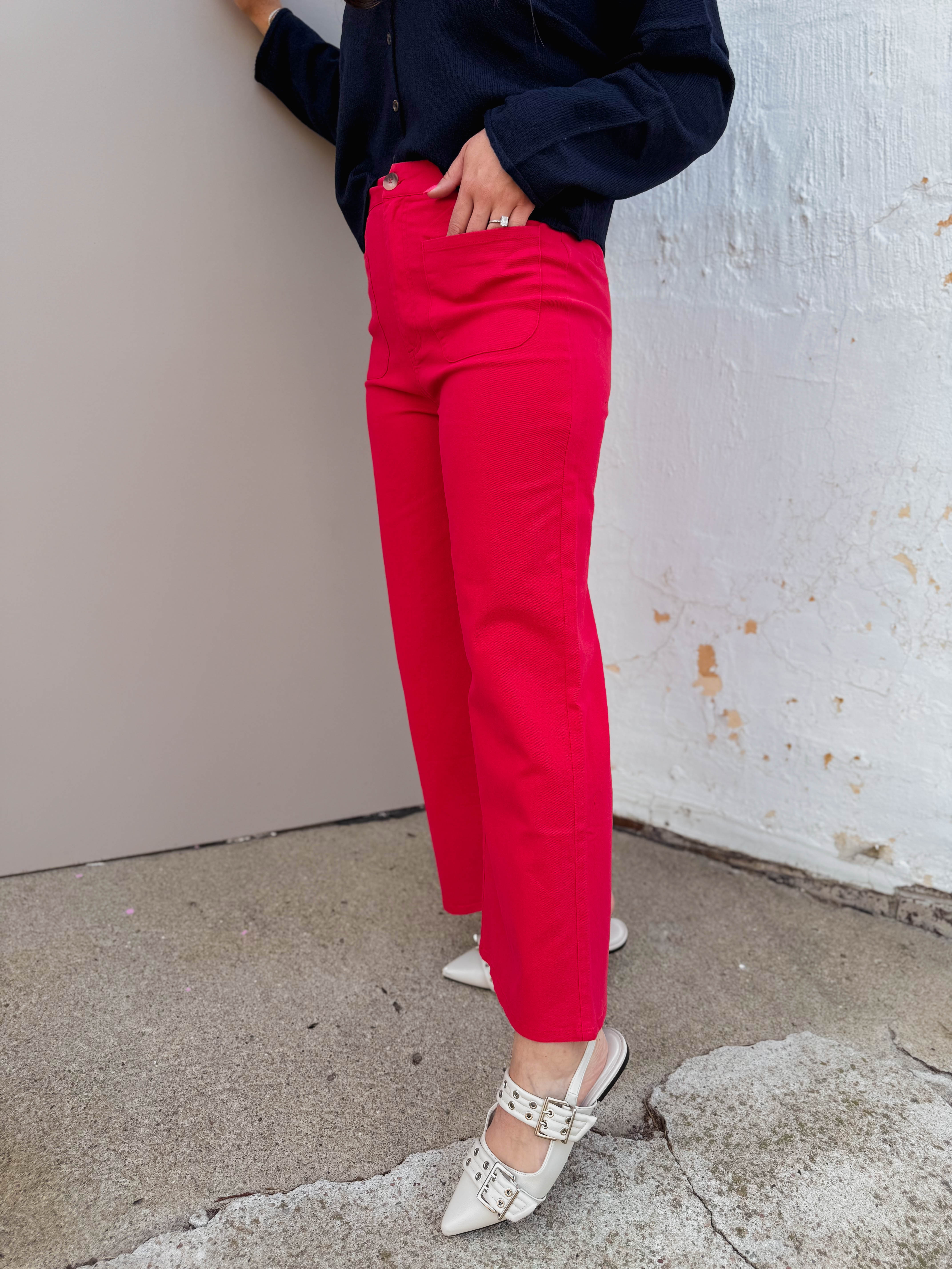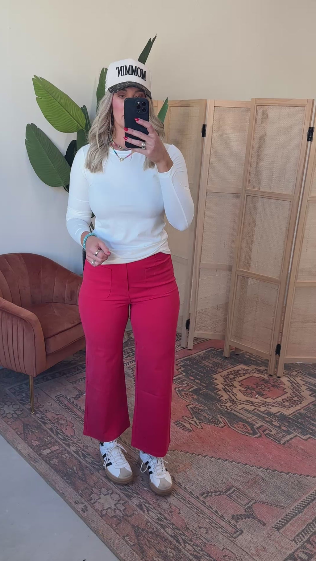 The Karter Wide Leg Pants in red bring a fun pop of color to your wardrobe. With a high waist, ankle length, and patch front pockets, they’re perfect for work or weekend vibes. Featuring faux back pockets, belt loops, and a zip fly with button closure, they combine style and comfort effortlessly—ideal for gameday looks!