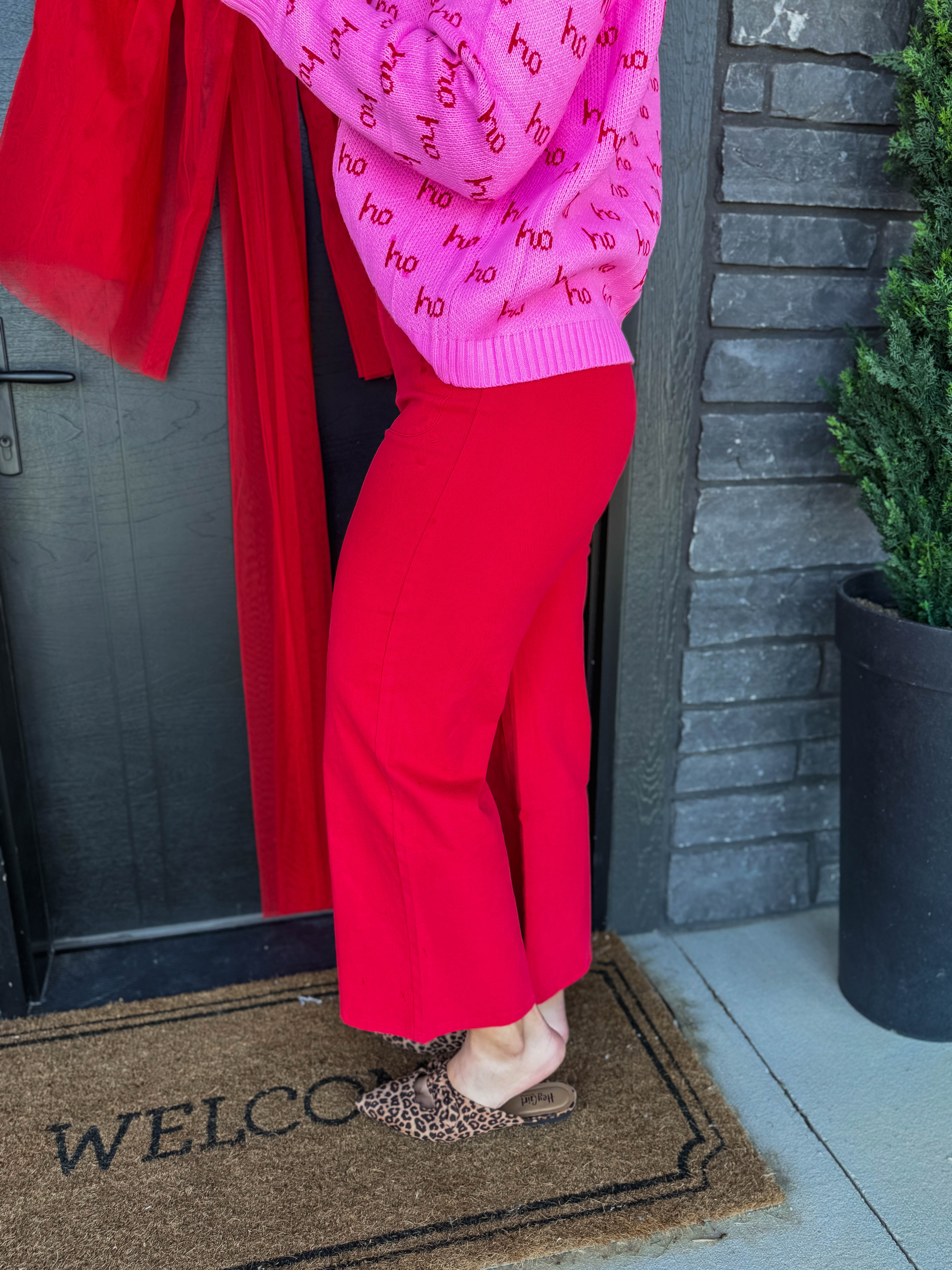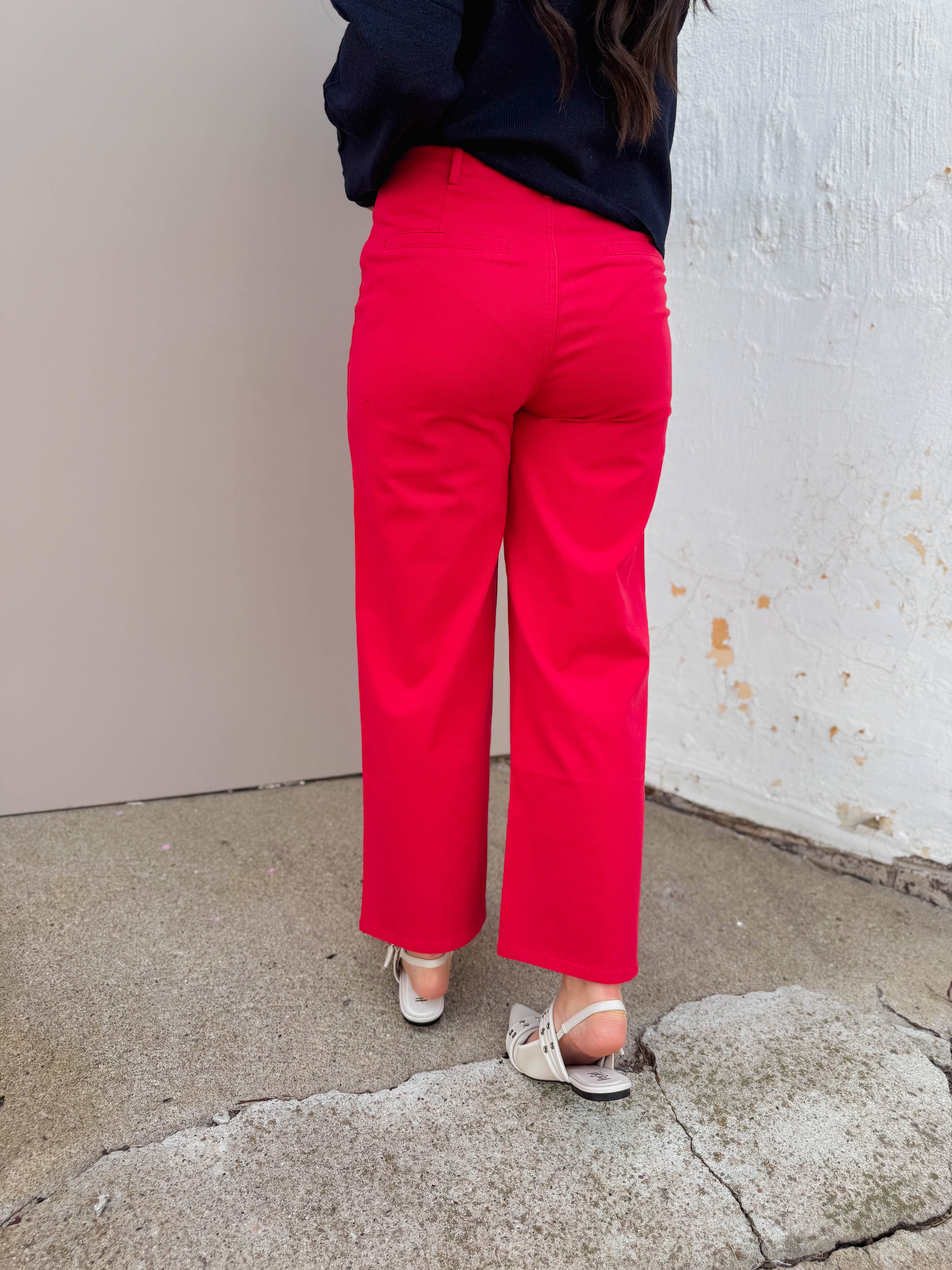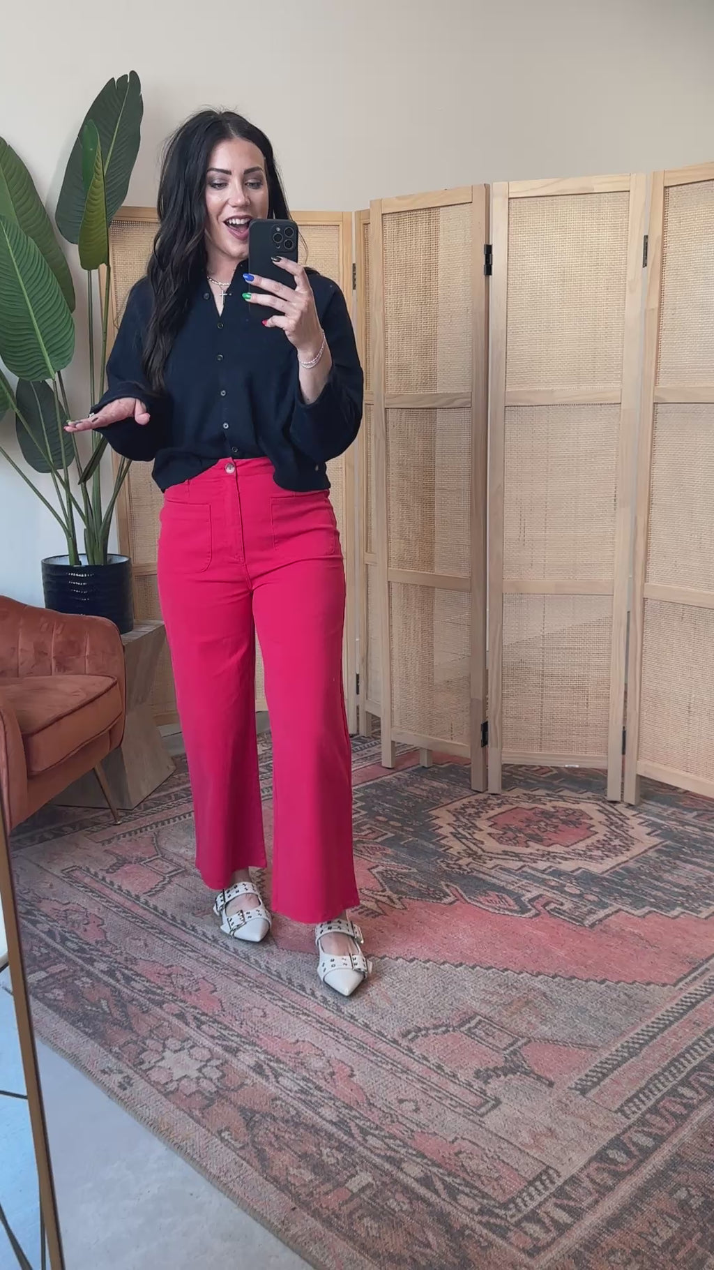The Karter Wide Leg Pants in red bring a fun pop of color to your wardrobe. With a high waist, ankle length, and patch front pockets, they’re perfect for work or weekend vibes. Featuring faux back pockets, belt loops, and a zip fly with button closure, they combine style and comfort effortlessly—ideal for gameday looks!