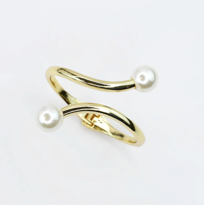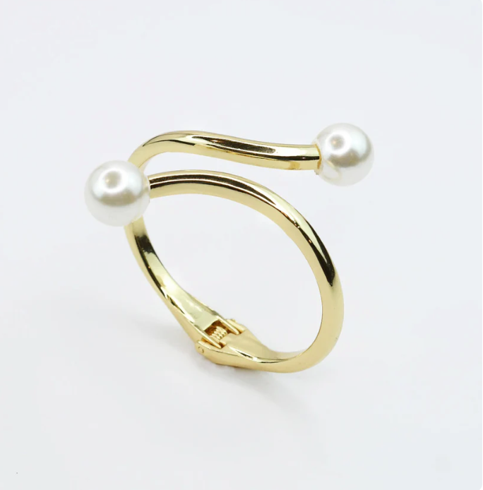 Make a statement with this bracelet, where modern design meets timeless elegance. Available in radiant gold, this sculptural open bangle is crowned with luminous pearls on each end. The perfect piece to elevate both casual and evening looks.