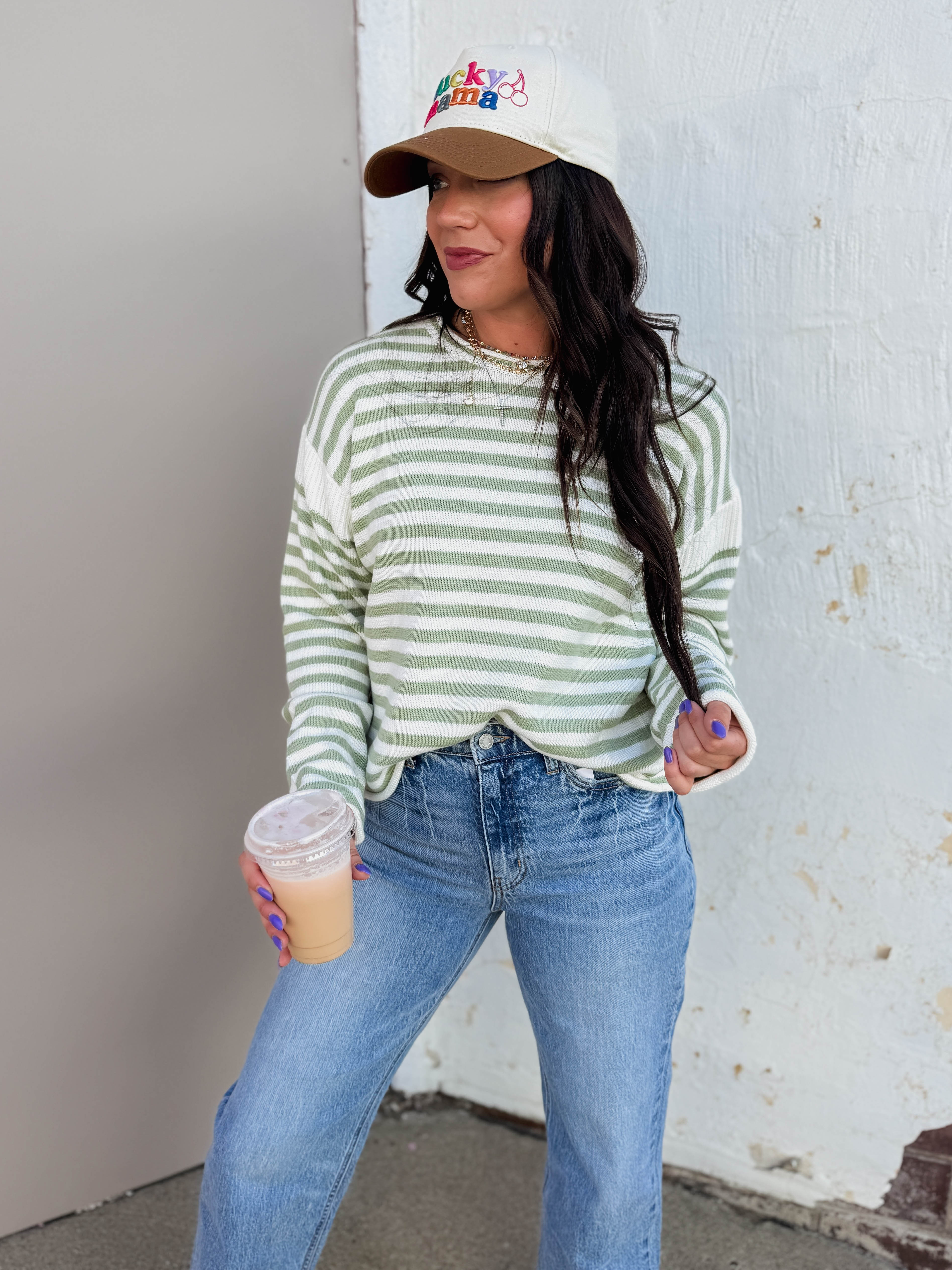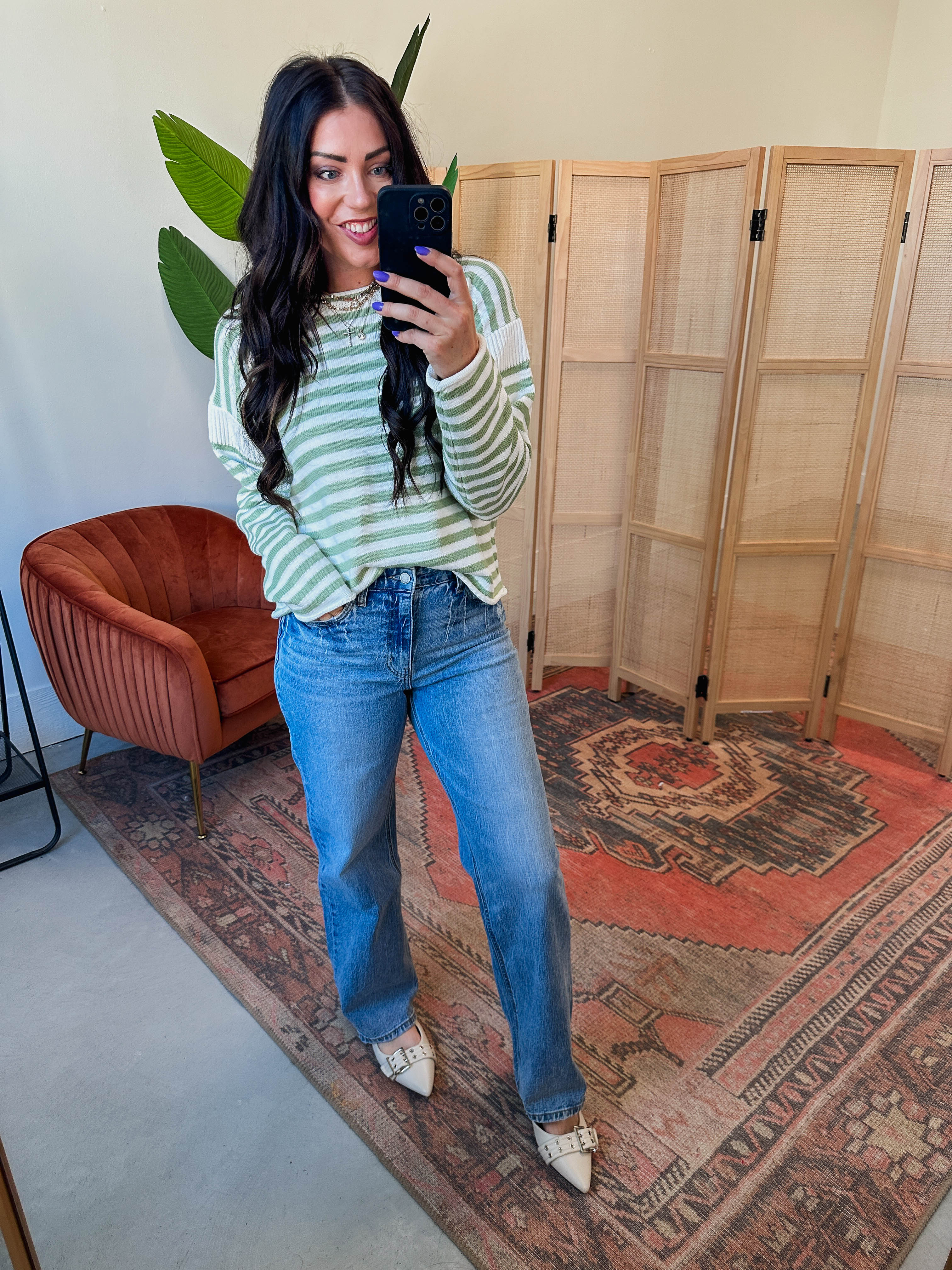 Stay cozy and cute in the Lainey Striped Sweater. Featuring a playful green stripe pattern, a comfy pullover fit, and raw hem details, it’s perfect for workdays or weekend chill sessions. Easy to style, soft to wear!