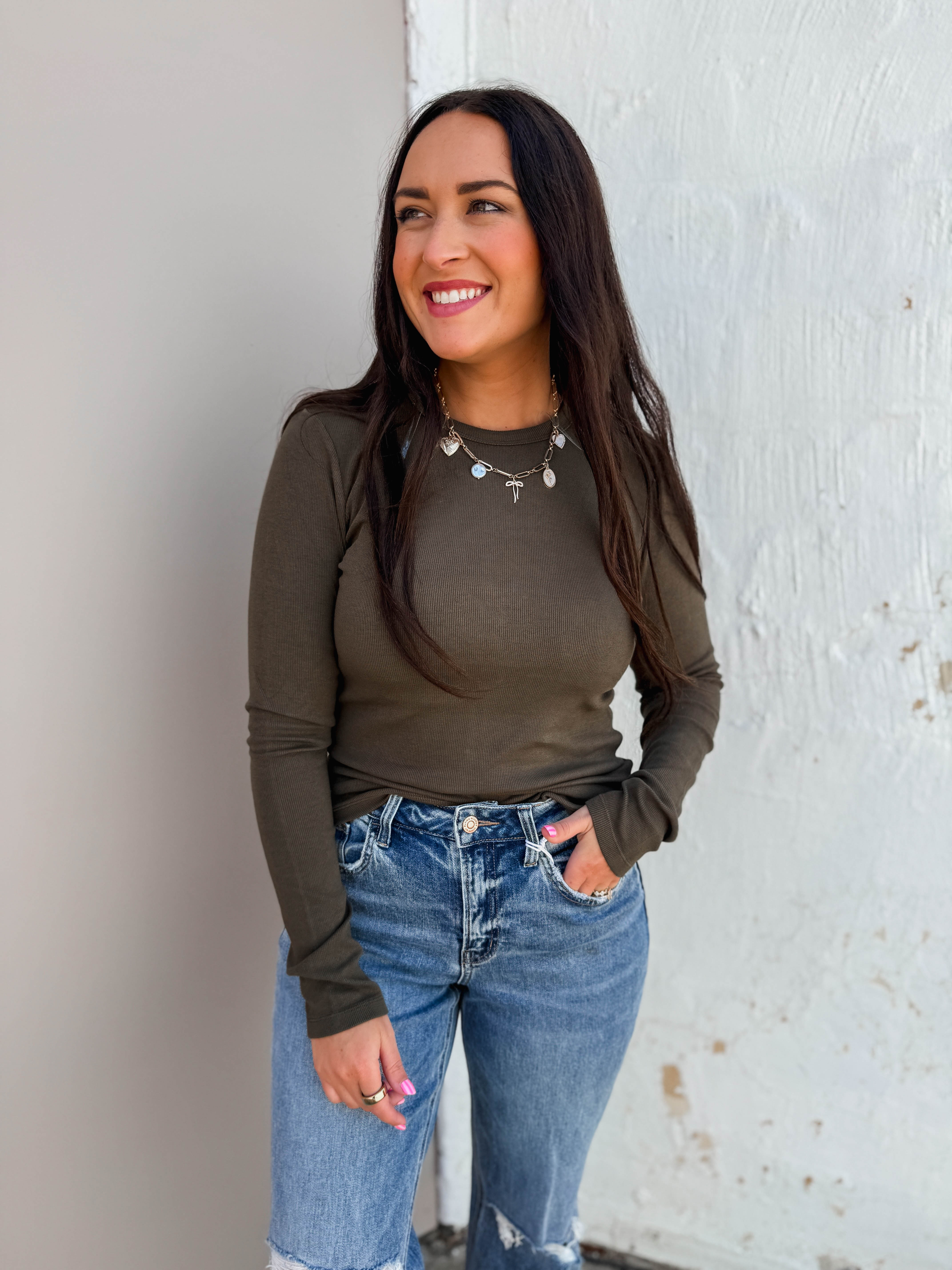 This Lea Long Sleeve Top in Olive features a cozy crew neckline and fitted silhouette, perfect for layering from work to weekend. Garment dyed for a rich, unique color, its long sleeves make it a great fall staple you'll reach for again and again.