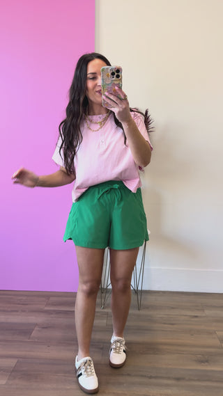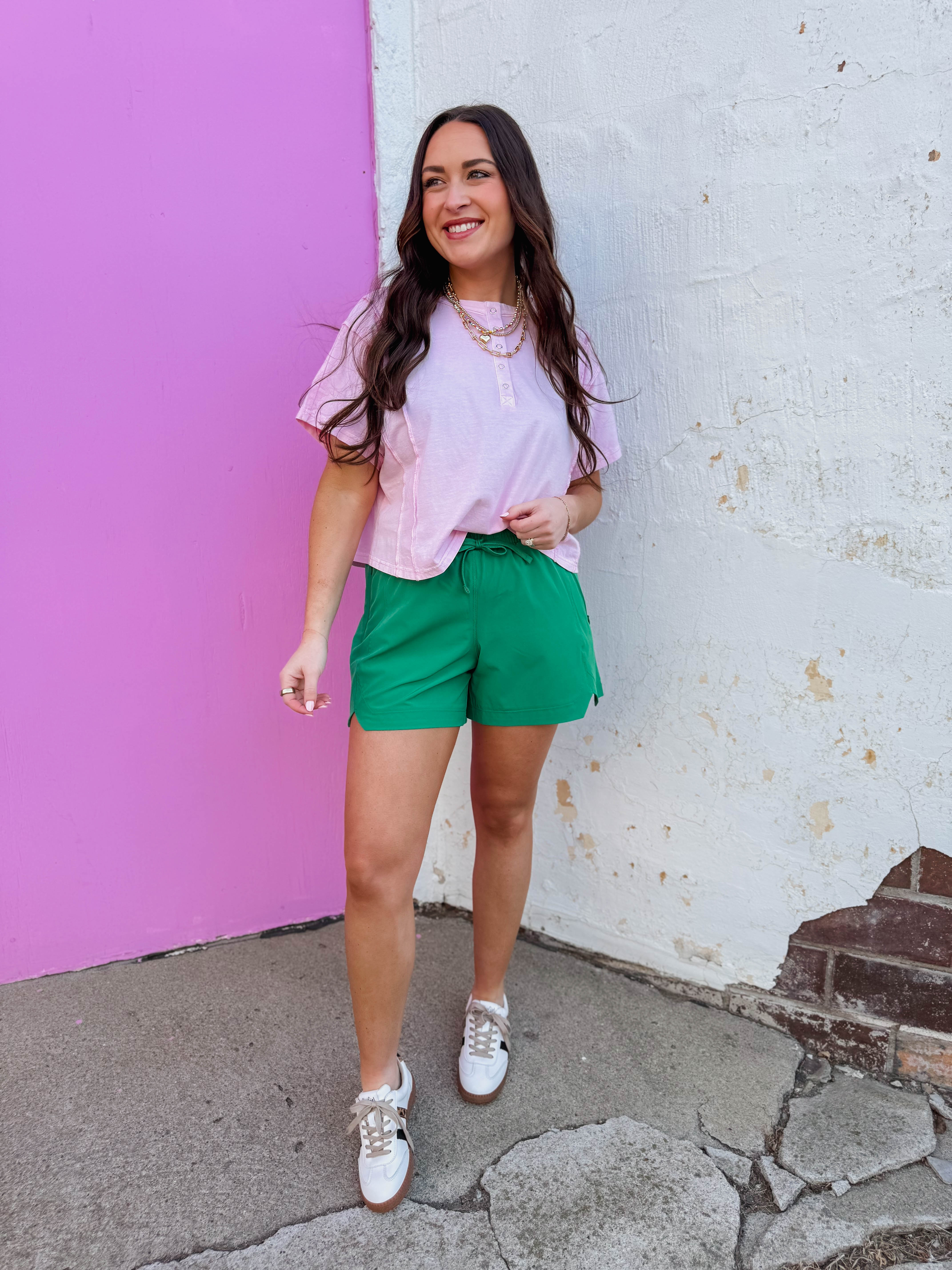 Move freely in the Macey Active Shorts, designed with a playful green hue and flattering V-shaped side slits. The elastic drawstring waistband ensures a secure fit while you stay active, and the lightweight, soft fabric keeps you comfortable all day long. Perfect for workouts, errands, or casual wear.