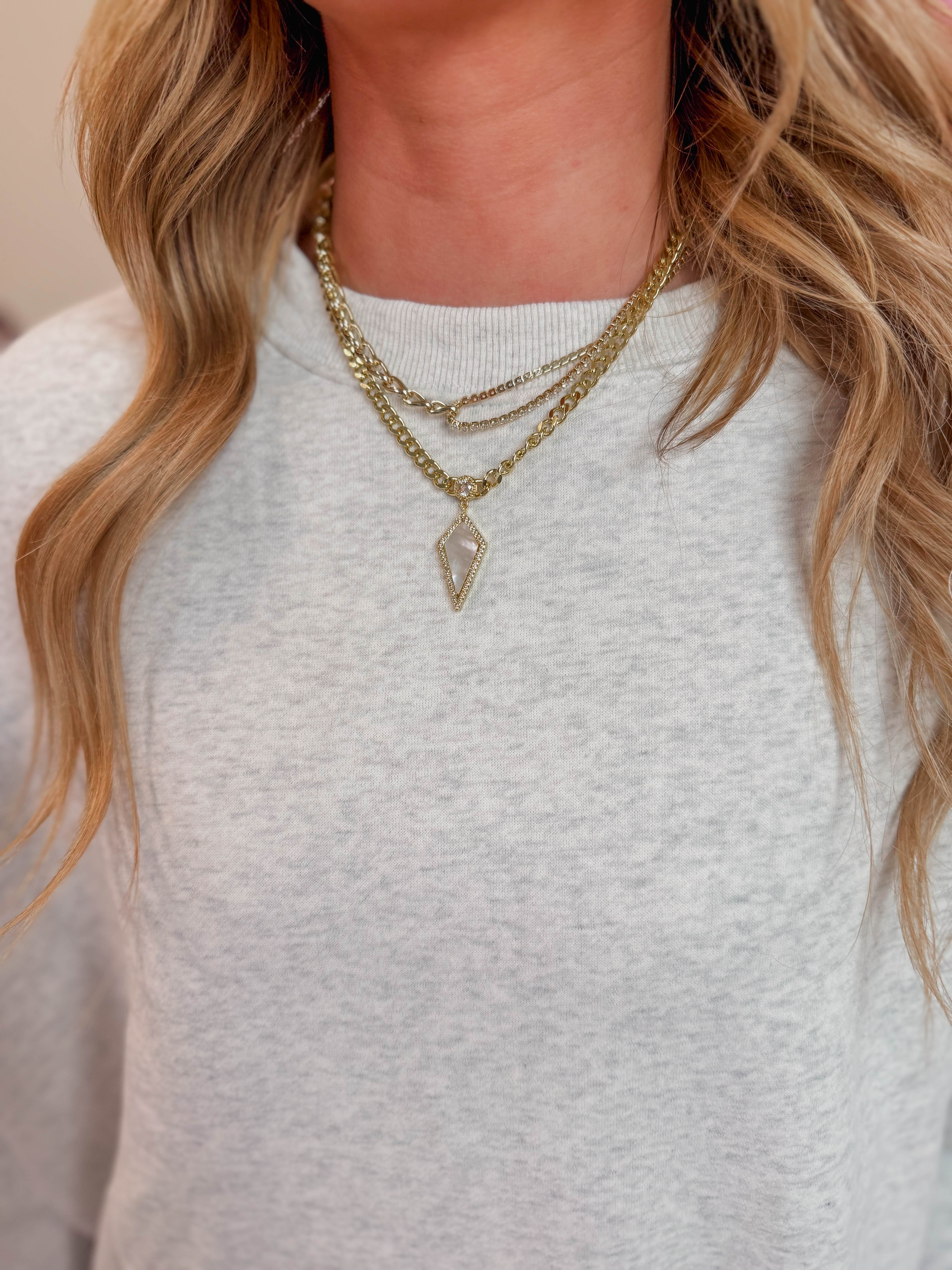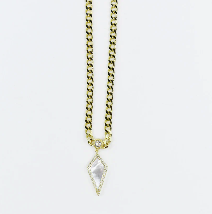 Bold meets brilliance. Featuring a chunky gold link chain with a stunning geometric pendant framed in pave sparkle. This piece captures the perfect mix of modern edge and timeless elegance. Effortless statement piece from day to night. 17 inches + 2 inches extender