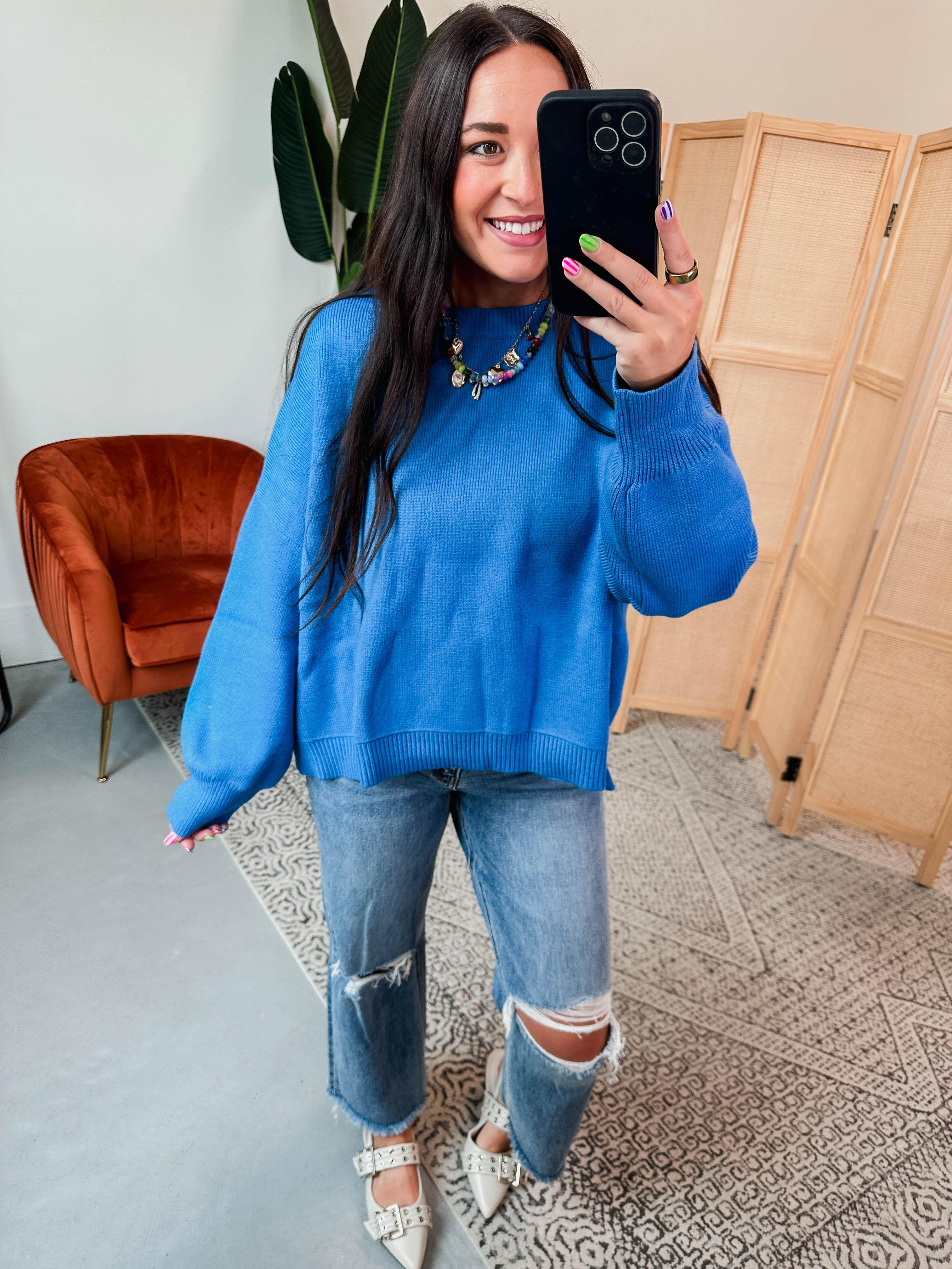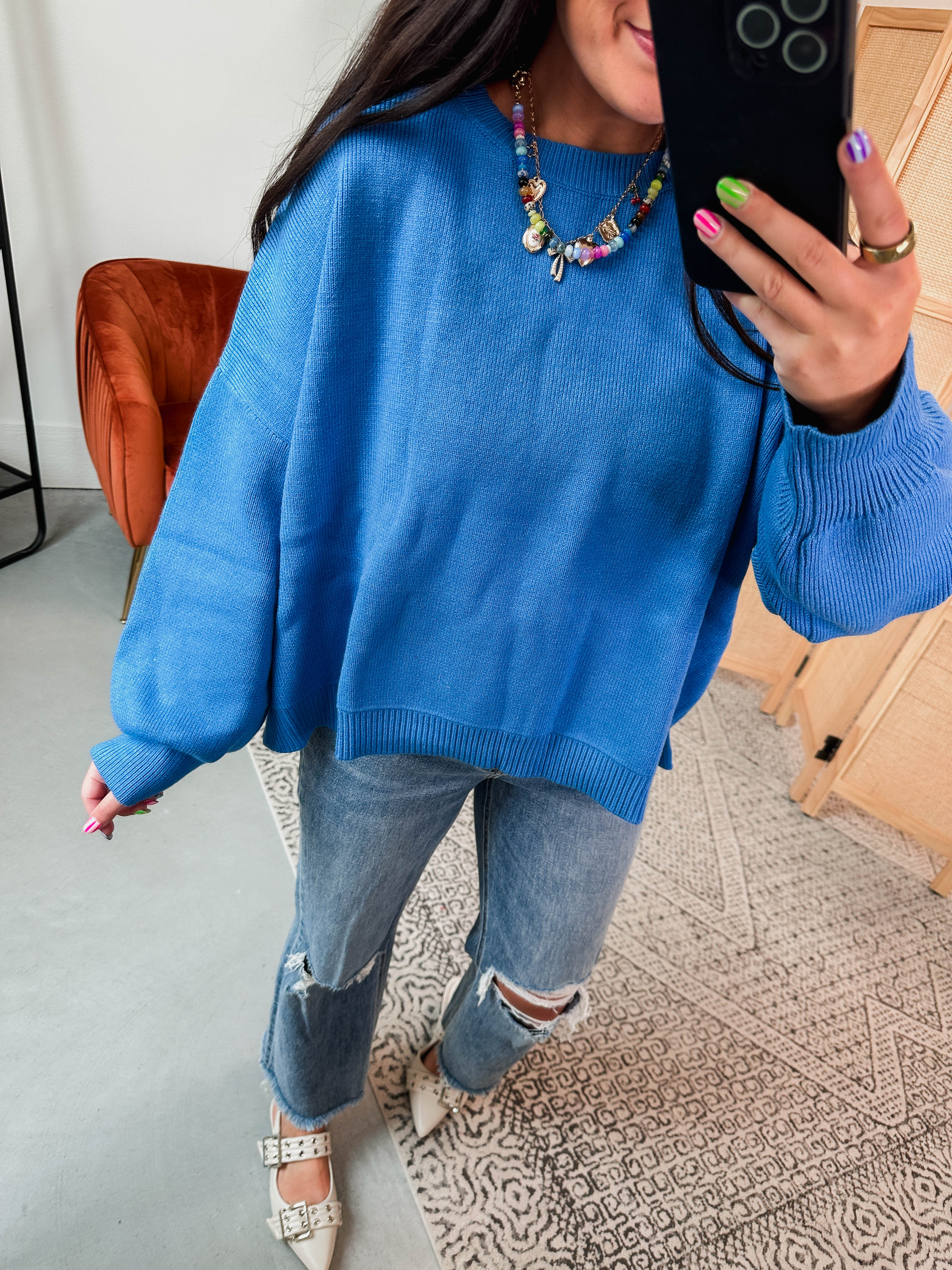 Cozy up in the Nellie Sweater in Blue! With its oversized fit, drop shoulders, and ribbed hems, this crew neck pullover is your go-to for work or weekend fun. Long sleeves keep you warm while staying effortlessly stylish. A perfect staple for any wardrobe!