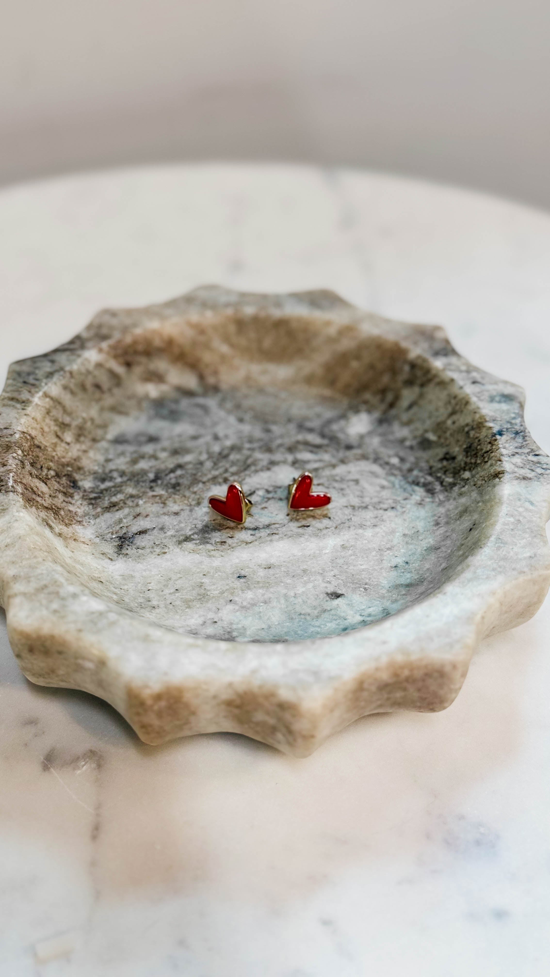 The Red Coral Sweetheart Studs features our signature heart shape, inspired by our patented Sweetheart statement earrings. These delicate stud earrings features a blue stone with gold detailing.
