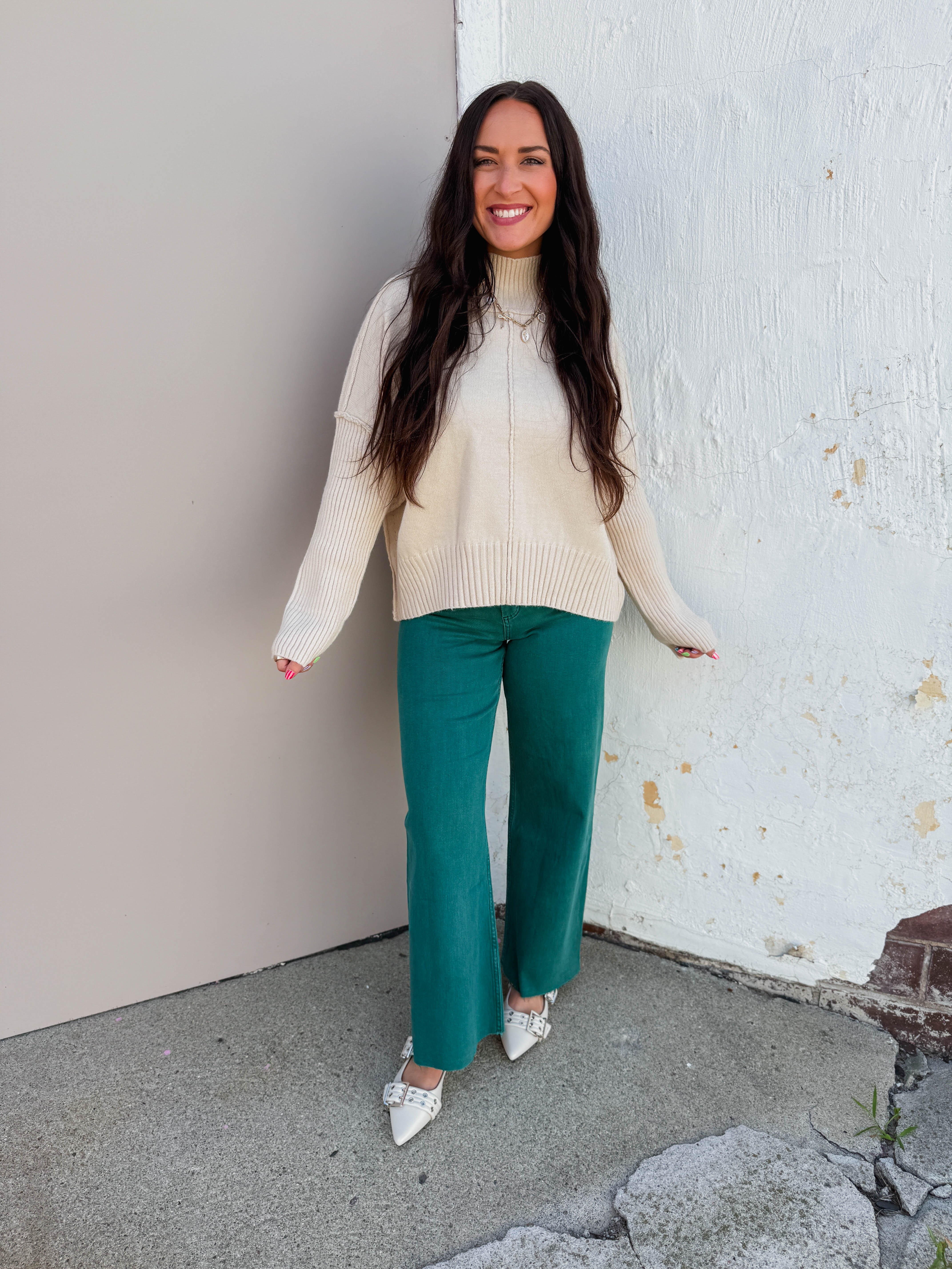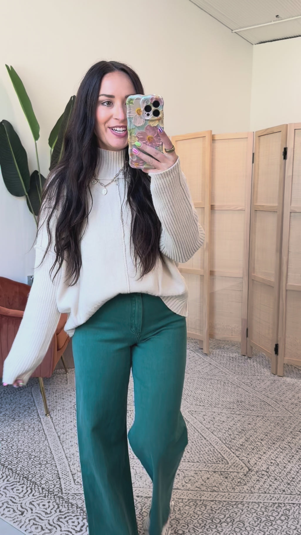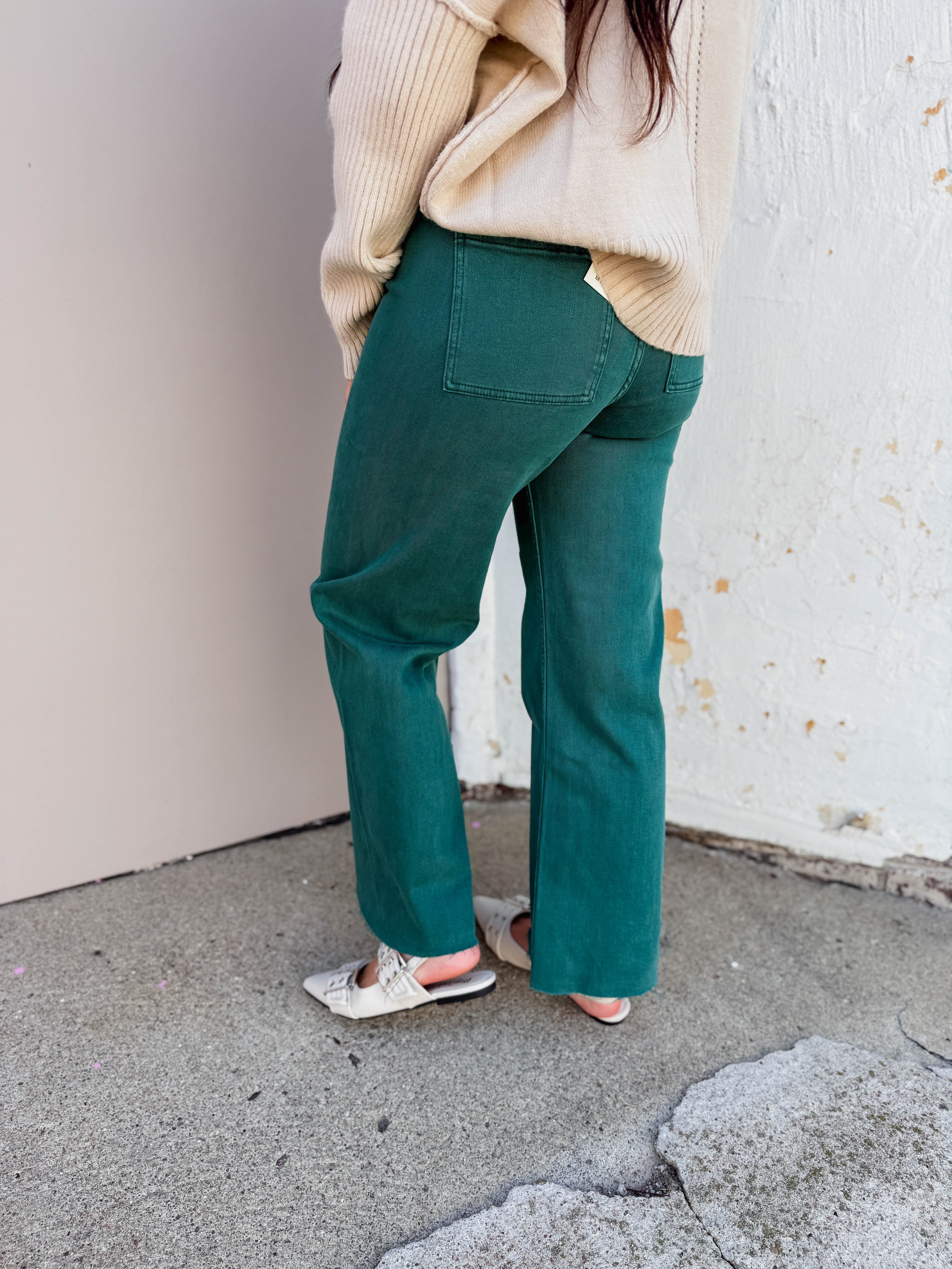 These Rylin Wide Leg Pants in Green bring a cool, washed denim vibe with a high waist and straight wide leg cut. Featuring belt loops, zip fly, button closure, and handy back pockets, they’re perfect for work or weekend fun. Dress them up or down with ease!