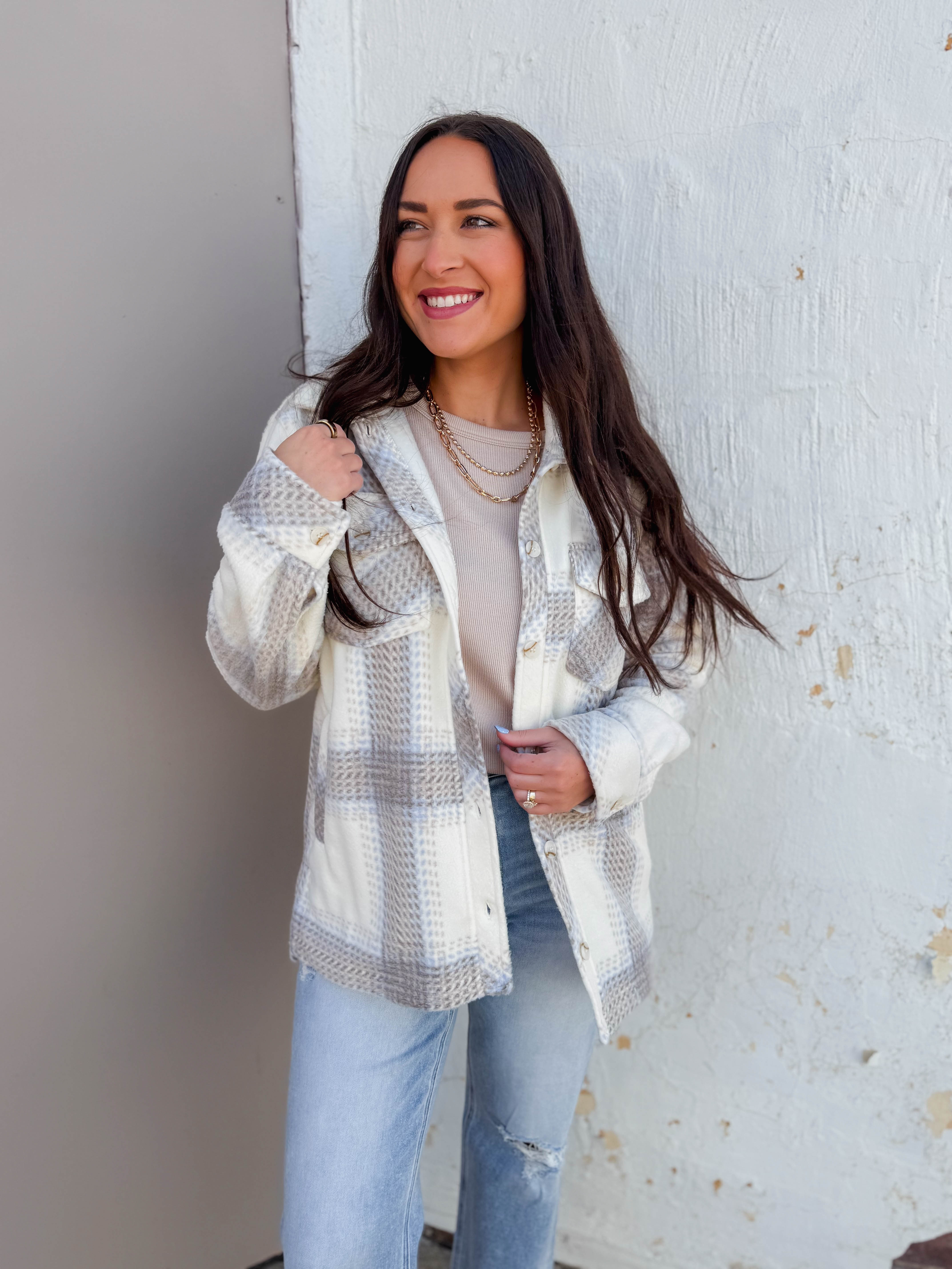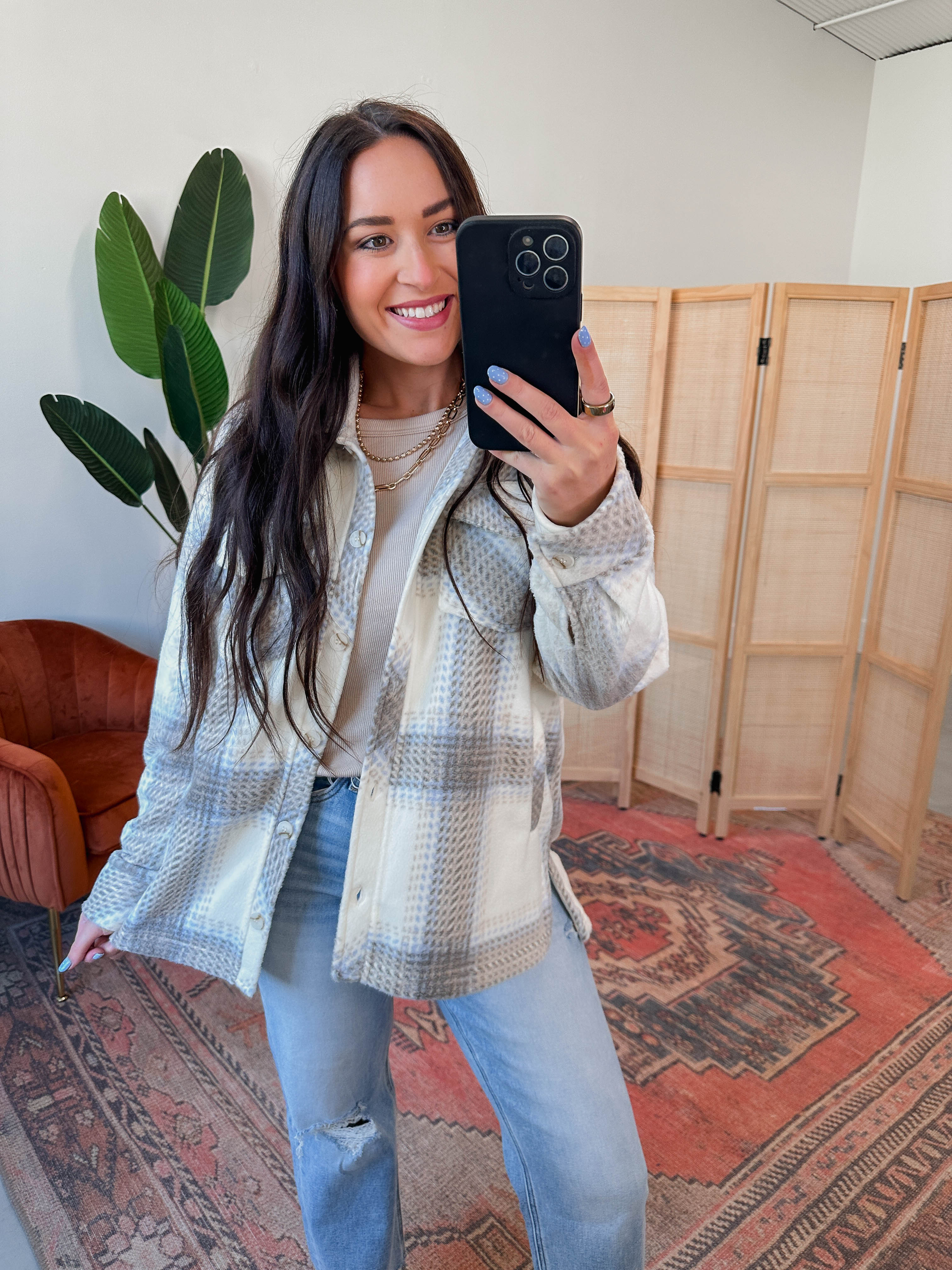 This Santa Fe Jacket in Tofu Ash Plaid is your new cozy crush! With a soft fleece shacket feel, button front, and collared neckline, it’s perfect for layering from work to weekend. Dual chest pockets add handy flair, making fall and winter outfits effortlessly cute and comfy.