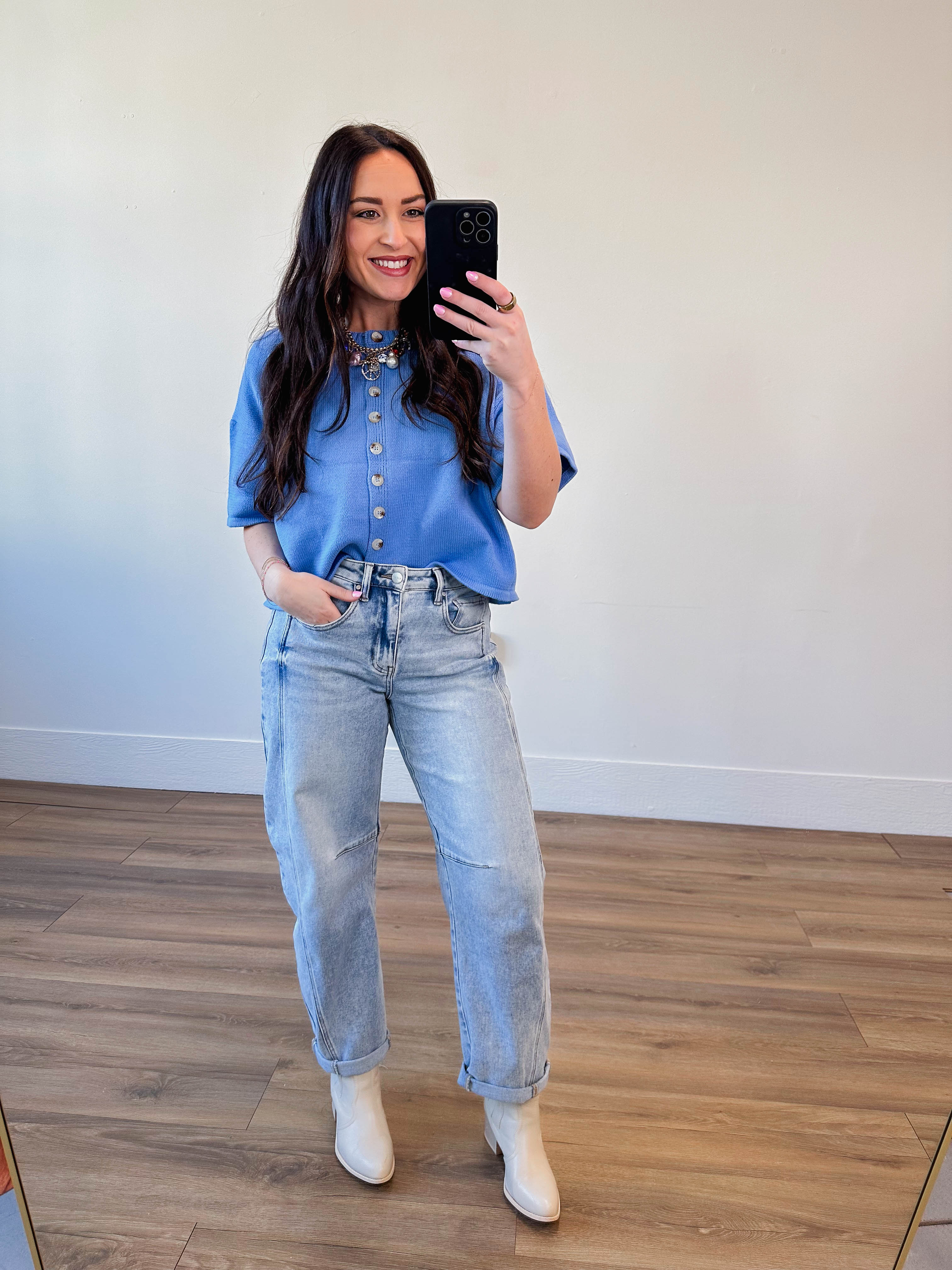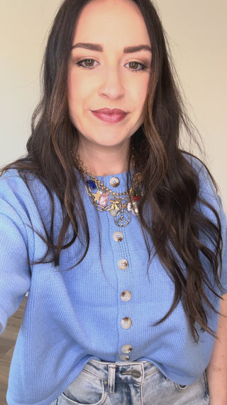 Meet your new go-to! This cozy knit top rocks a crew neckline and short sleeves for effortless style. The button-front closure and relaxed crop fit make it perfect for layering or wearing solo—dress it up for work or keep it casual for the weekend. Simple, versatile, and oh-so-wearable.