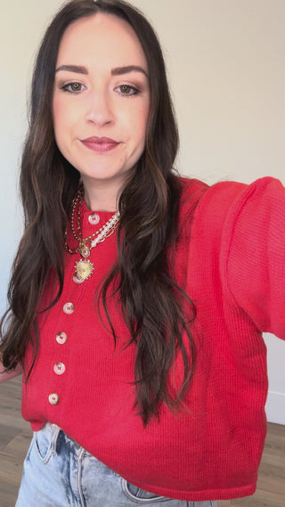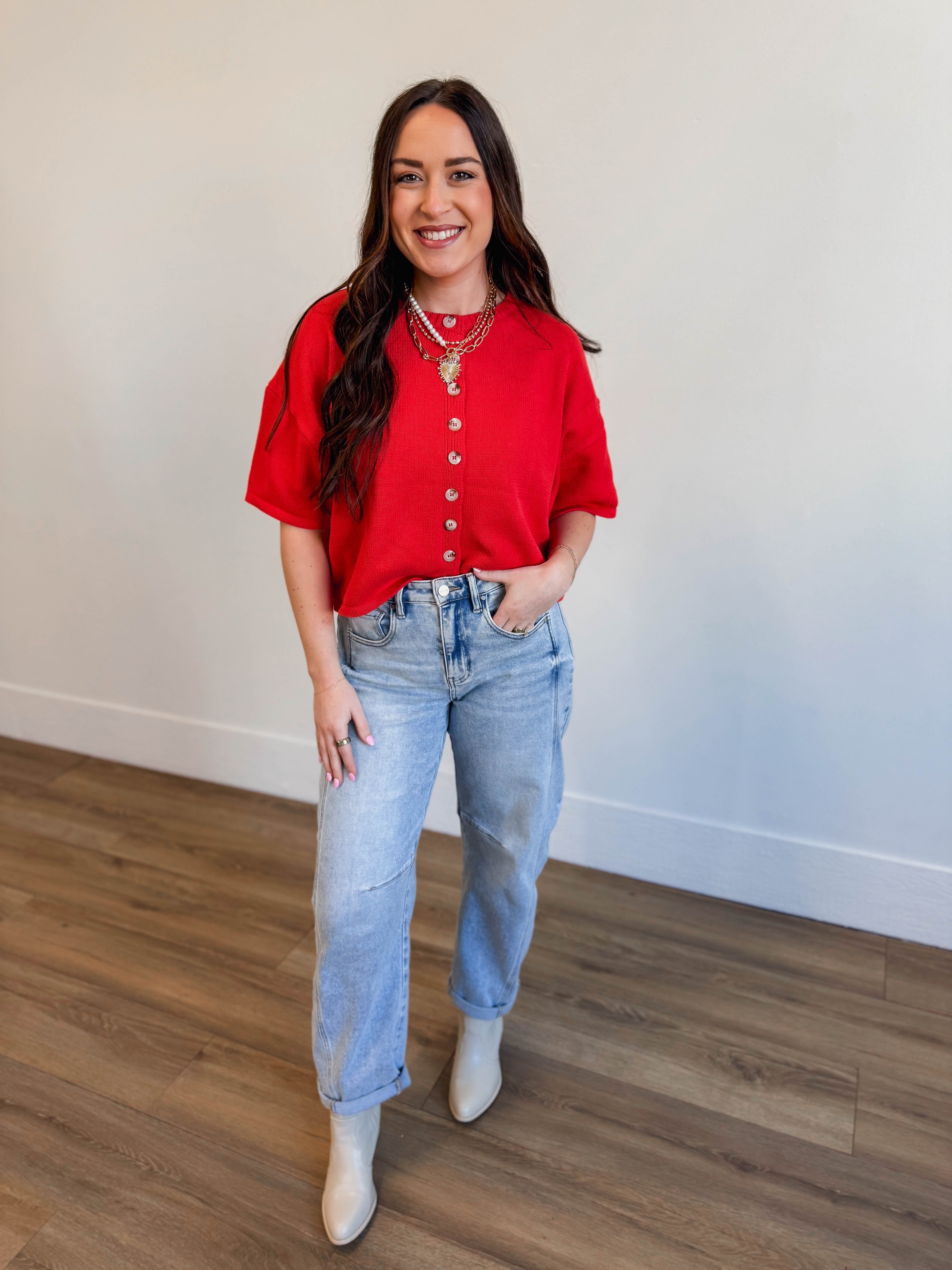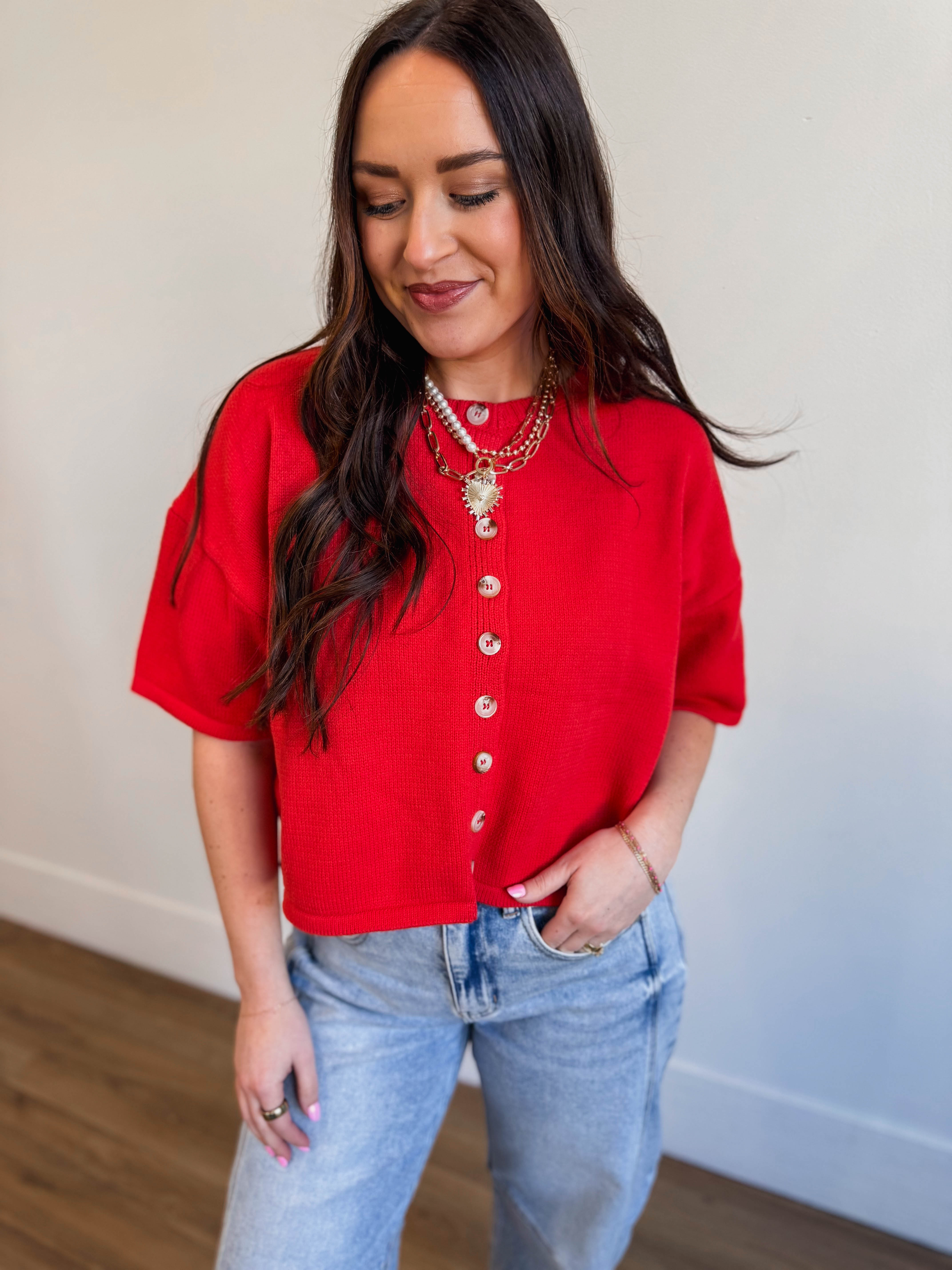 Meet your new go-to! This cozy knit top rocks a crew neckline and short sleeves for effortless style. The button-front closure and relaxed crop fit make it perfect for layering or wearing solo—dress it up for work or keep it casual for the weekend. Simple, versatile, and oh-so-wearable.