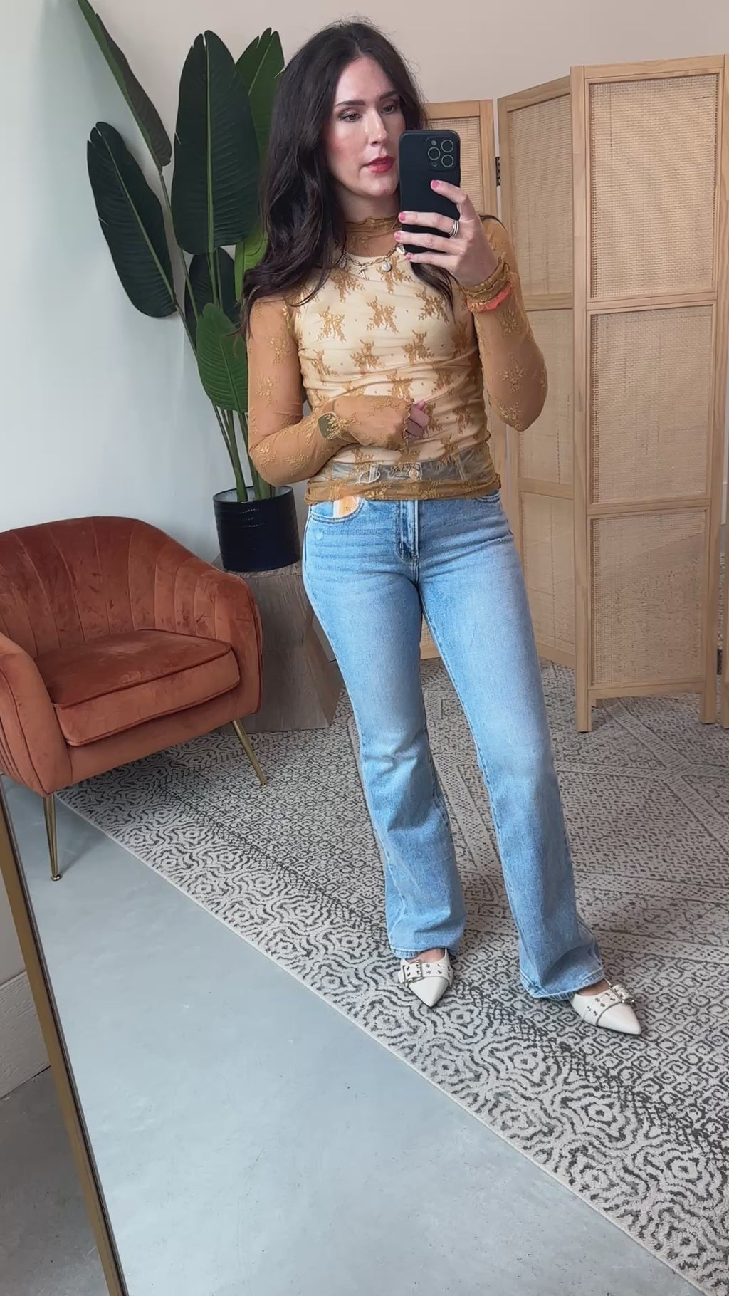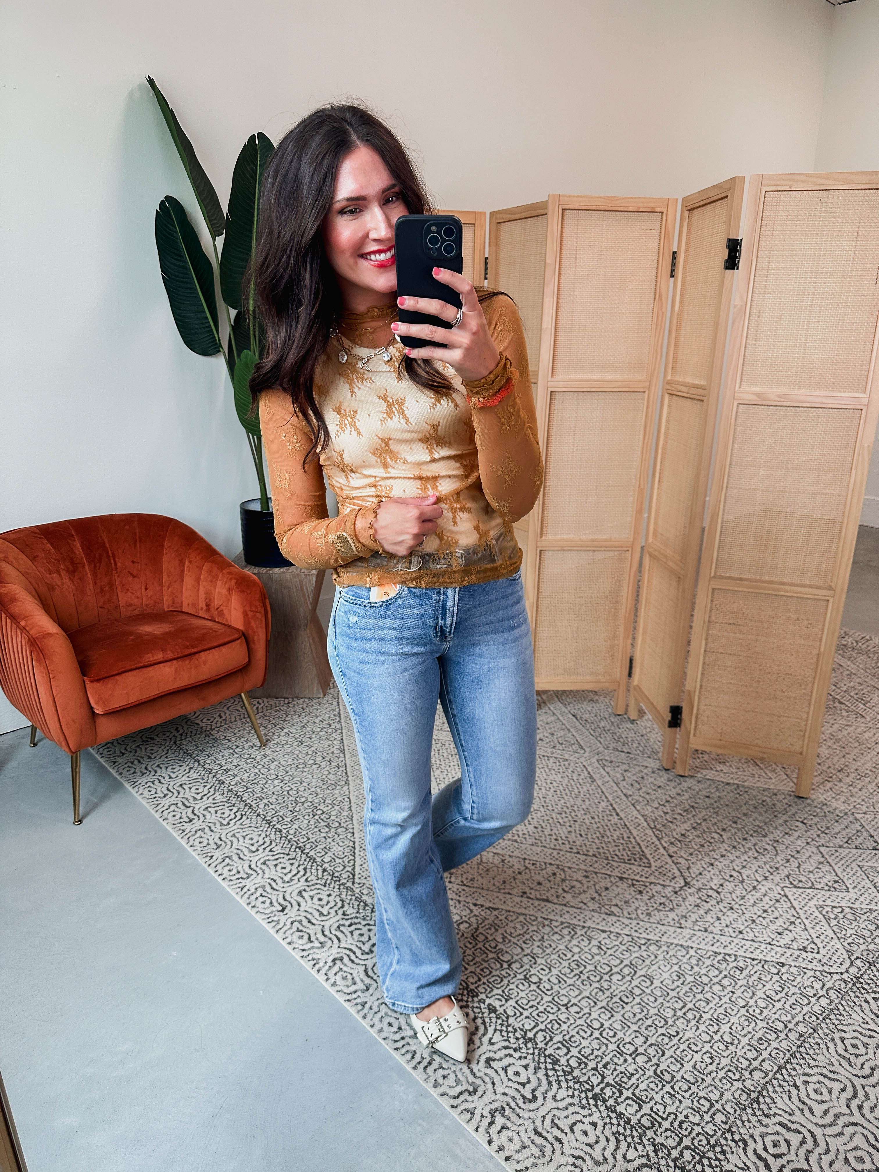 This Stevie Lace Top in mustard features a chic mock neckline and long sleeves with thumb holes for a fun twist. The delicate cabbage hems add a flirty touch, making it the perfect layering piece to brighten up your fall wardrobe.