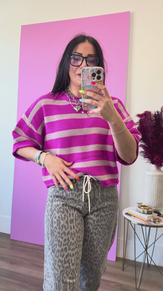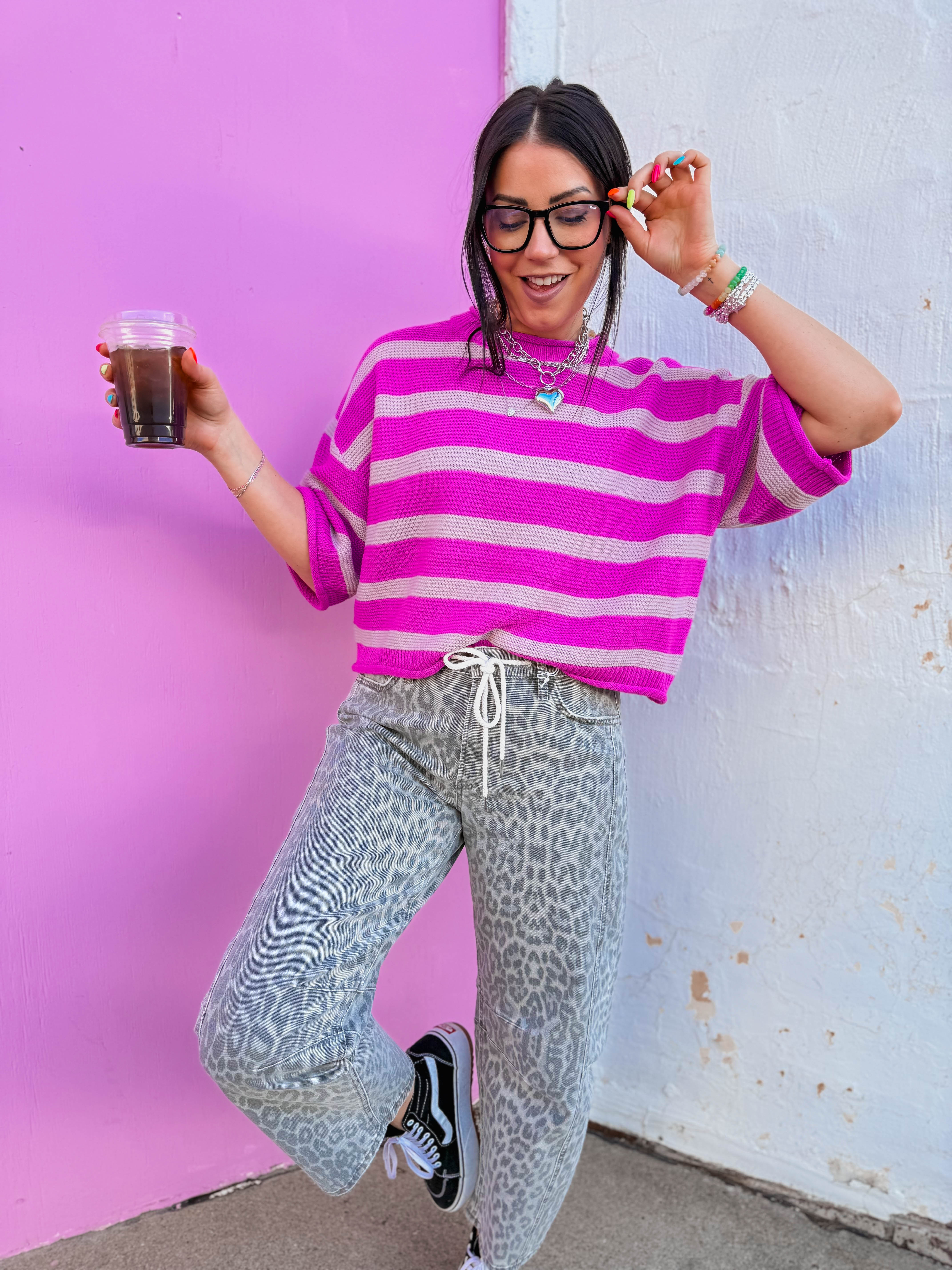 Effortless style meets versatile comfort in this pink striped pullover. The relaxed fit pairs beautifully with black denim for an elevated look, or dress it down with barrel jeans and sneakers for laid-back charm. A wardrobe essential that works as hard as you do.